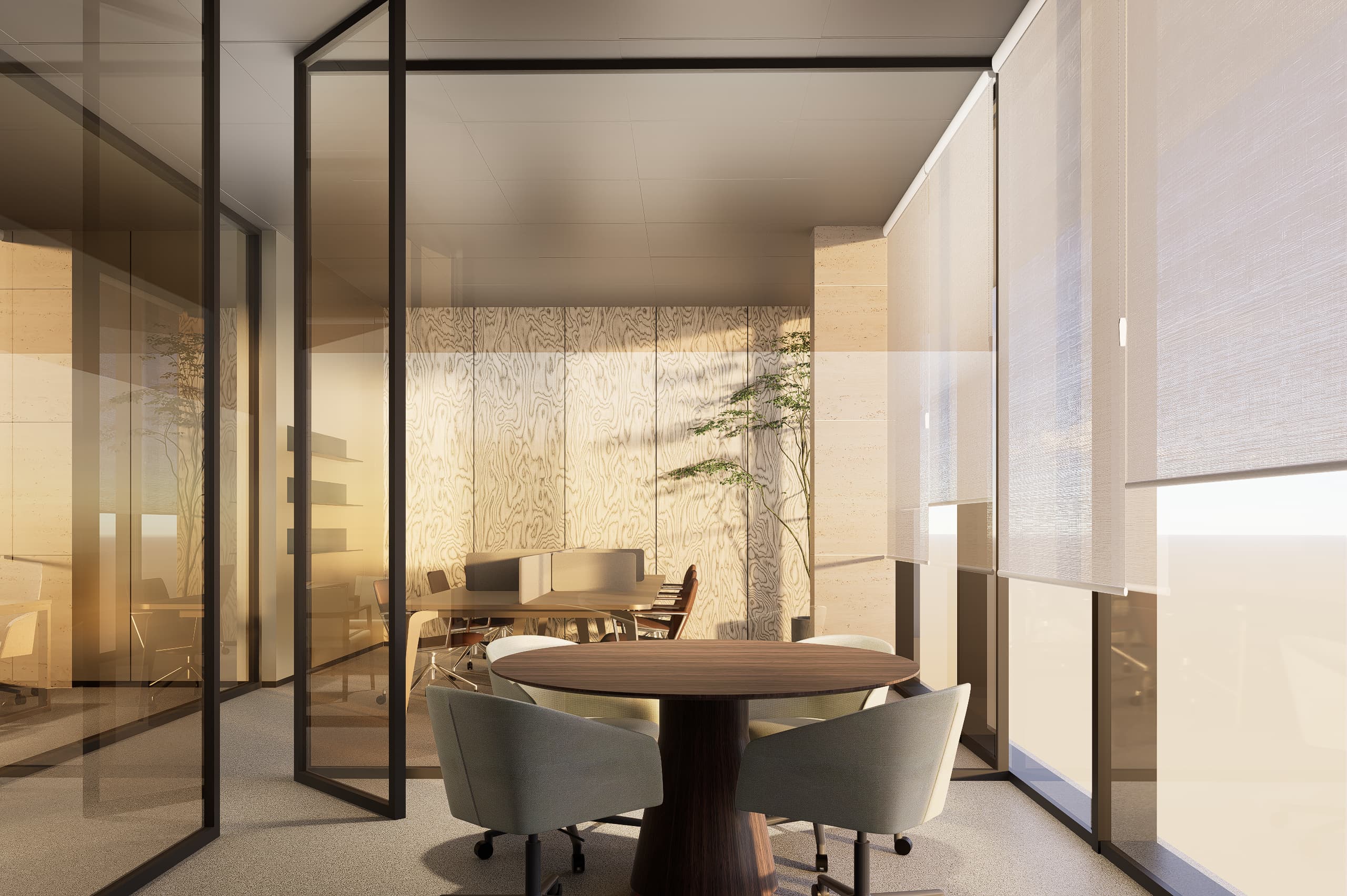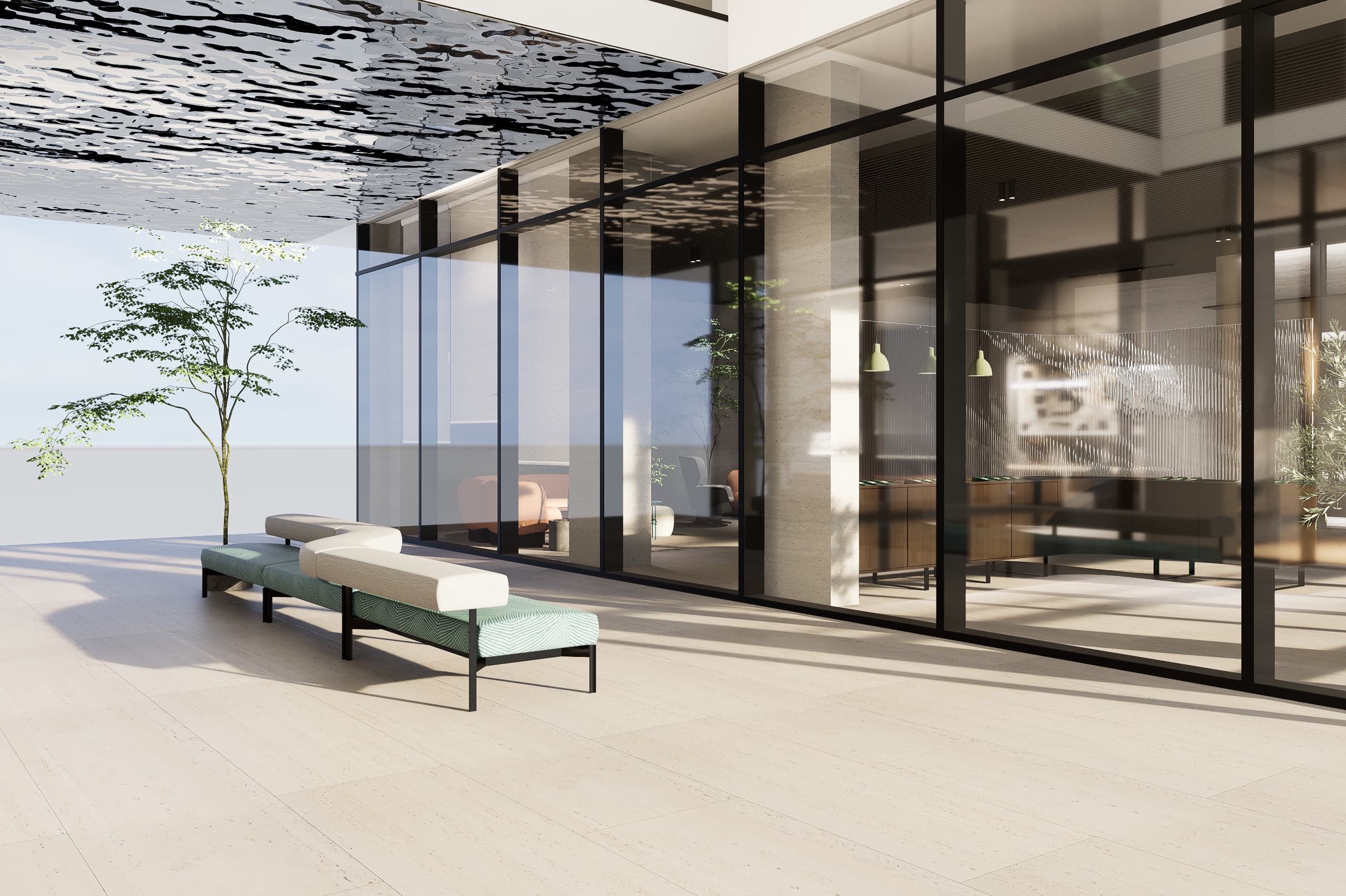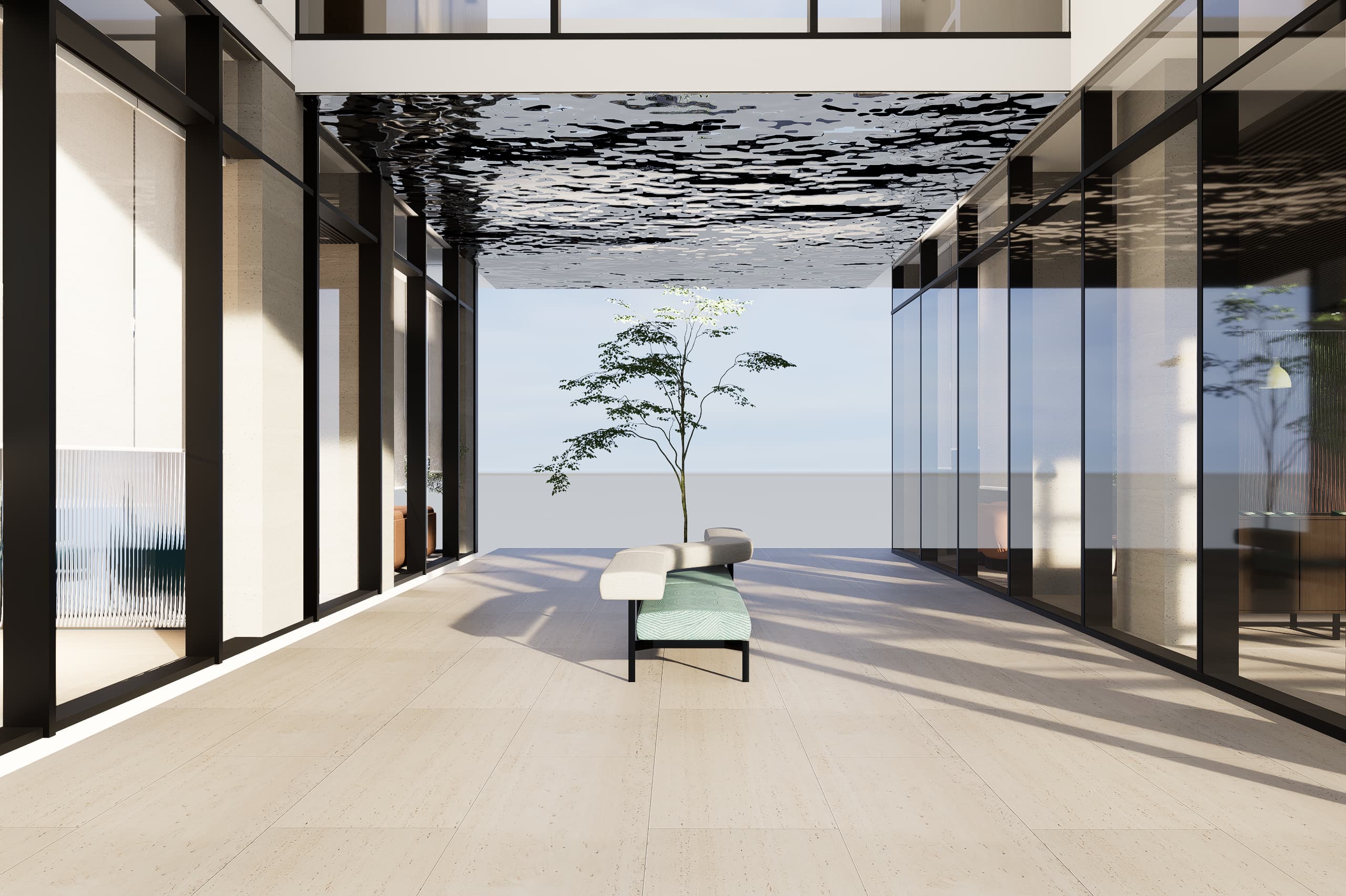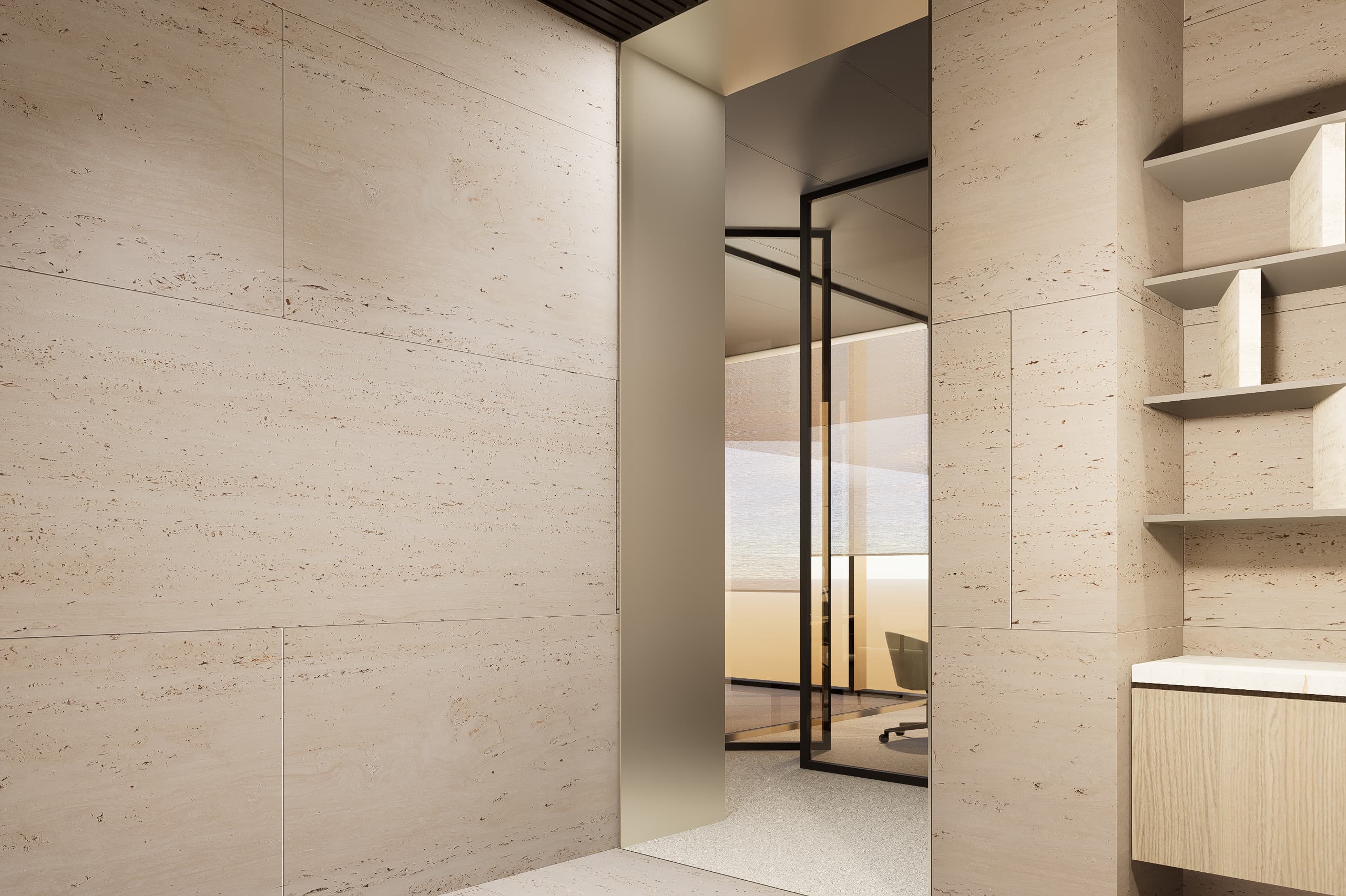 The architectural language emphasizes clarity, warmth, and material expression. A palette of glass, natural stone, and warm neutral finishes accented with subtle blue hues defines the interior atmosphere. Carefully framed stone clad walls and door openings create moments of visual depth and elegance, while transparent elements allow natural light to flow through the spaces, strengthening the connection between architecture, light, and user experience.