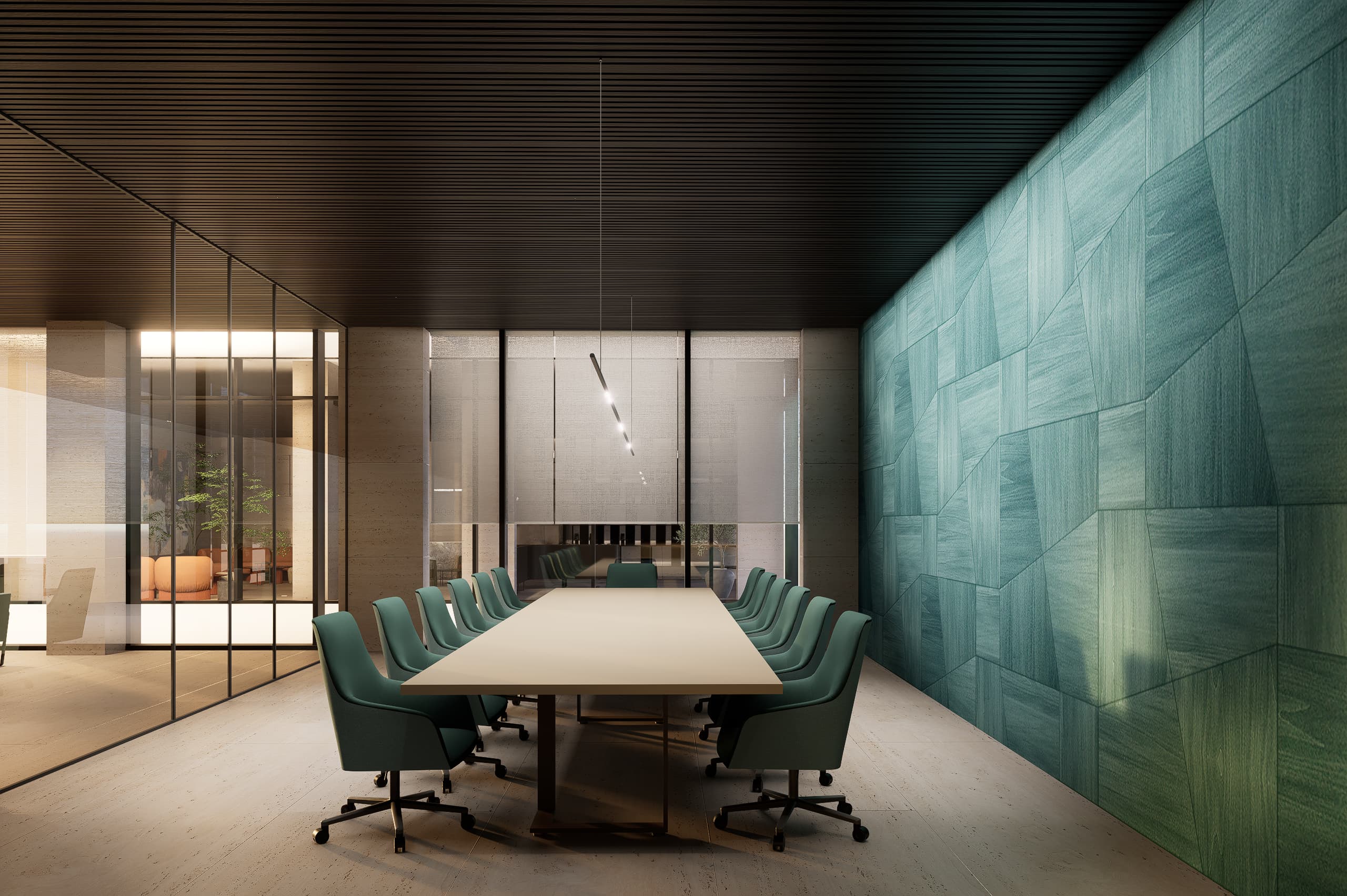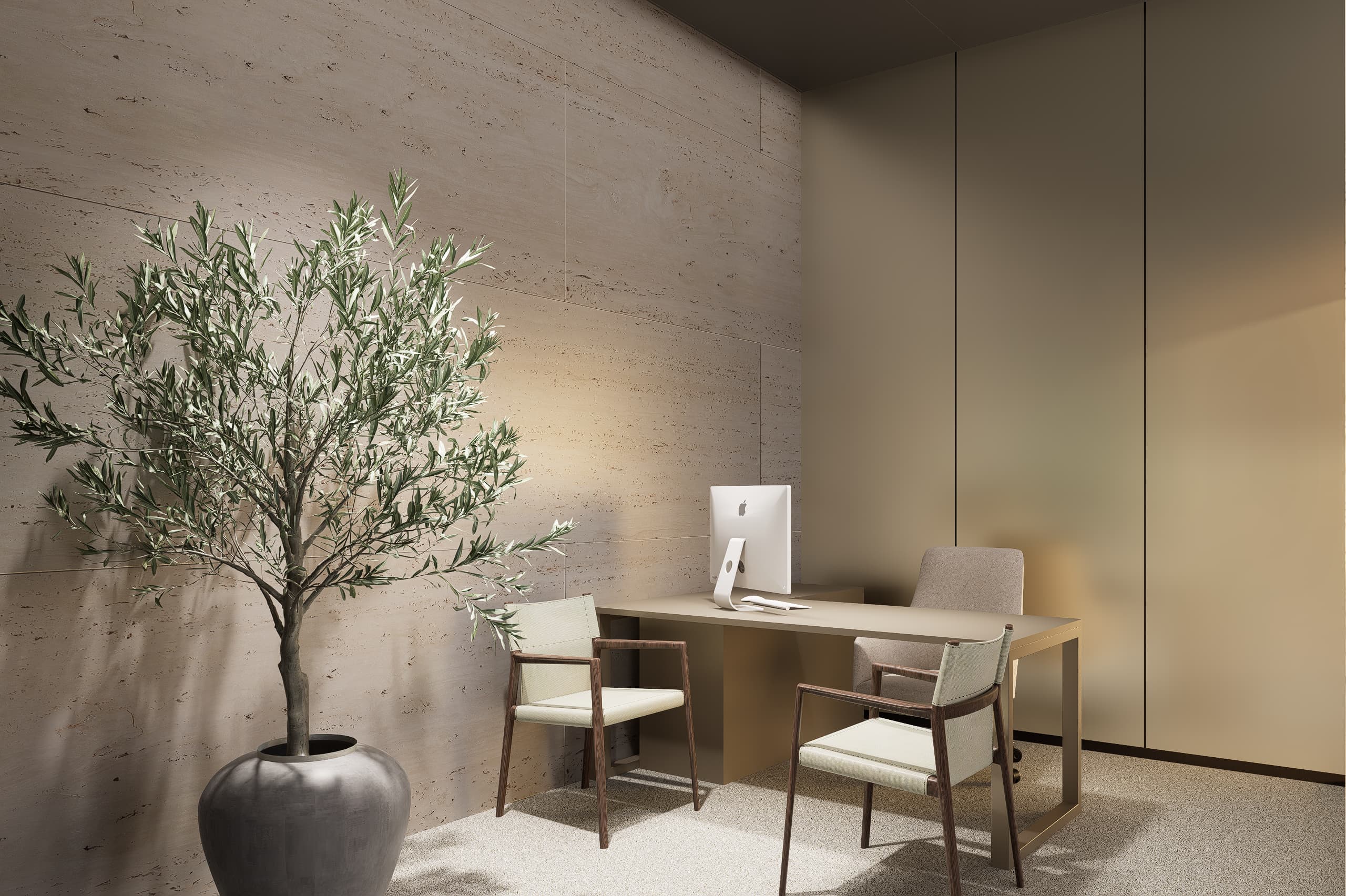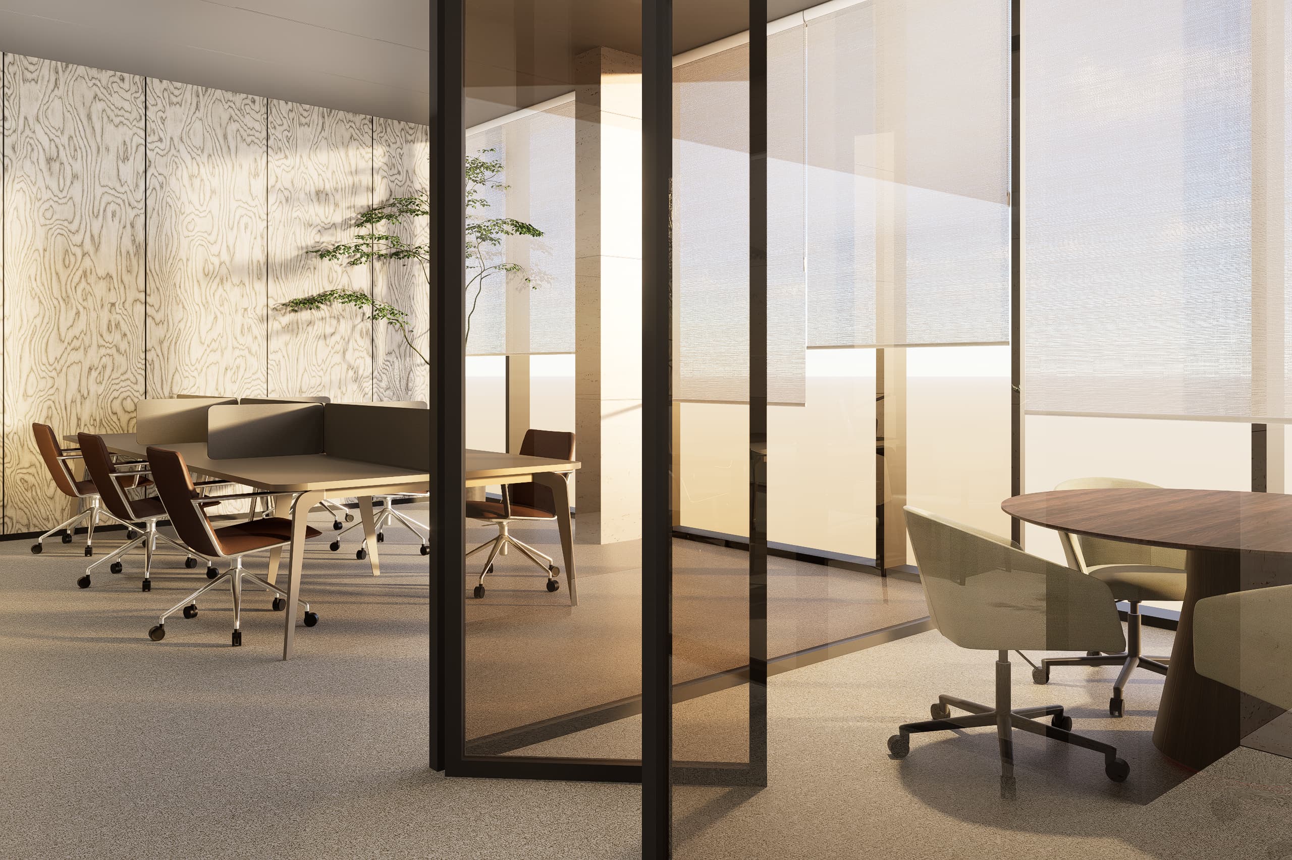 The architectural language emphasizes clarity, warmth, and material expression. A palette of glass, natural stone, and warm neutral finishes accented with subtle blue hues defines the interior atmosphere. Carefully framed stone clad walls and door openings create moments of visual depth and elegance, while transparent elements allow natural light to flow through the spaces, strengthening the connection between architecture, light, and user experience.