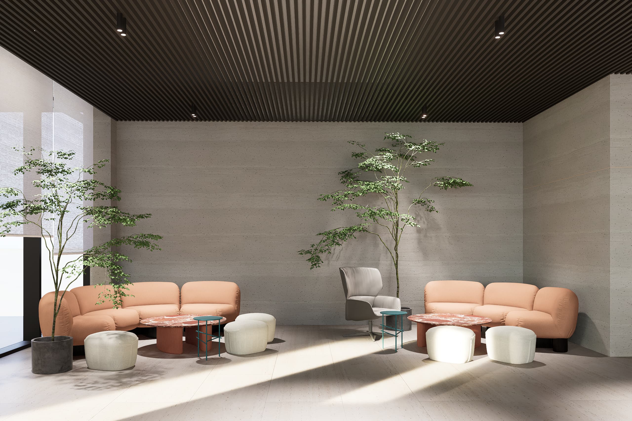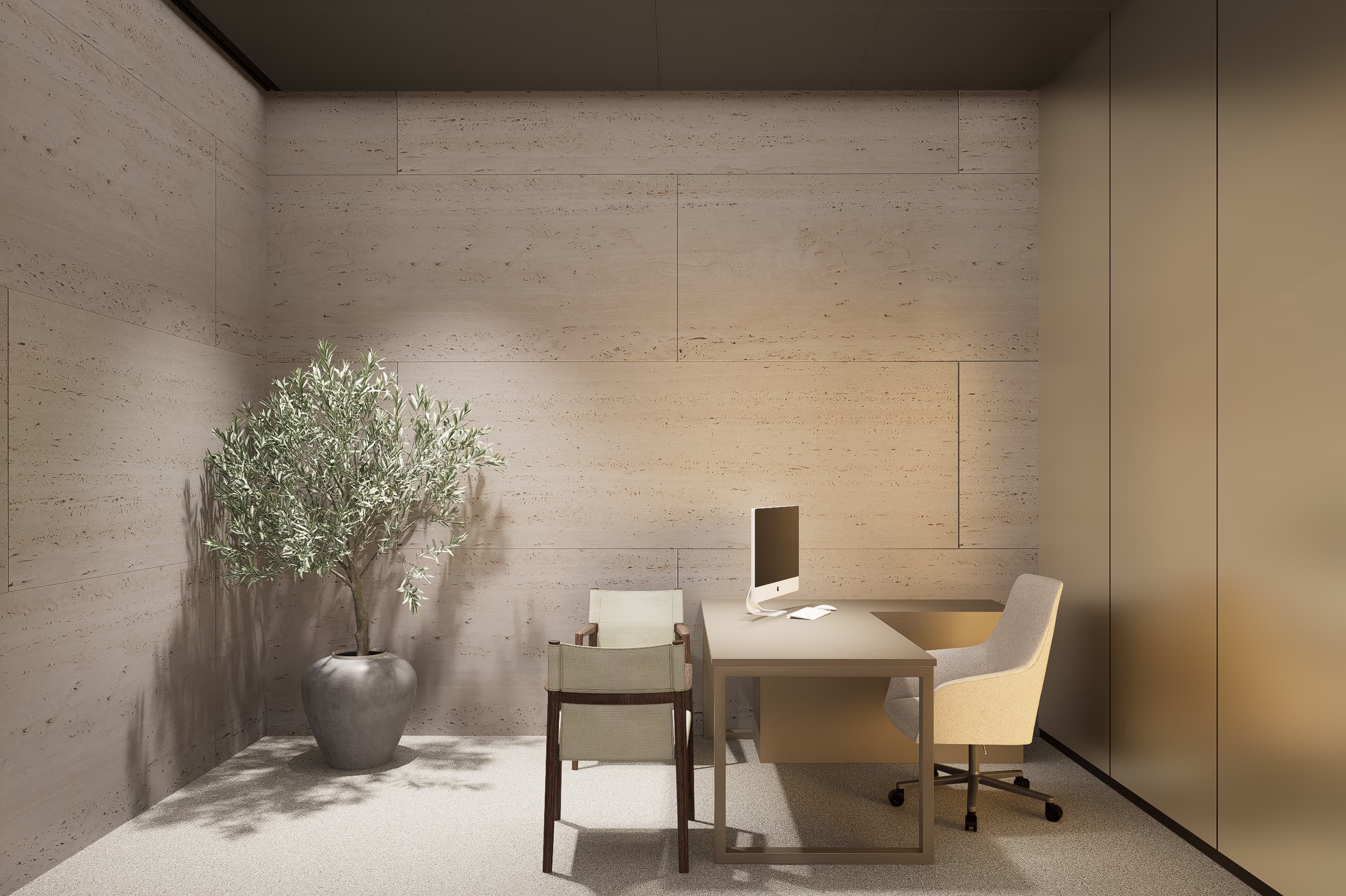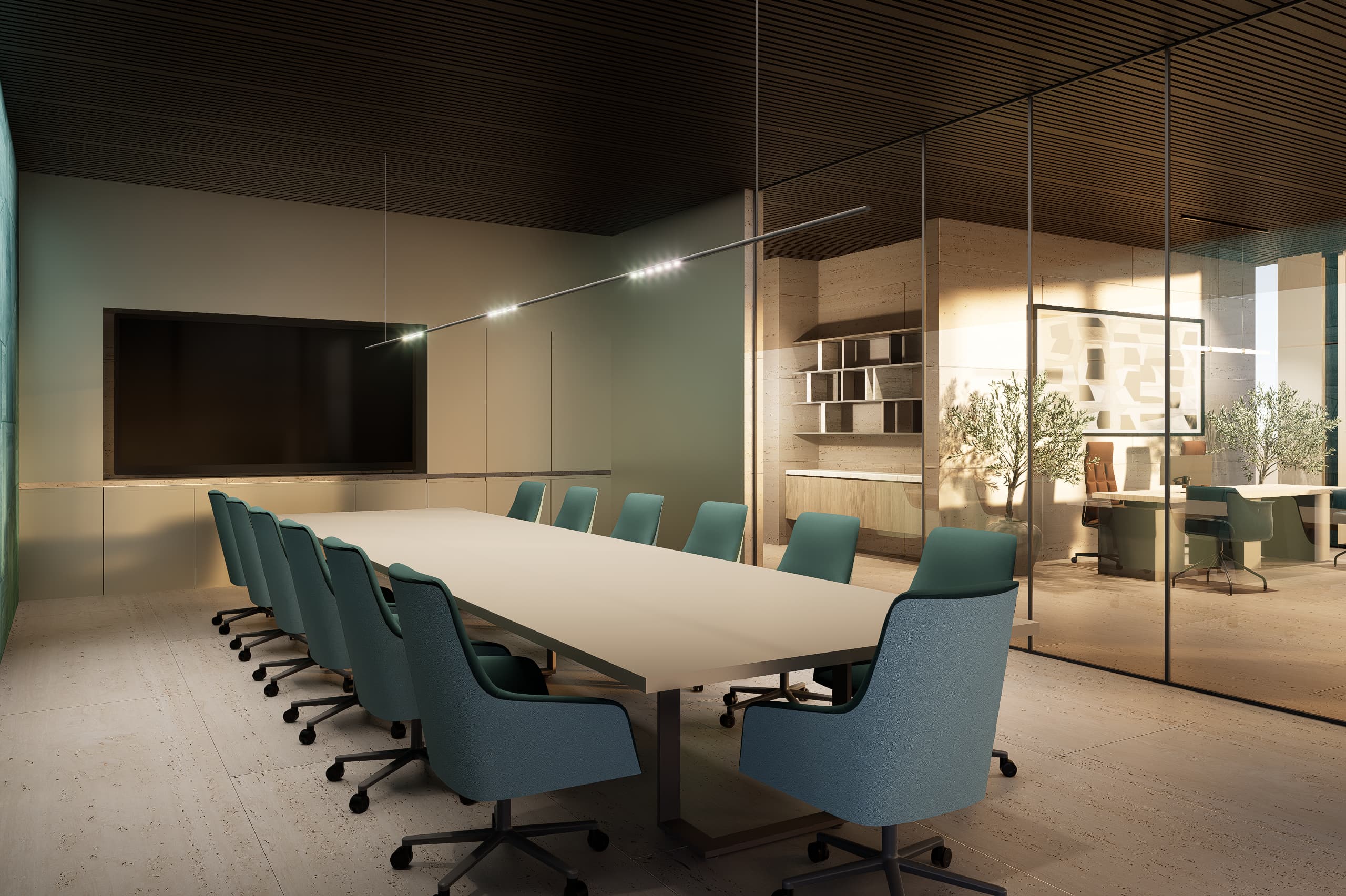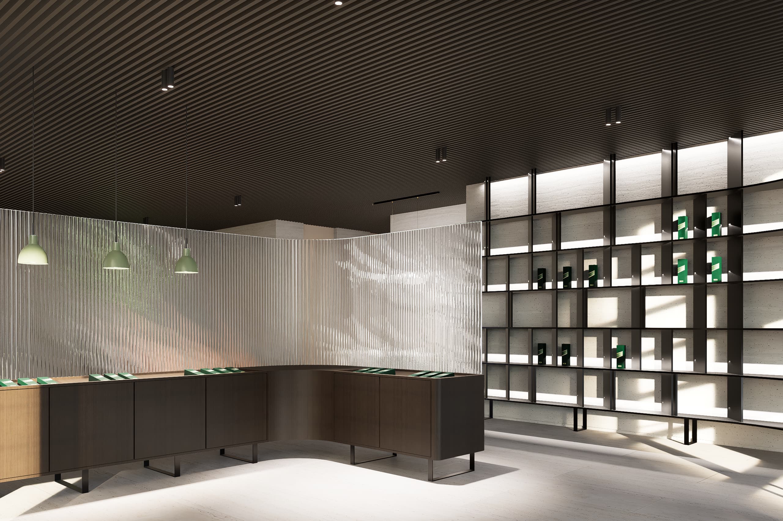 The architectural language emphasizes clarity, warmth, and material expression. A palette of glass, natural stone, and warm neutral finishes accented with subtle blue hues defines the interior atmosphere. Carefully framed stone clad walls and door openings create moments of visual depth and elegance, while transparent elements allow natural light to flow through the spaces, strengthening the connection between architecture, light, and user experience.