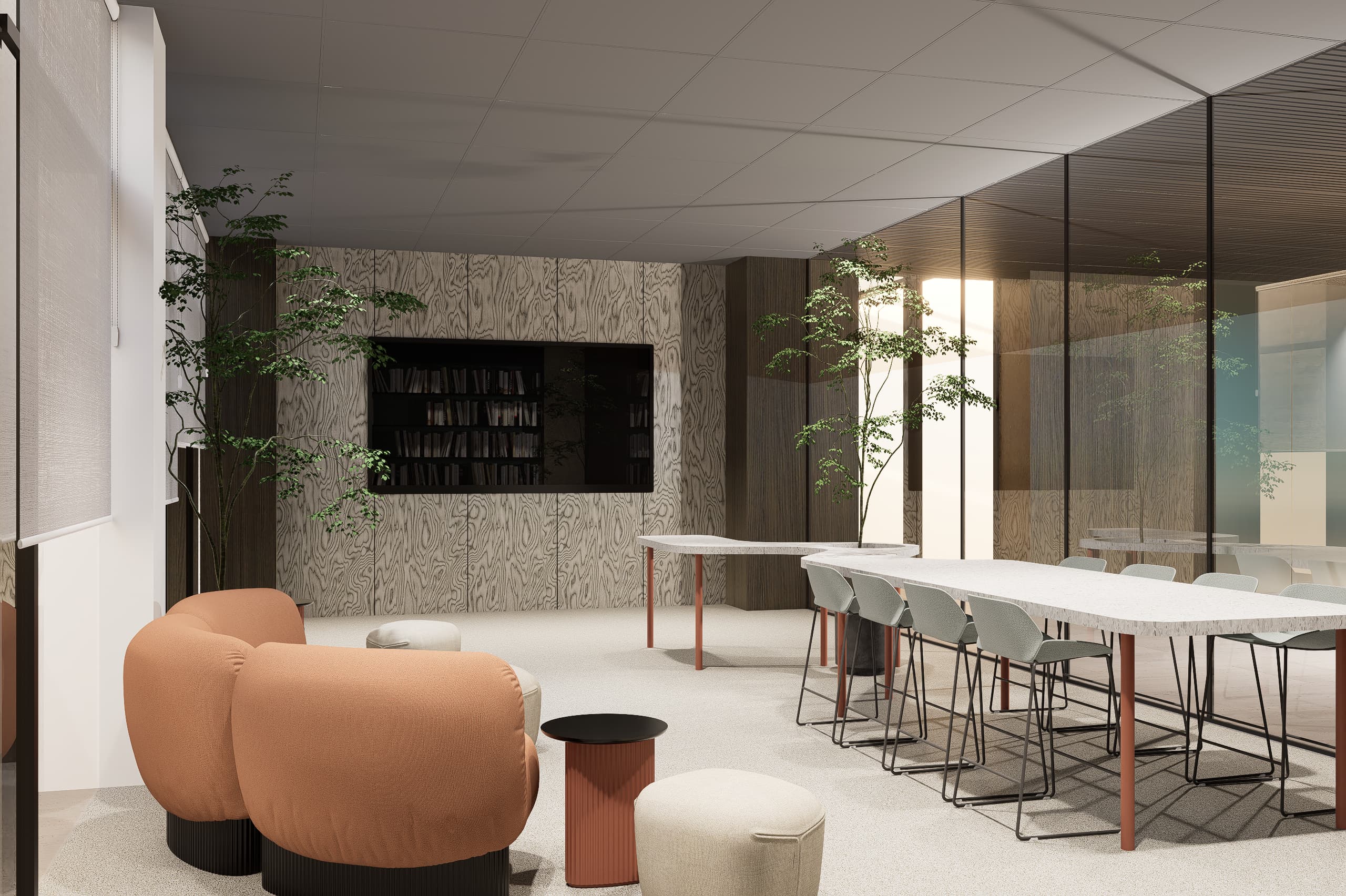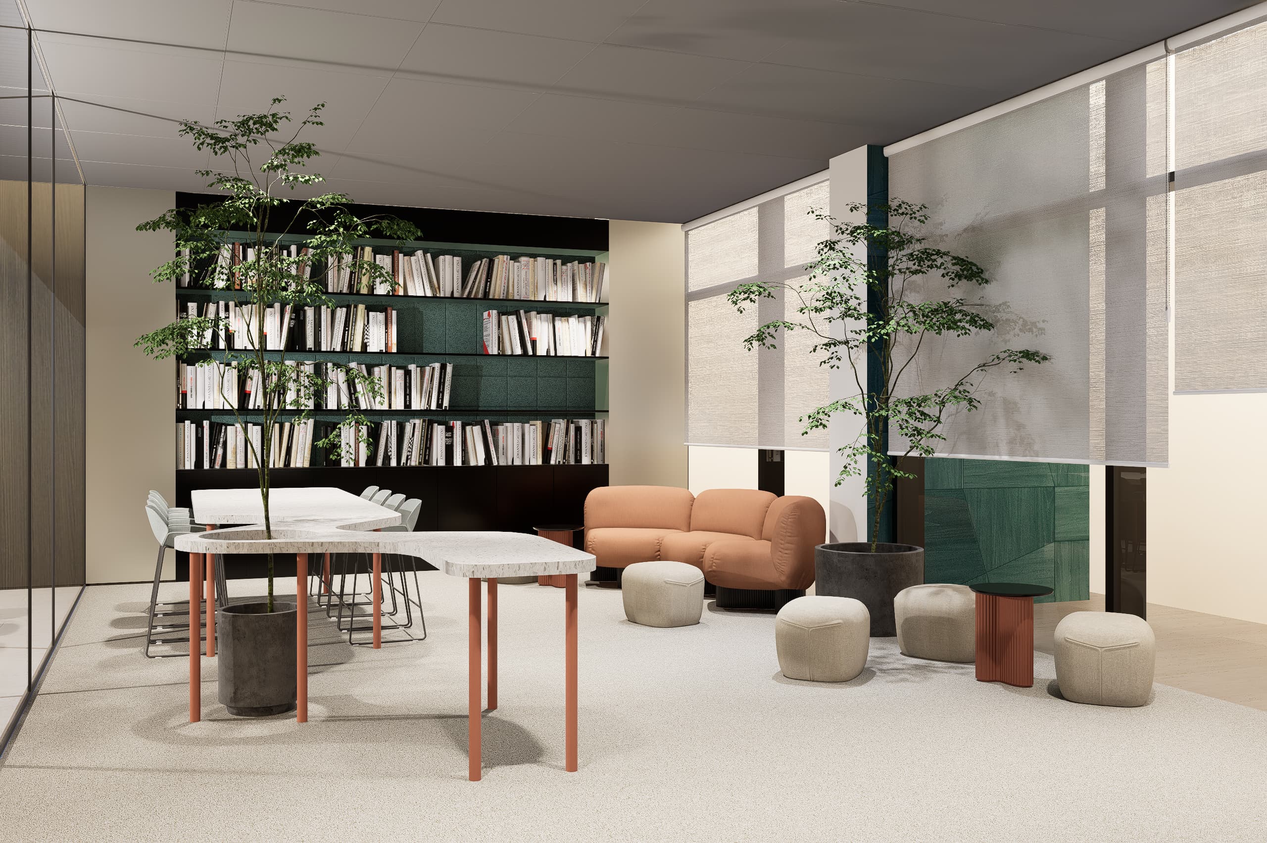 Complementing the workspaces are multiple library areas designed to provide quiet environments for research, reading, and focused work. These spaces encourage knowledge exchange and reflection, reinforcing the incubator’s role as a center for learning and innovation within the professional community.