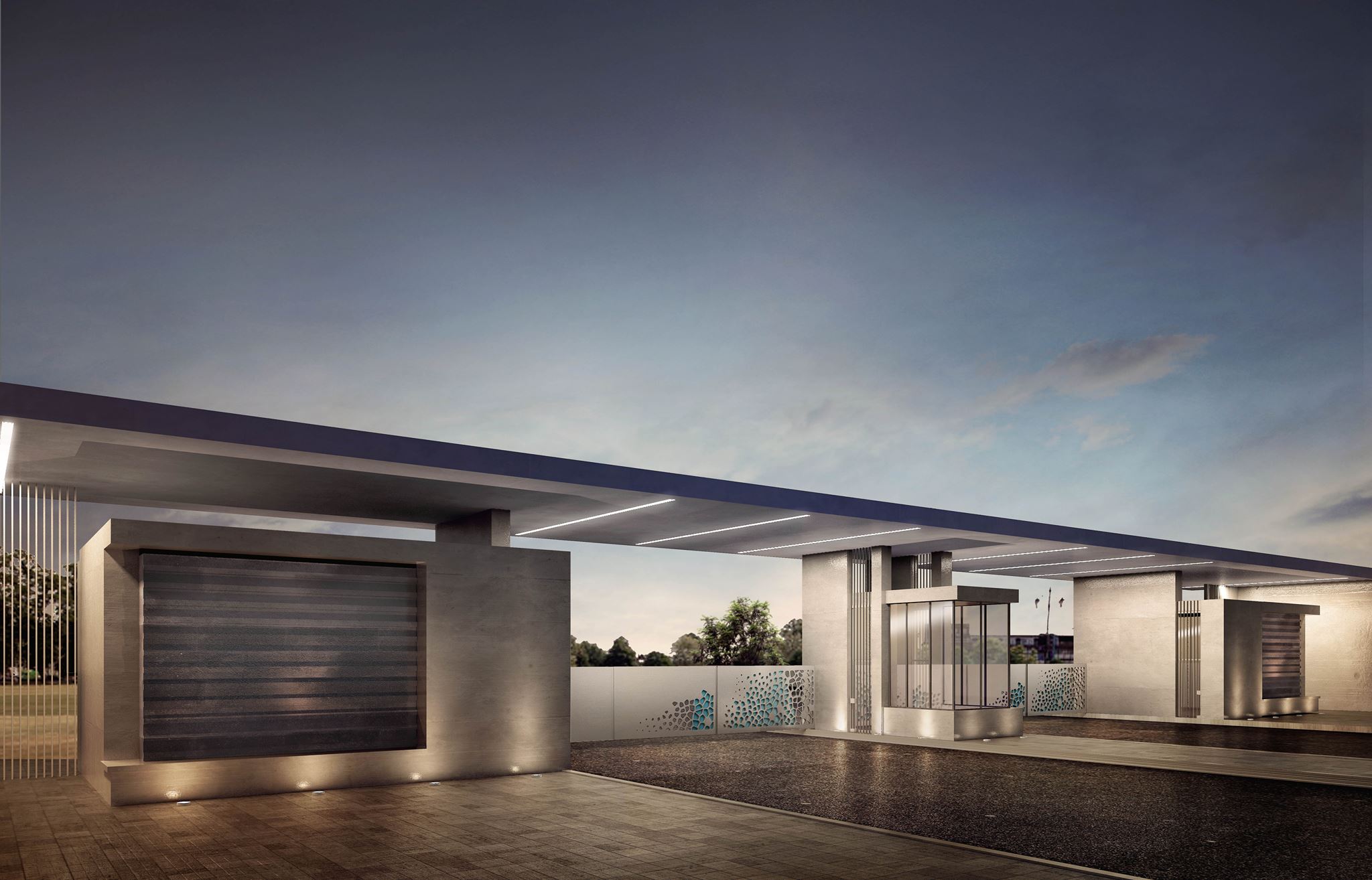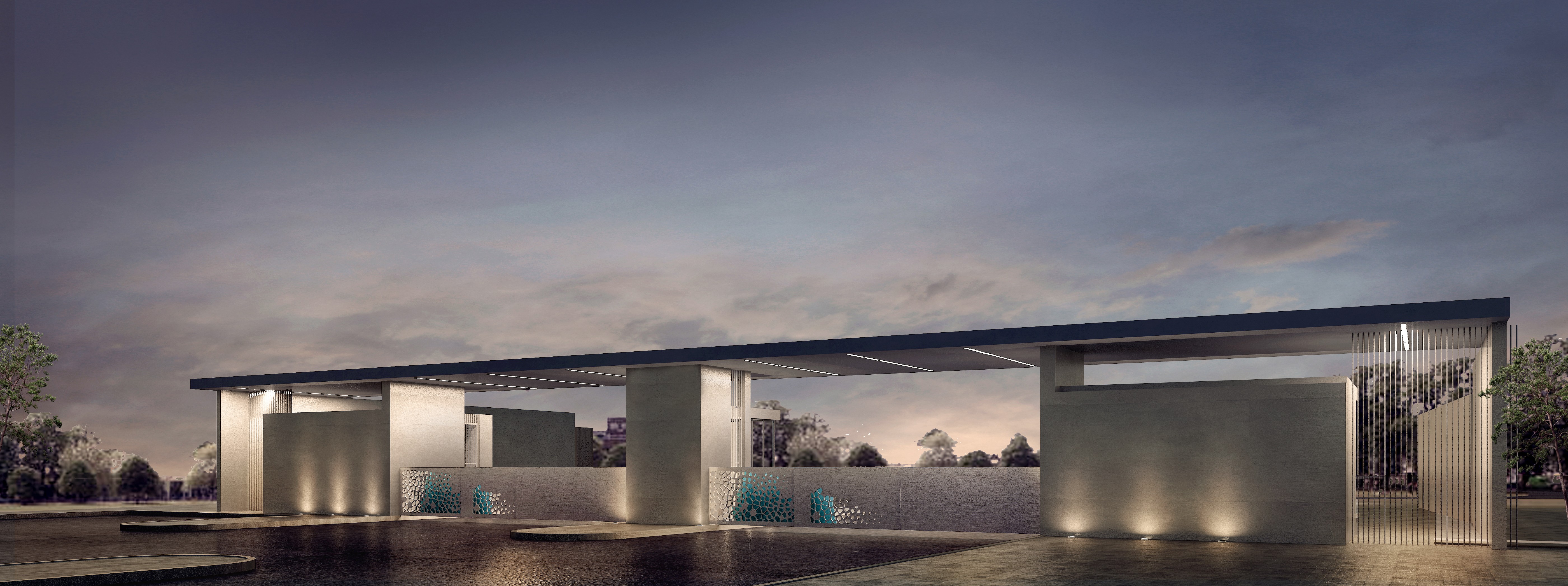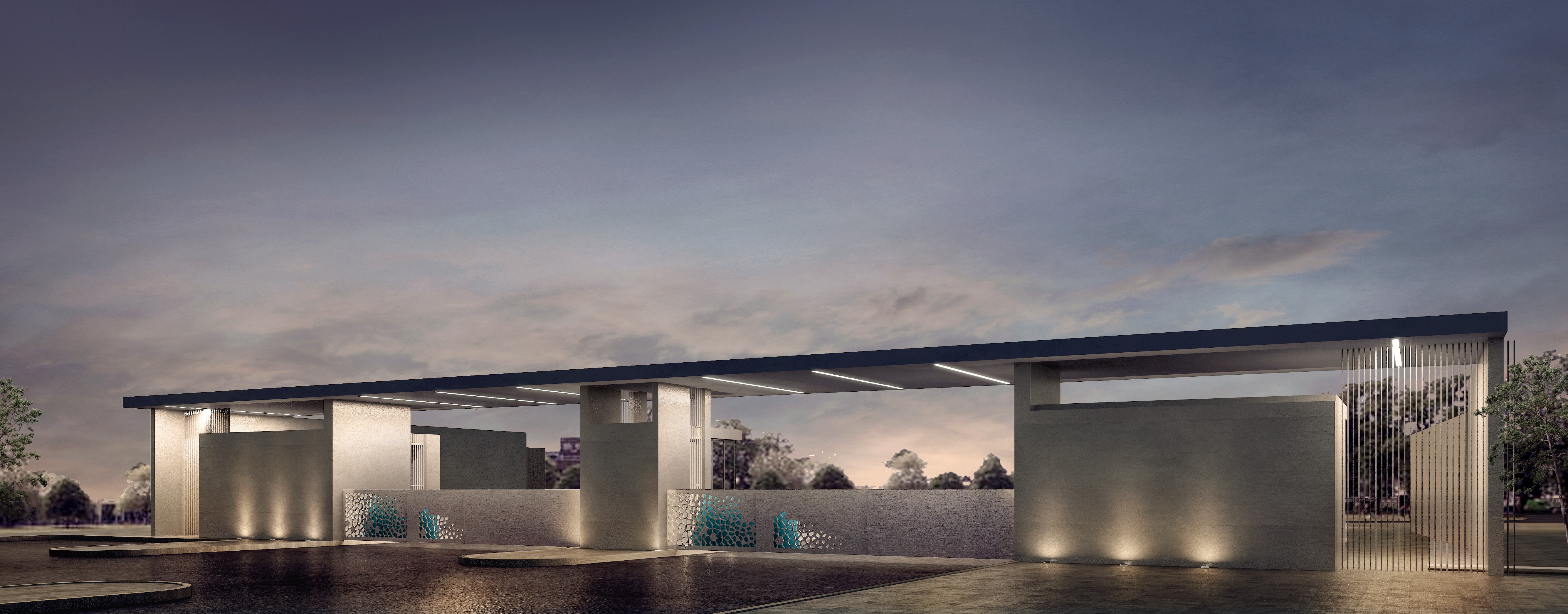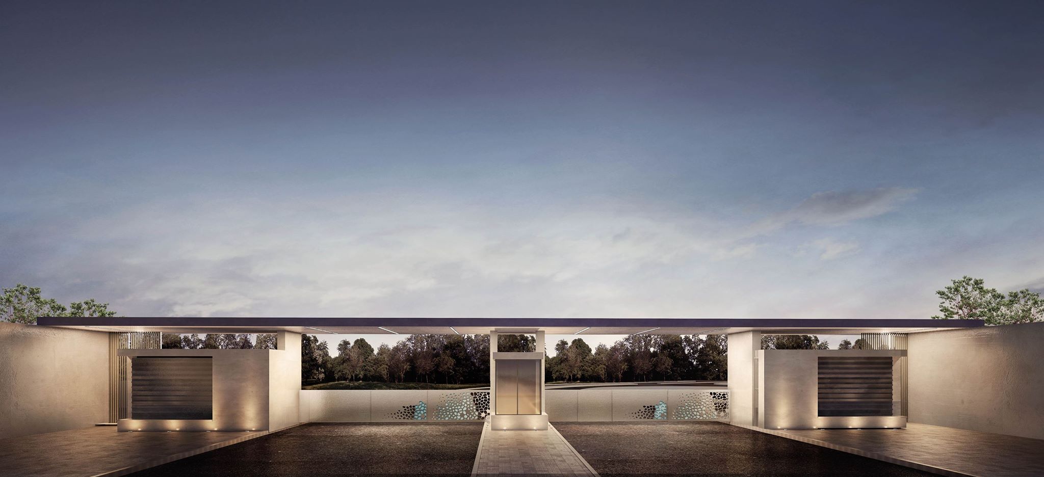 The design integrates landscape elements with architectural features to create a strong visual landmark. The gate doors are crafted from iron rods with carefully imprinted elements that reference Ayla’s water-inspired branding, forming patterns that echo the fluidity and identity of the development. This detail reinforces the project’s connection to the coastal environment and Ayla’s design language.