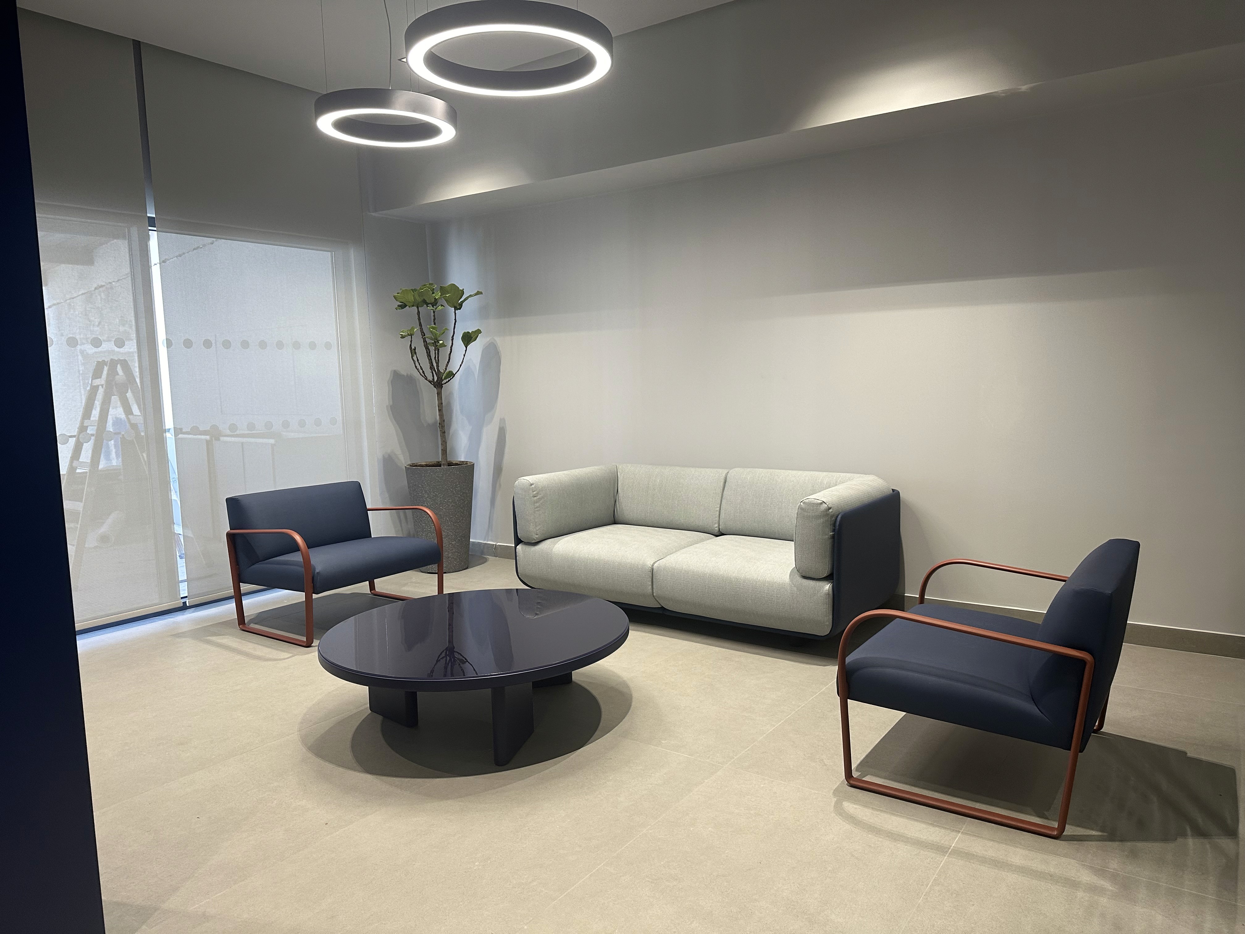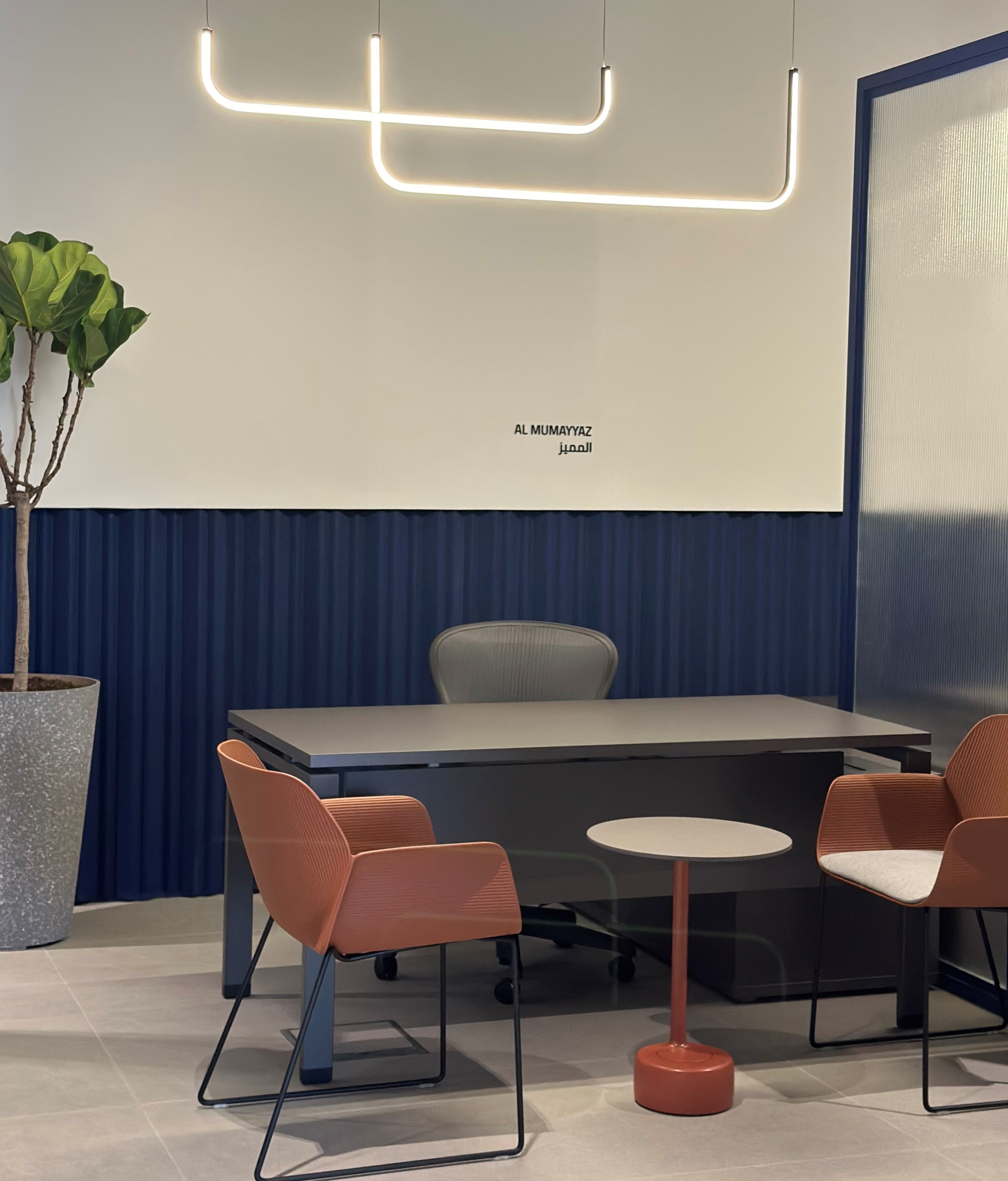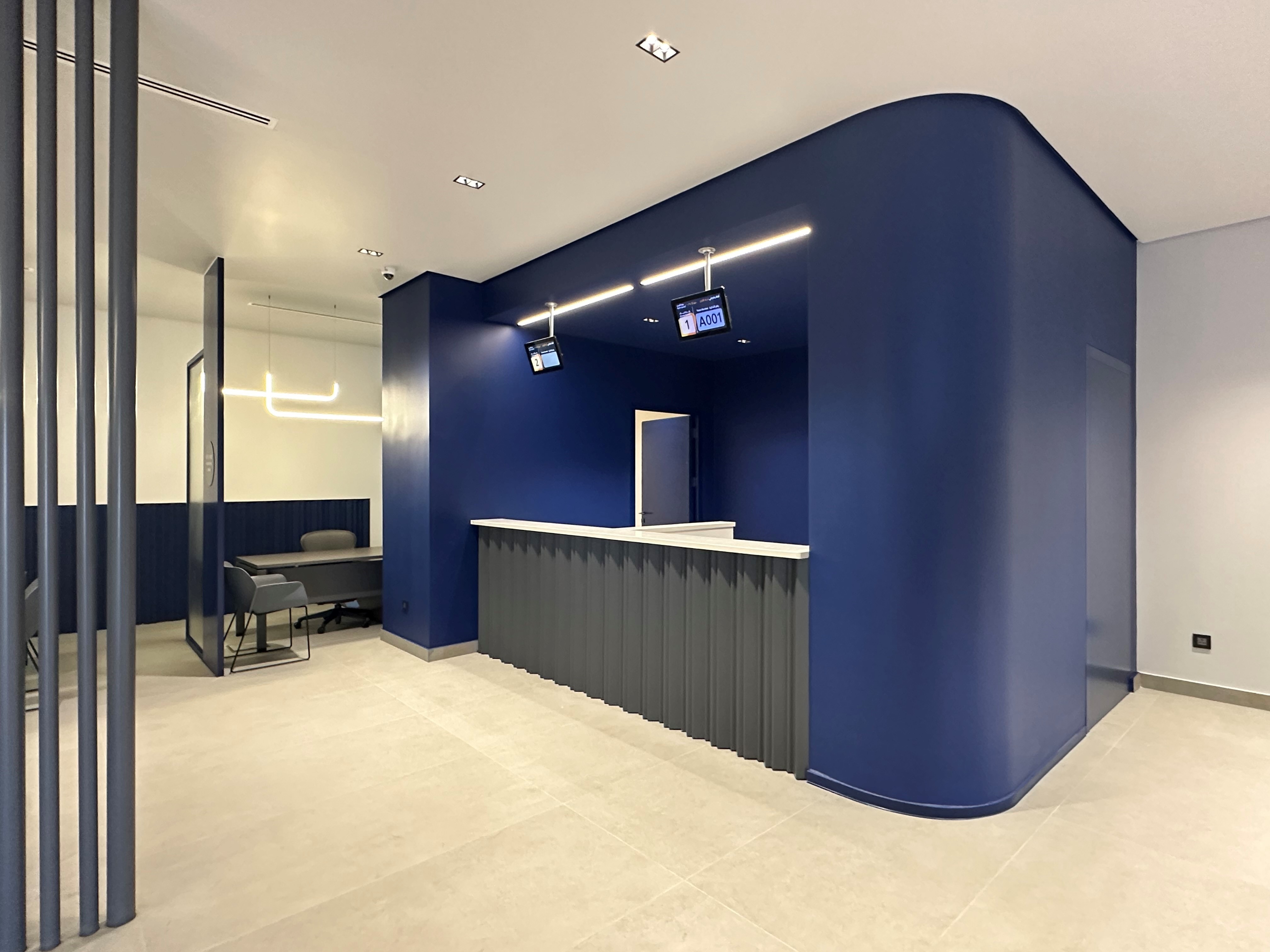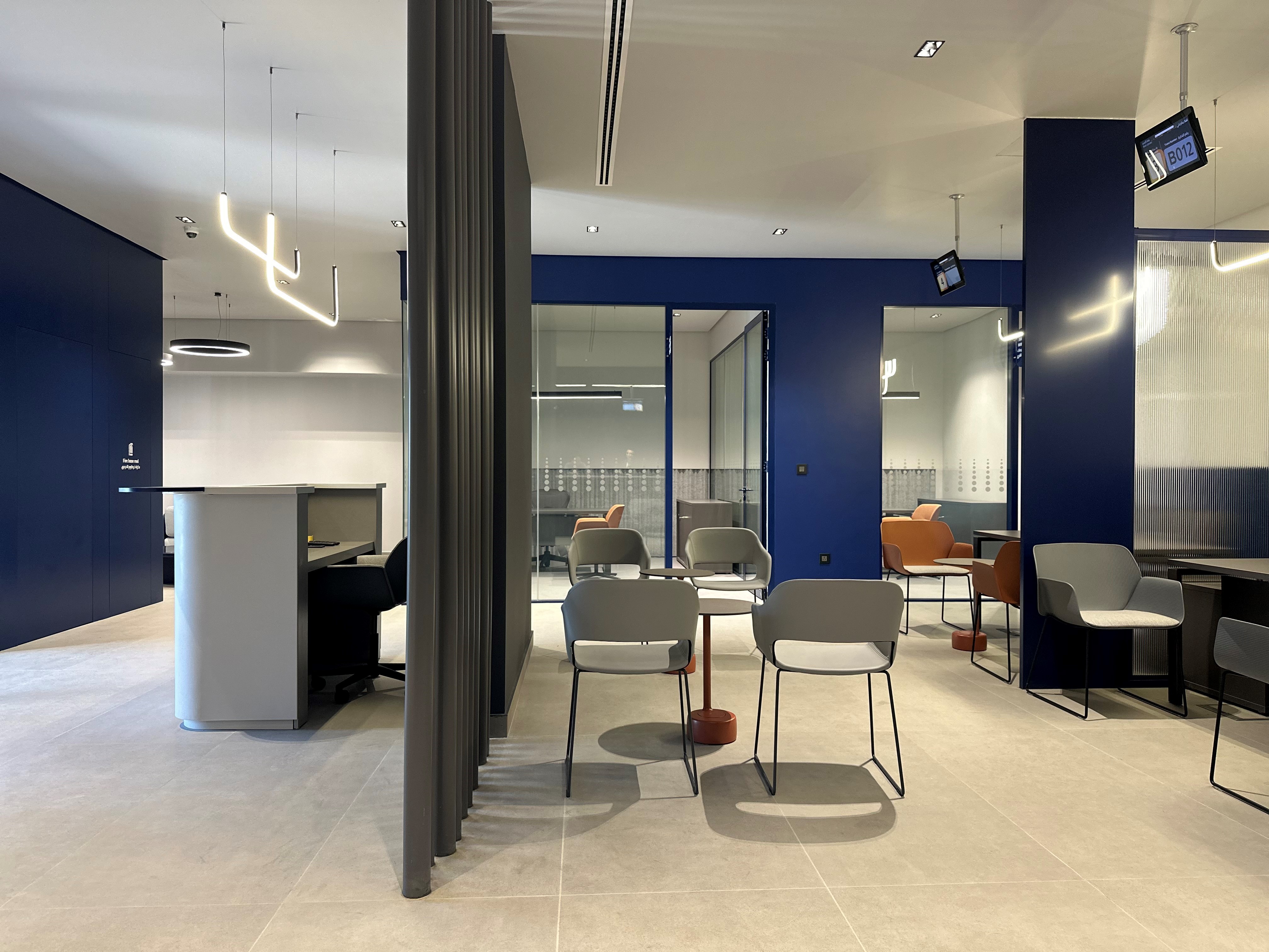 The bank office is designed around a refined palette that reinforces the branch’s brand identity while creating a modern, professional environment. Deep blue is used as the dominant color, establishing a strong corporate presence, while camel brown leather chairs introduce warmth and a sense of premium comfort for clients and staff.