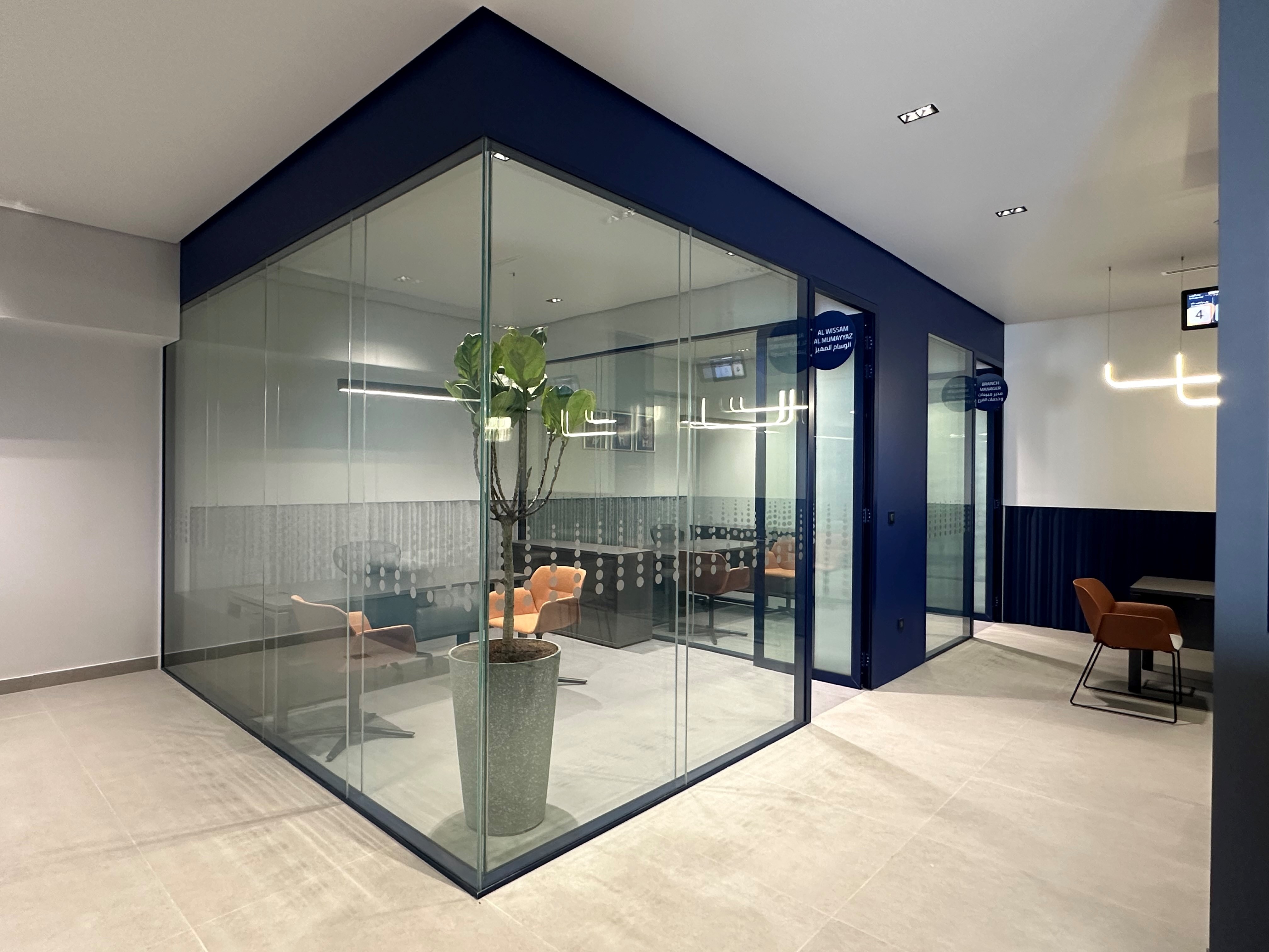 Glass cubed offices enhance transparency and openness throughout the workspace, complemented by clearly placed signage that supports easy navigation and brand visibility. Grey tones are thoughtfully introduced in finishes and surfaces to balance the palette, adding a contemporary, neutral backdrop that ties the entire space together with understated sophistication.