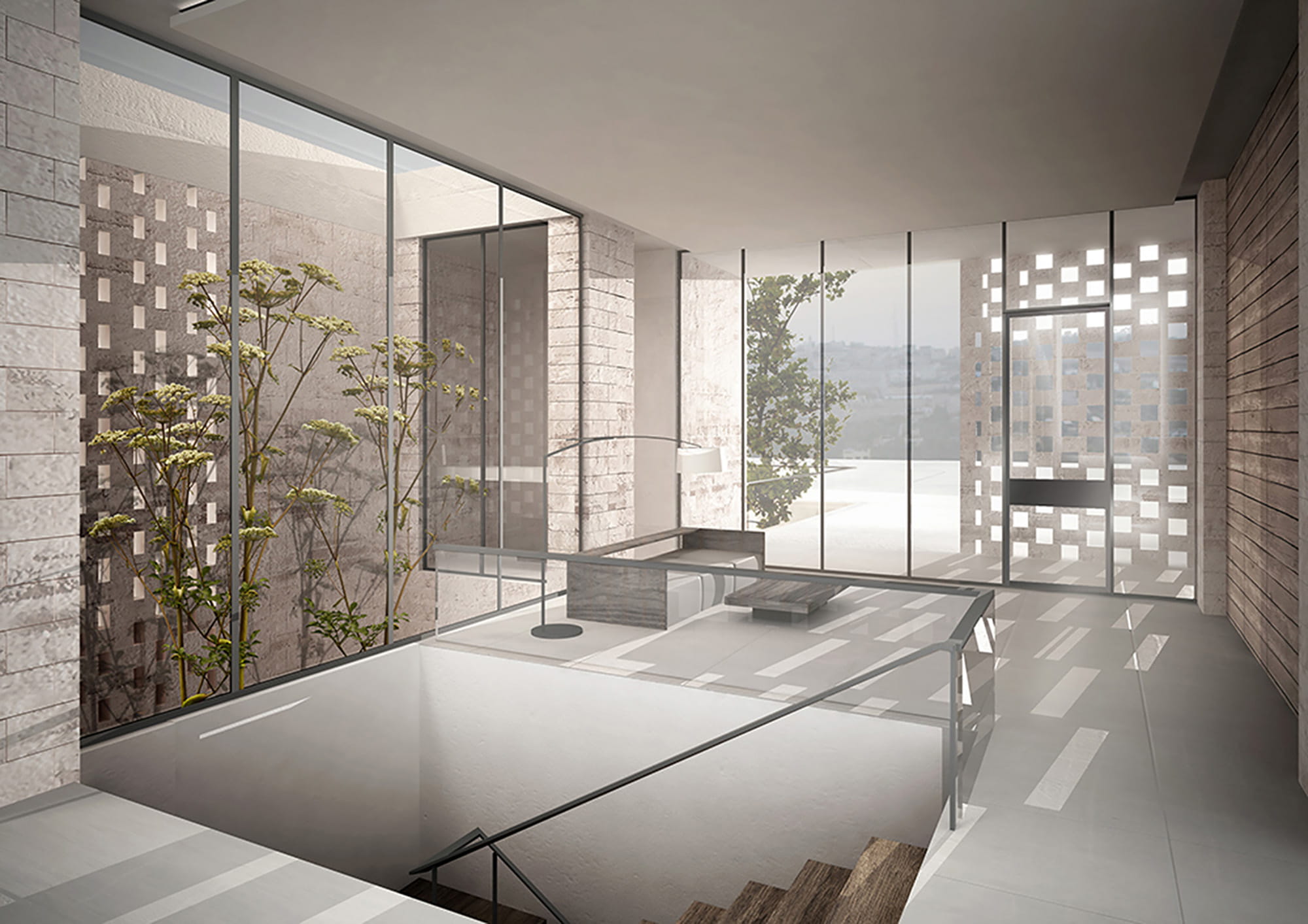 Brick is considered the construction and finishing material for the elevations of this house internally and externally, therefore came the name: The Brick House. The special experience of the space starts with an indirect entrance at the top of the mountain, a mass considered as the welcoming zone to move downwards into the living space and the main floor of the house.