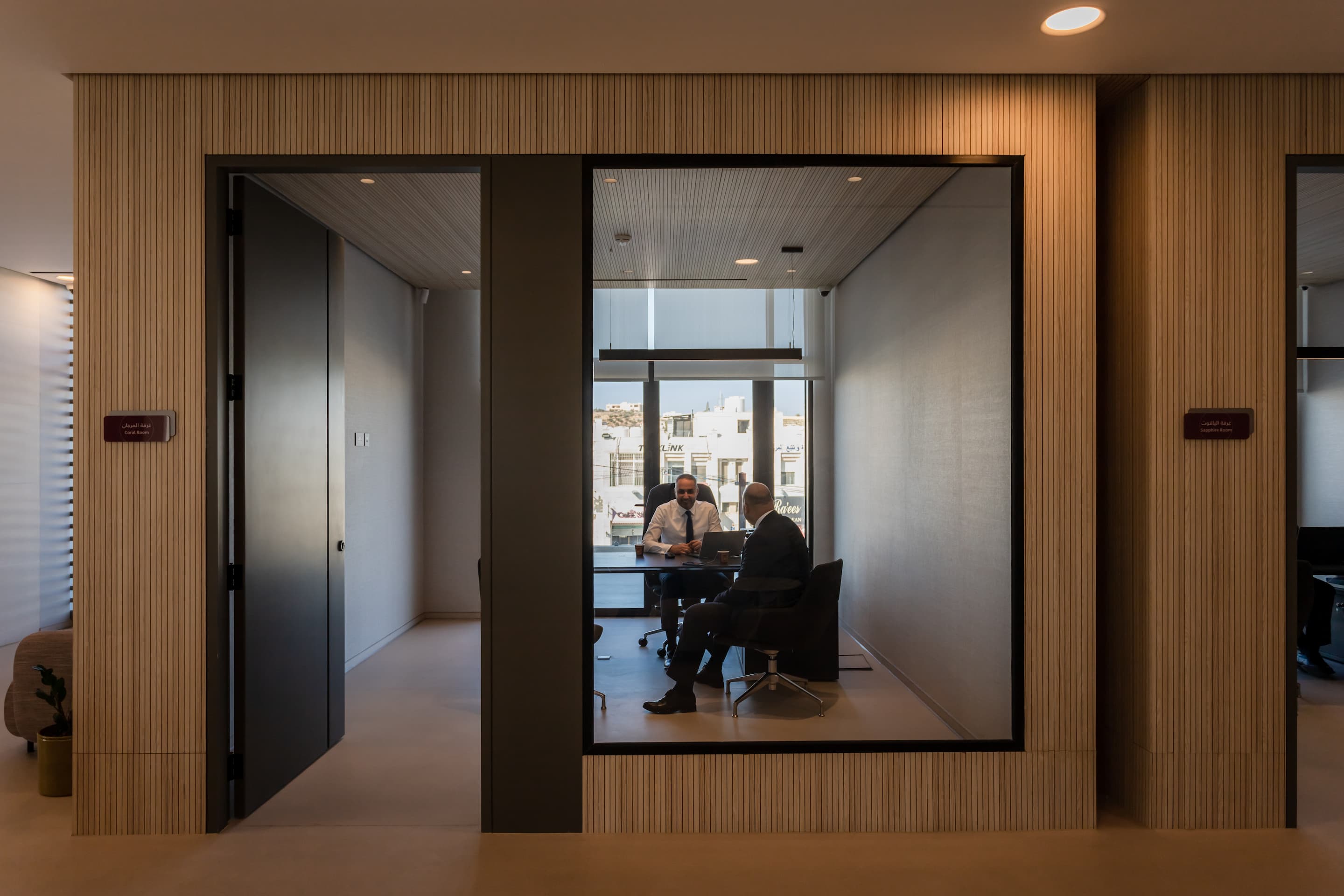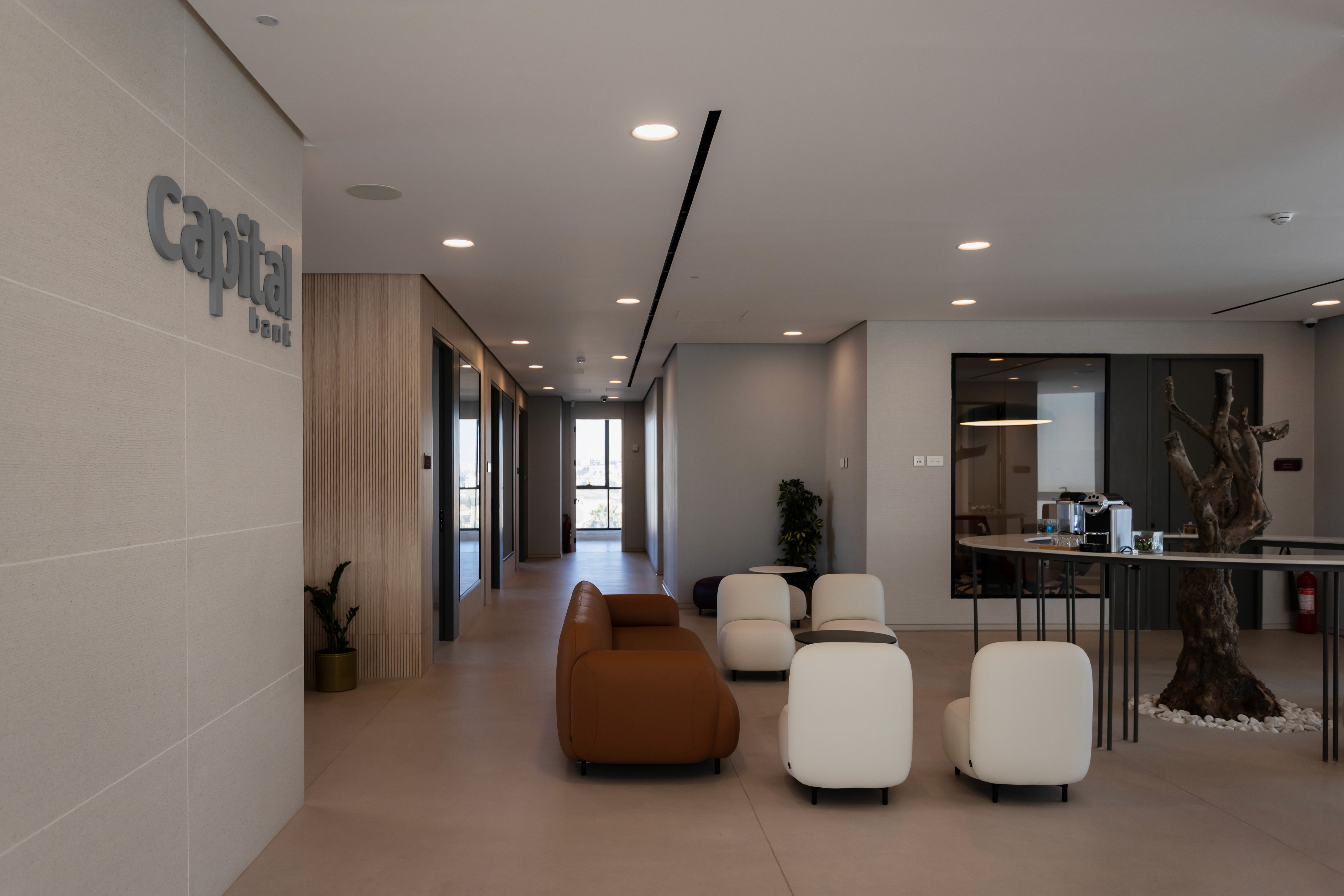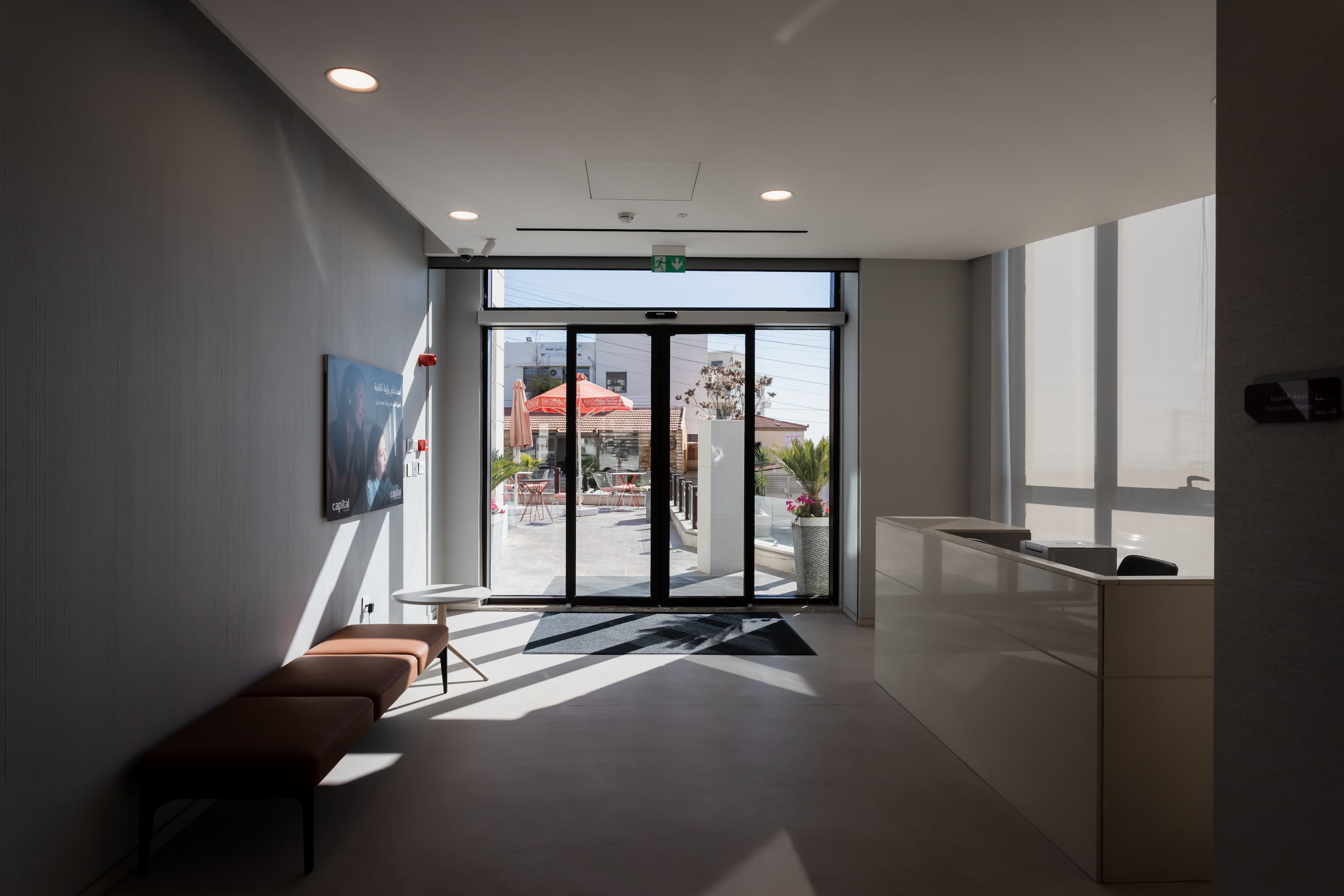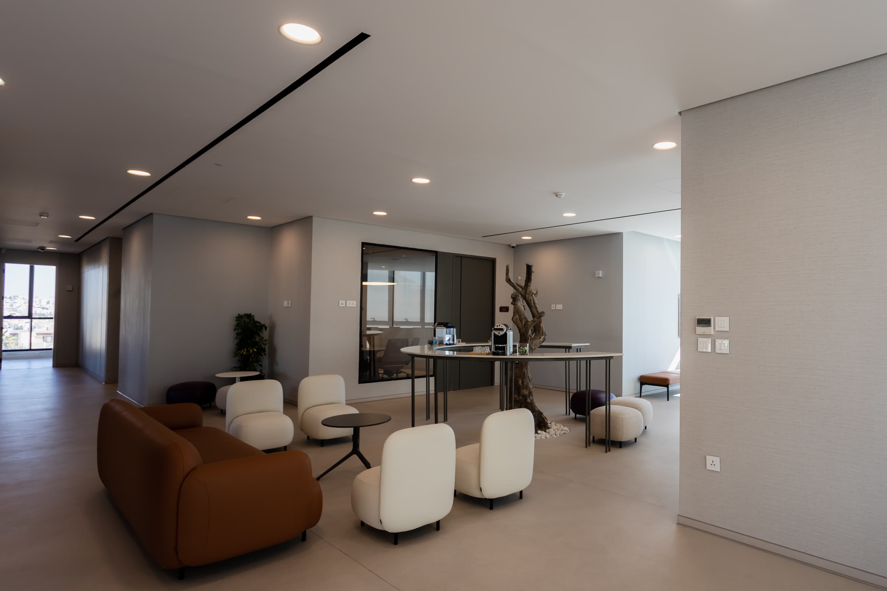 From the moment clients enter, they are welcomed into a reception area reminiscent of a hotel lounge, while the offices are designed as independent cubical enclosures that strike a balance between openness and privacy. Located in a prime, high-traffic area of Dabouq, surrounded by shops and cafés and frequented by an elite clientele, the branch reflects both accessibility and exclusivity in its design language.