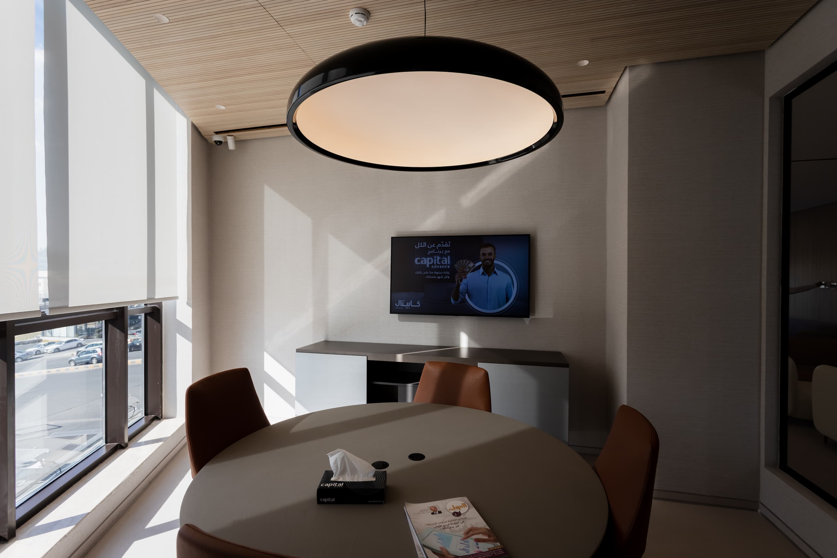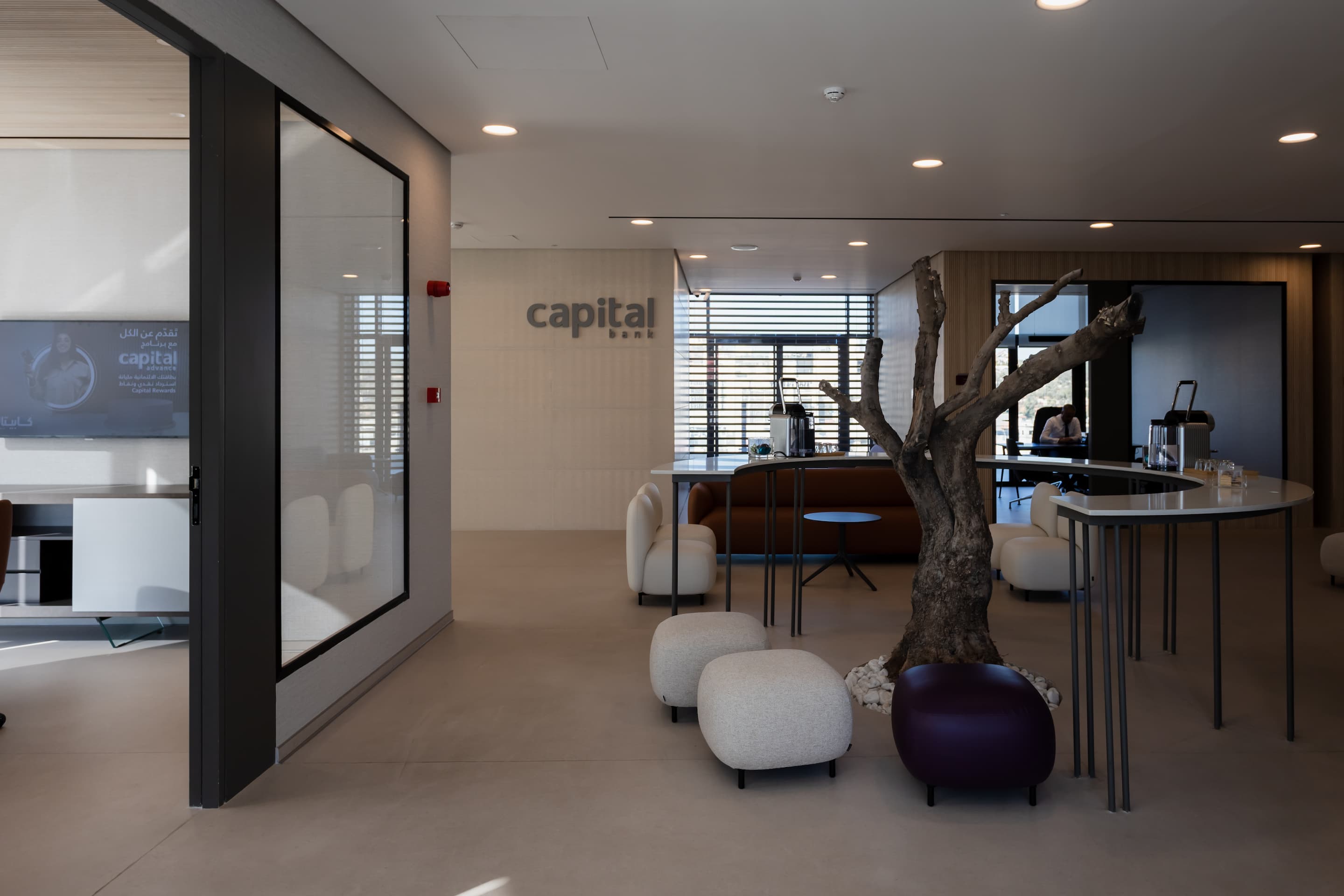 The Capital Select branch in Dabouq represents a refined evolution of Capital Bank’s Select concept, blending the warmth of a boutique hotel with the sophistication of a private banking experience. Building on our previous work with Capital Select, this project presented a unique design challenge due to the irregular layout and numerous corners within the existing space. Through careful interior architectural planning, we transformed these constraints into opportunities, creating a cozy yet elegant environment that feels both intimate and functional.