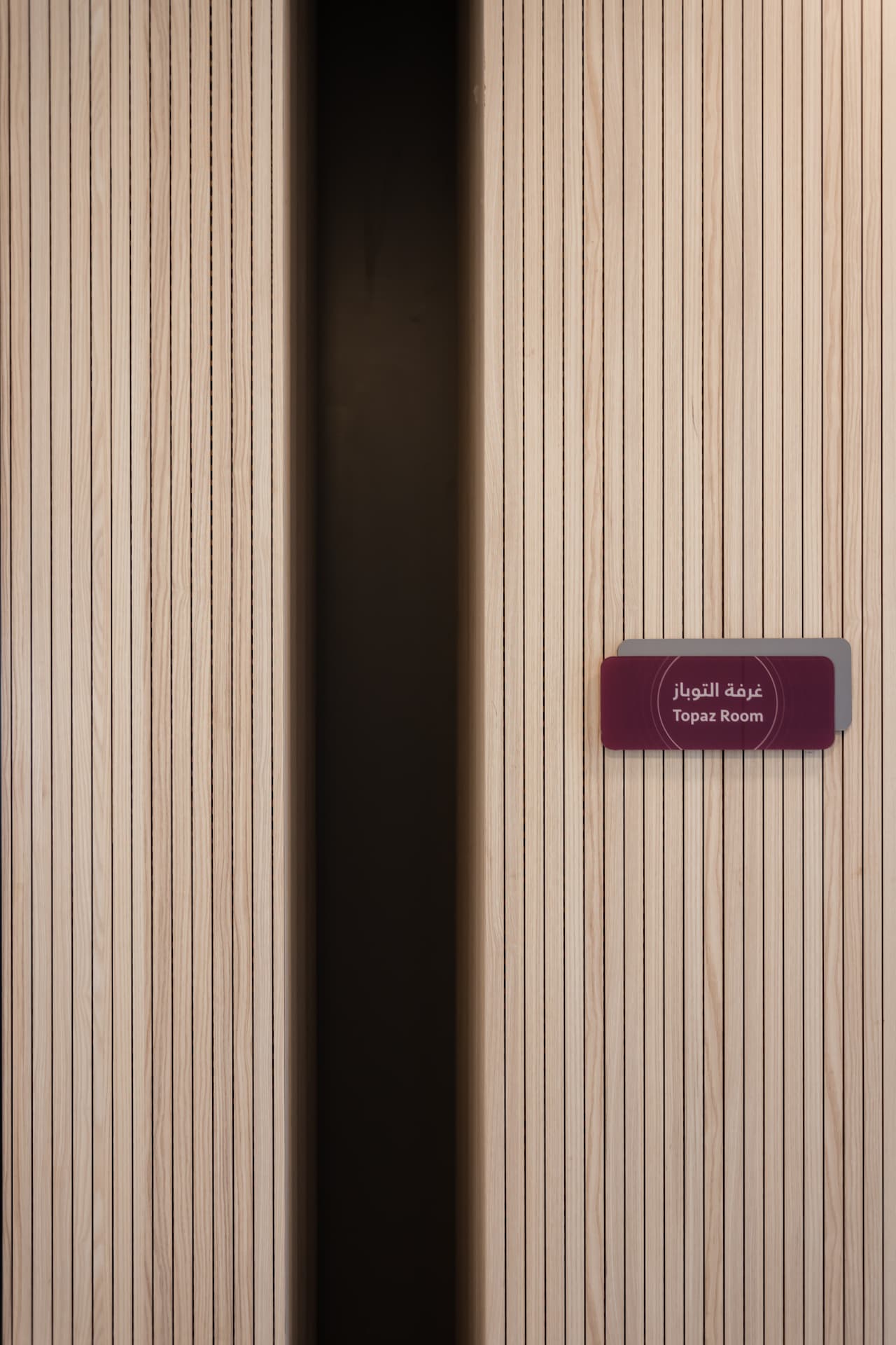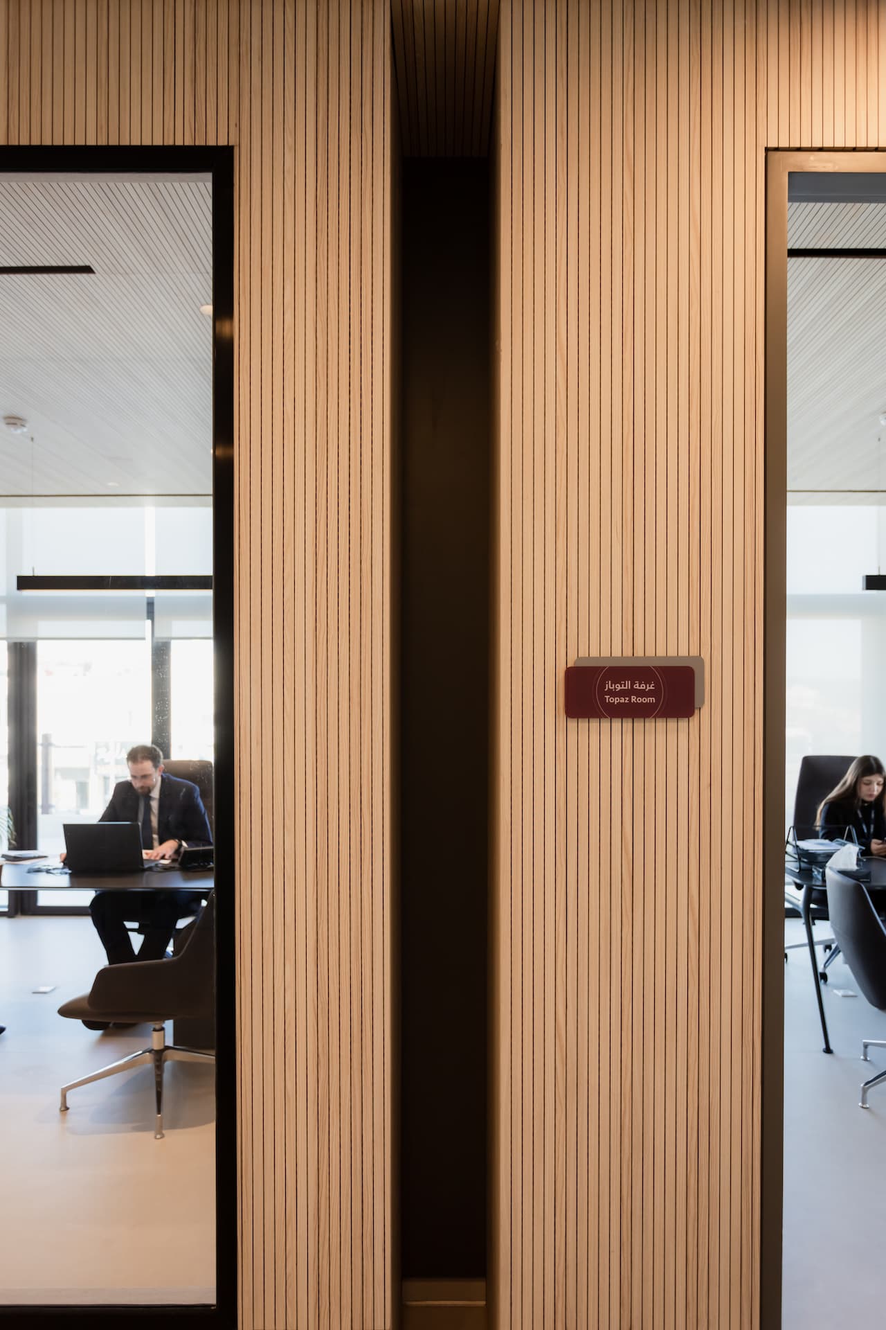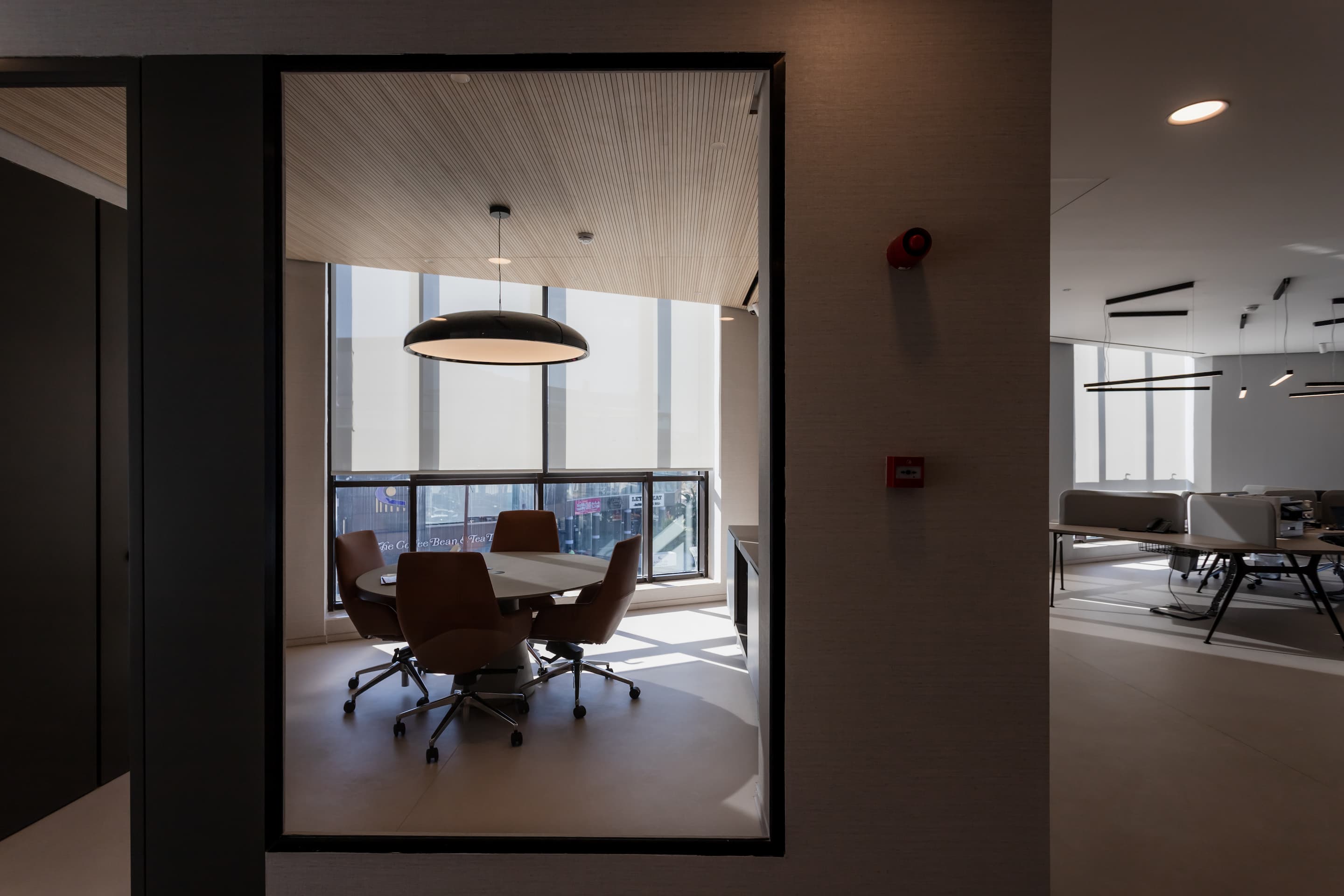 A key feature of the space is the thoughtful integration of natural lighting, which enhances the overall ambiance and reinforces the sense of openness despite the compact layout. Light is carefully drawn into the interior, softening the geometry of the space and highlighting material textures to create a calm and inviting atmosphere throughout the day. Additionally, the meeting rooms are designed as refined, private enclaves that maintain visual continuity with the rest of the branch while ensuring acoustic privacy. These rooms provide comfortable, well-lit settings for personalized client interactions, further elevating the experience and aligning with the branch’s boutique, hospitality-inspired identity.