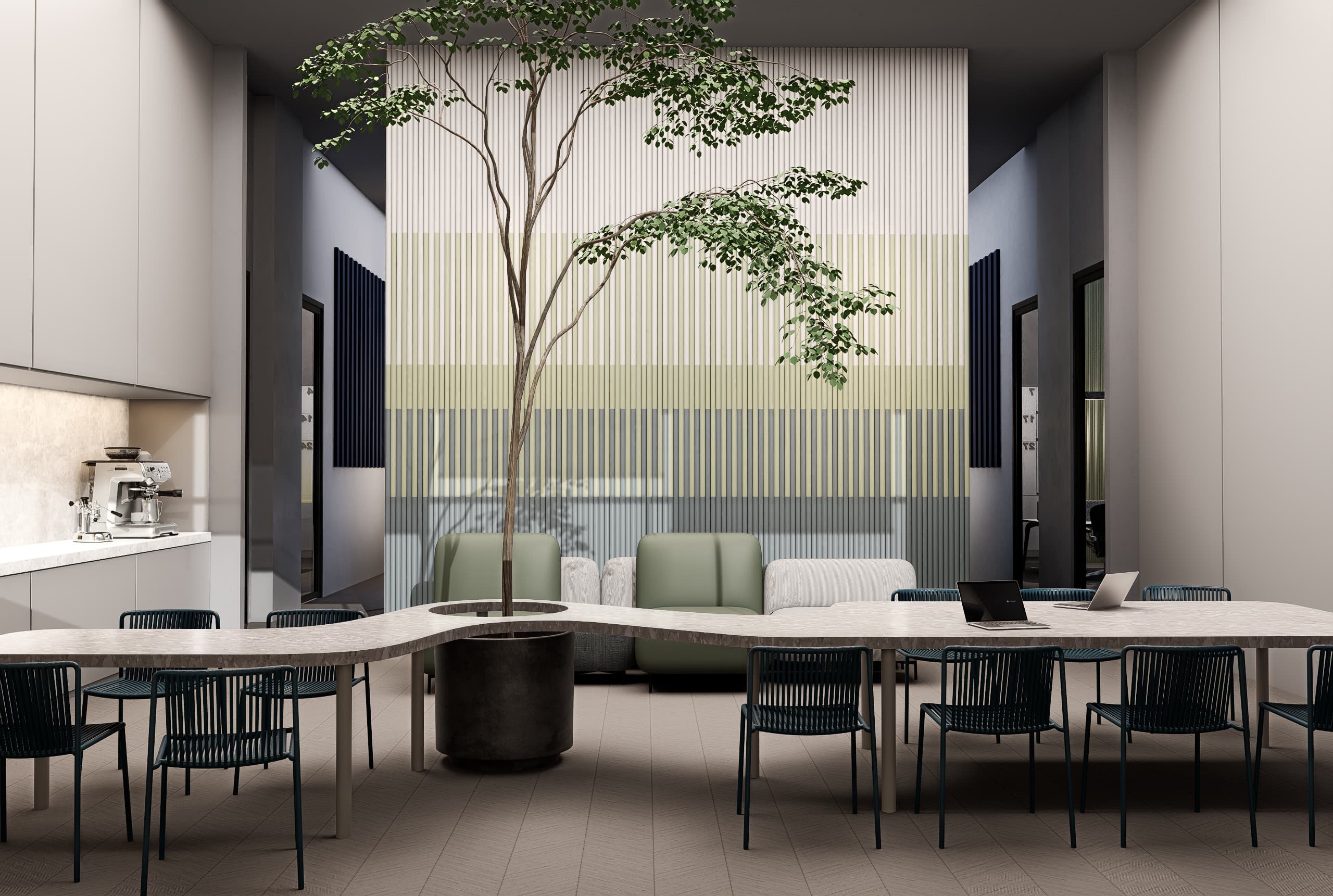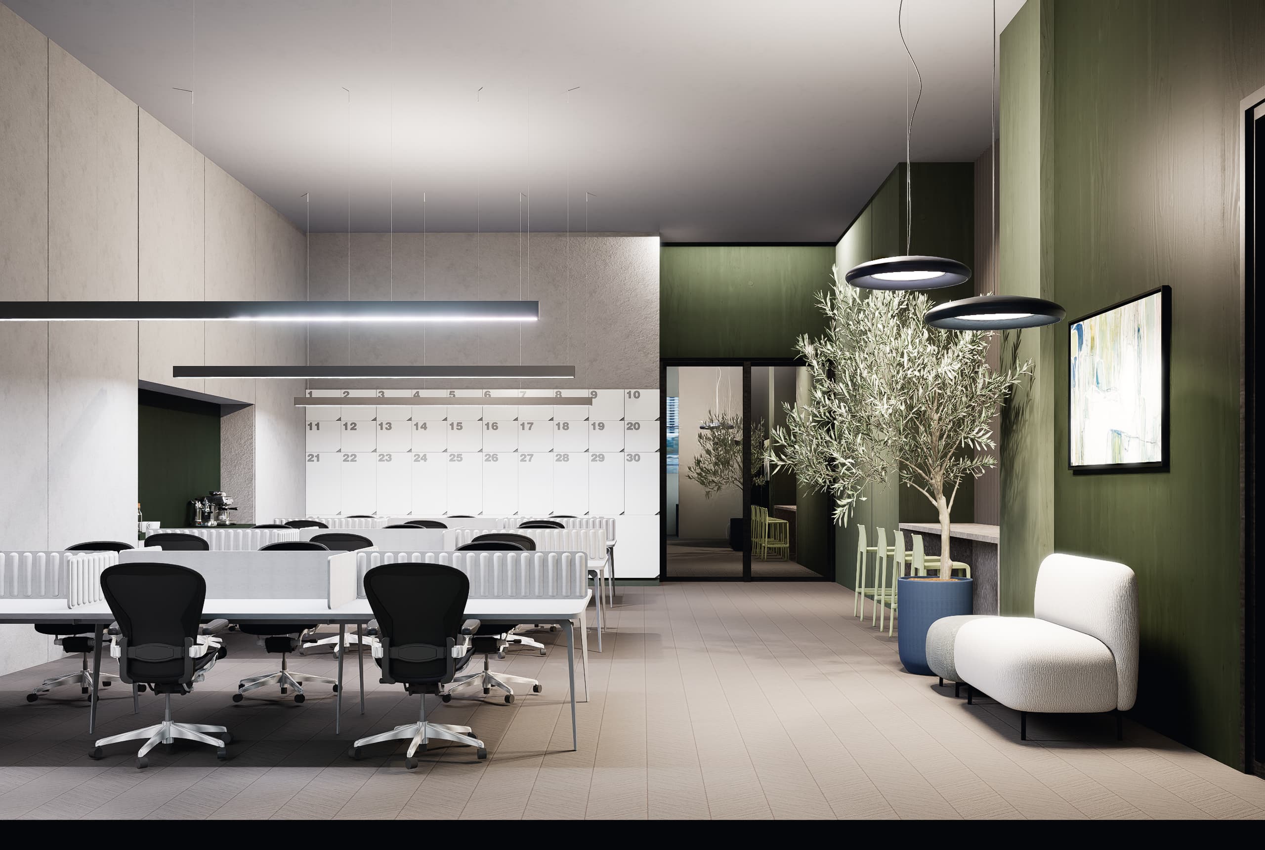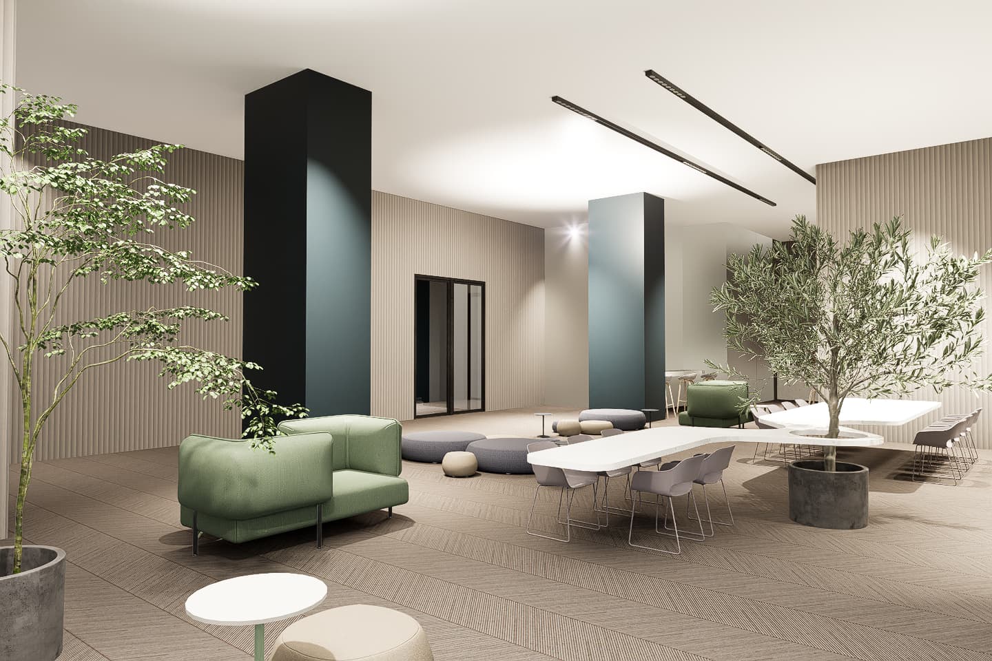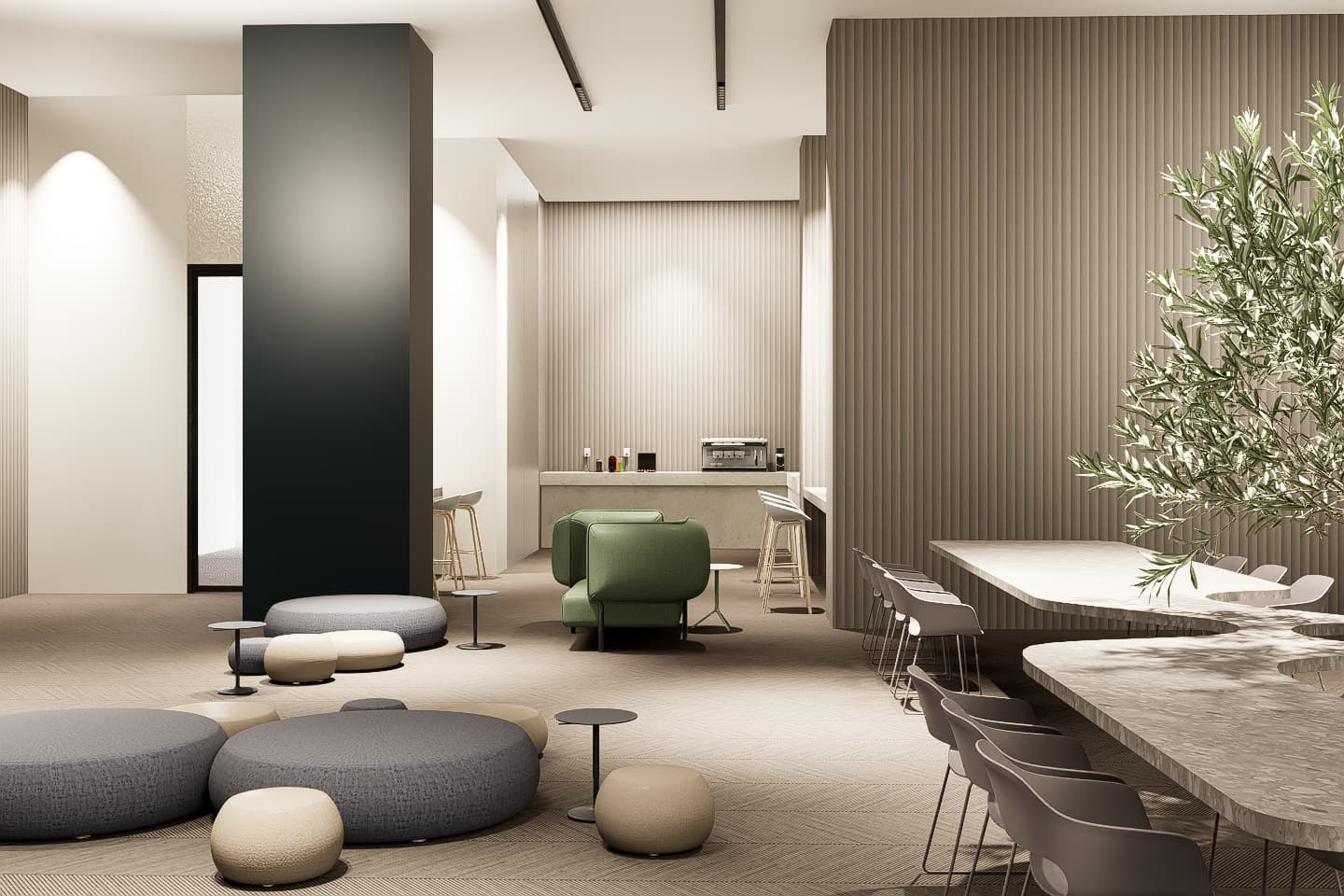 The design emphasizes open spaces and abundant greenery, creating a welcoming and refreshing environment. Large windows and indoor olive trees bring the outdoors in, creating a harmonious connection between nature and workspaces. The interiors feature earthy tones, with pastel purple and green-beige cladding that adds a subtle yet sophisticated aesthetic.