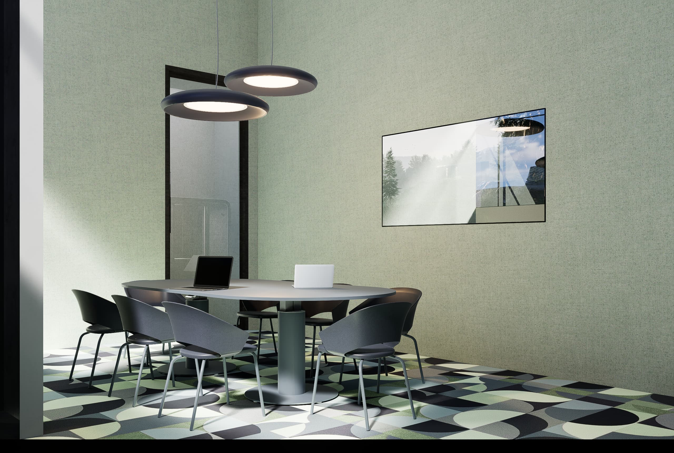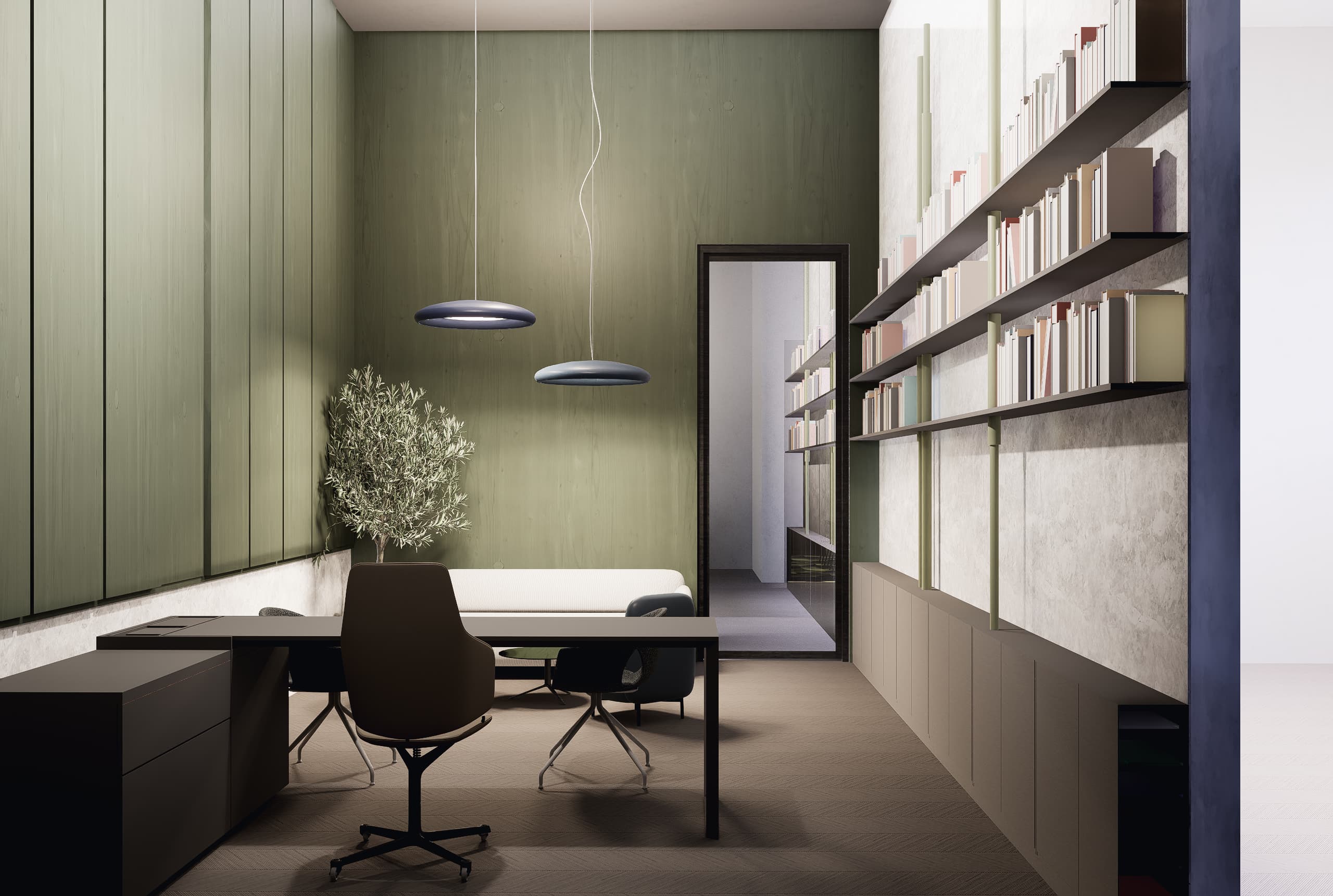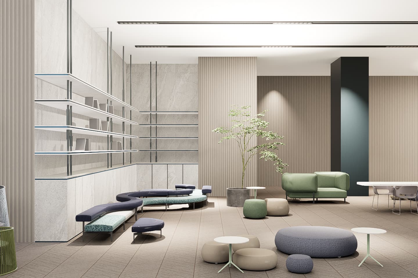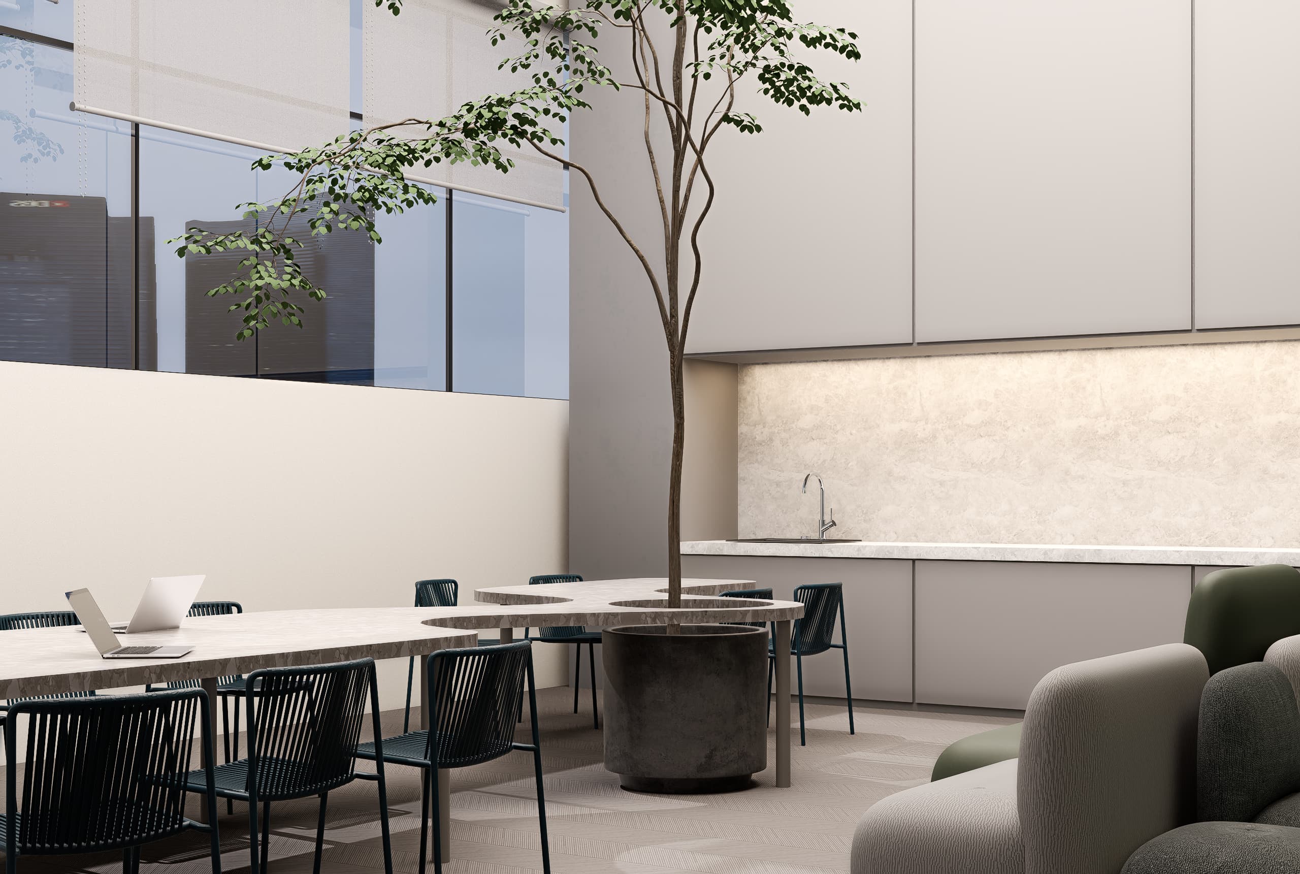 The design emphasizes open spaces and abundant greenery, creating a welcoming and refreshing environment. Large windows and indoor olive trees bring the outdoors in, creating a harmonious connection between nature and workspaces. The interiors feature earthy tones, with pastel purple and green-beige cladding that adds a subtle yet sophisticated aesthetic.