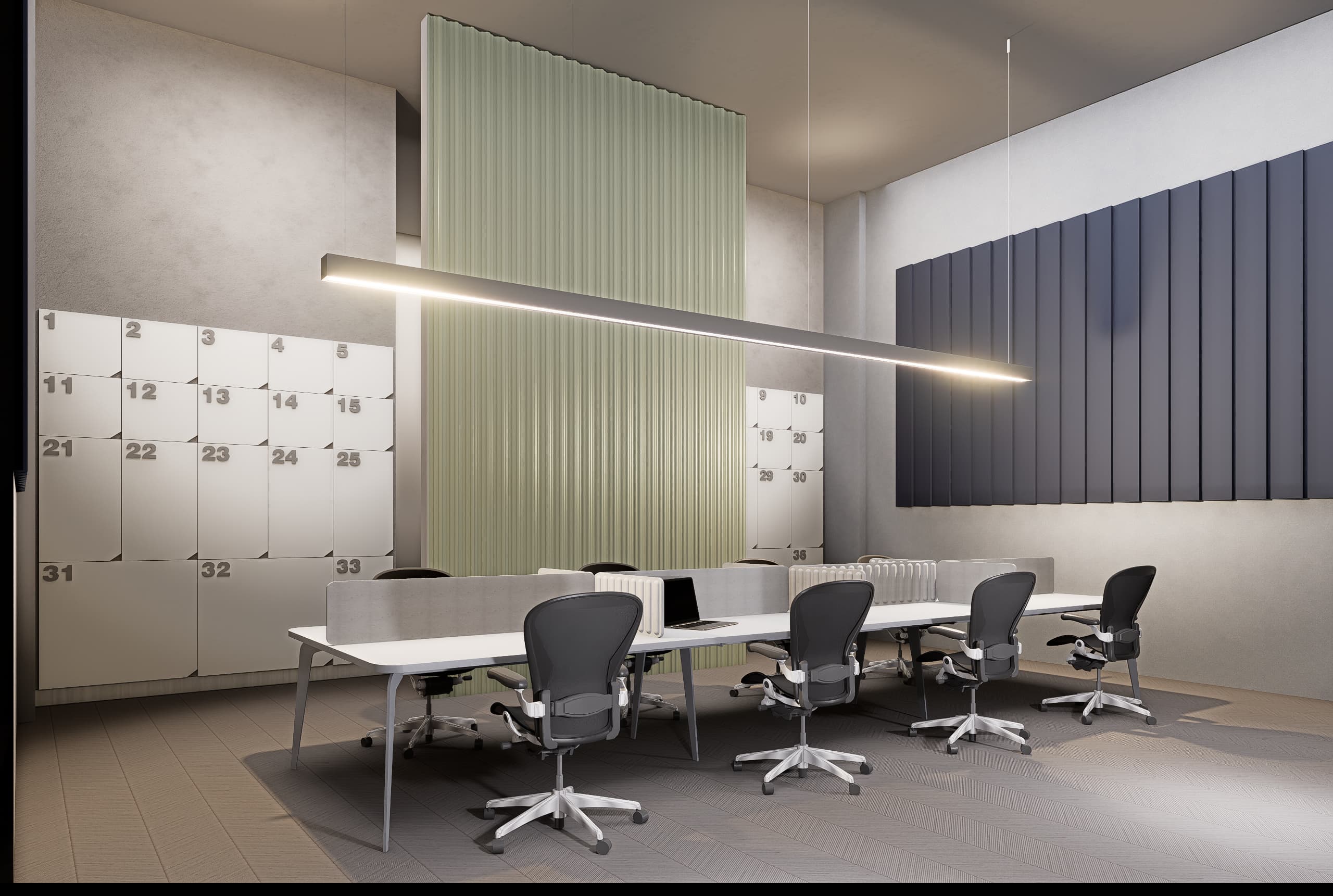 The office layout includes multiple workstations, senior offices, private offices, and dedicated meeting areas, complemented by dynamic zones such as a bar, lounge, and large reception areas. Thoughtful acoustic paneling ensures a comfortable and focused work environment, while flexible spaces adapt to various work styles and needs.