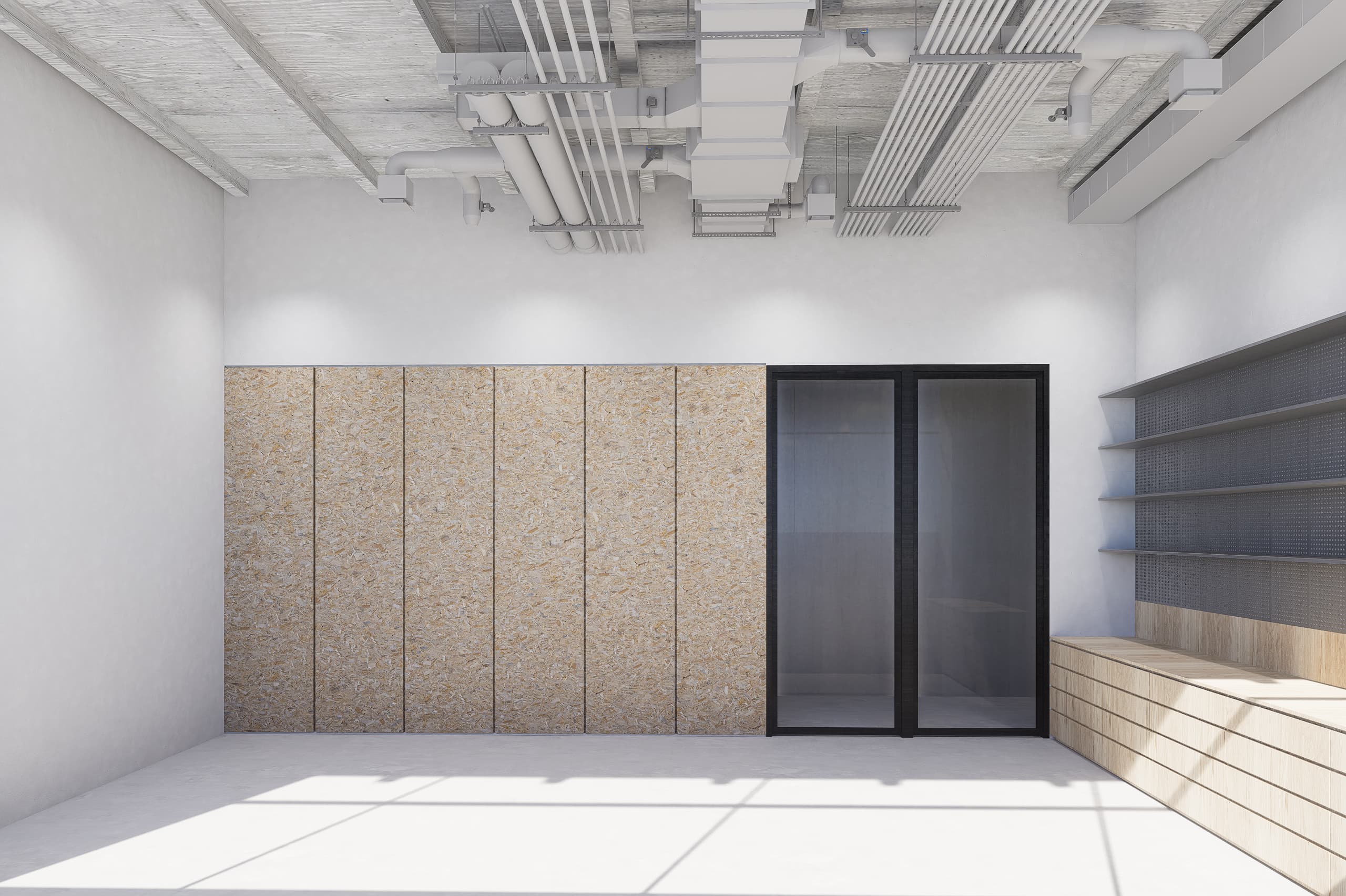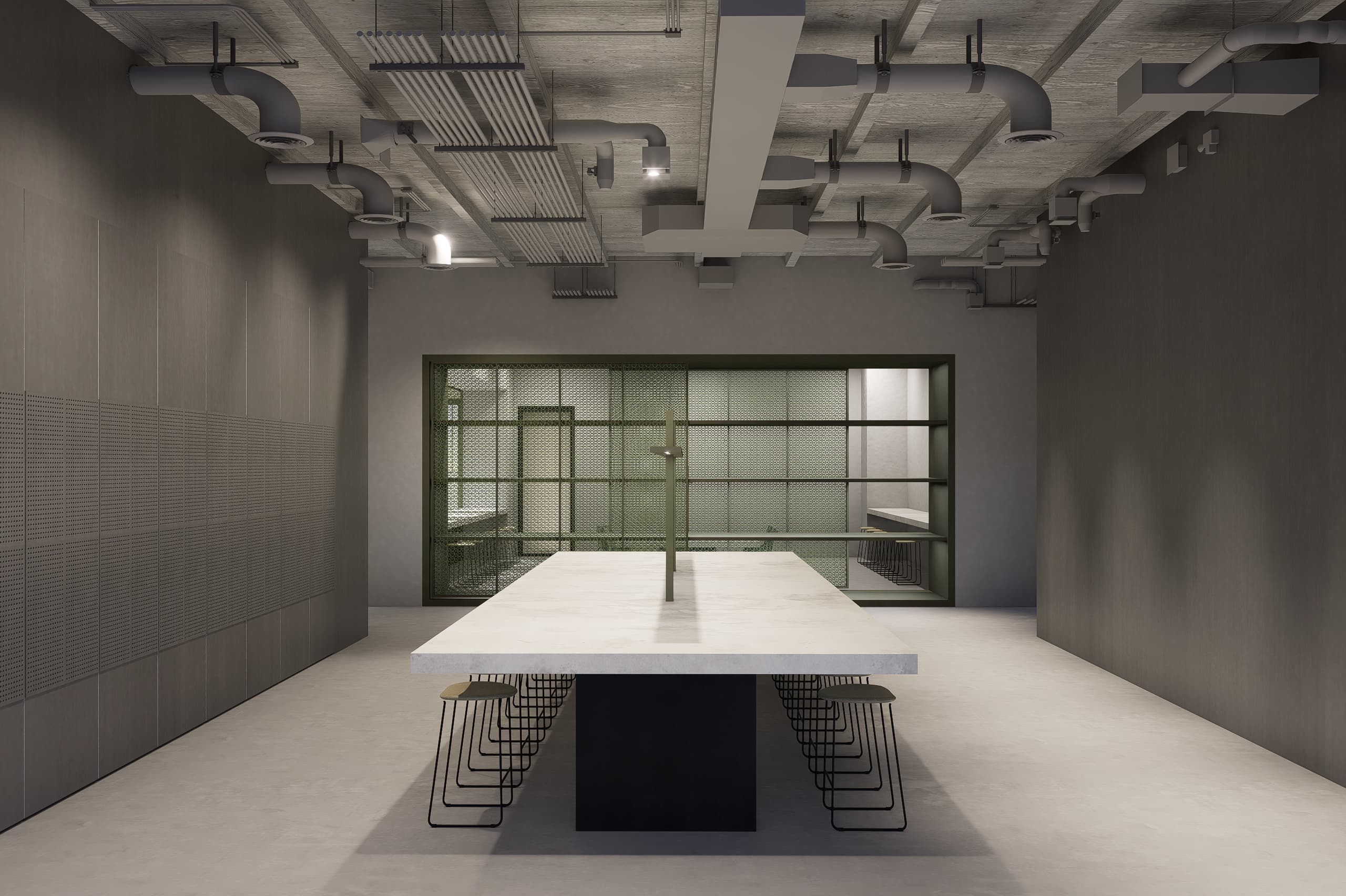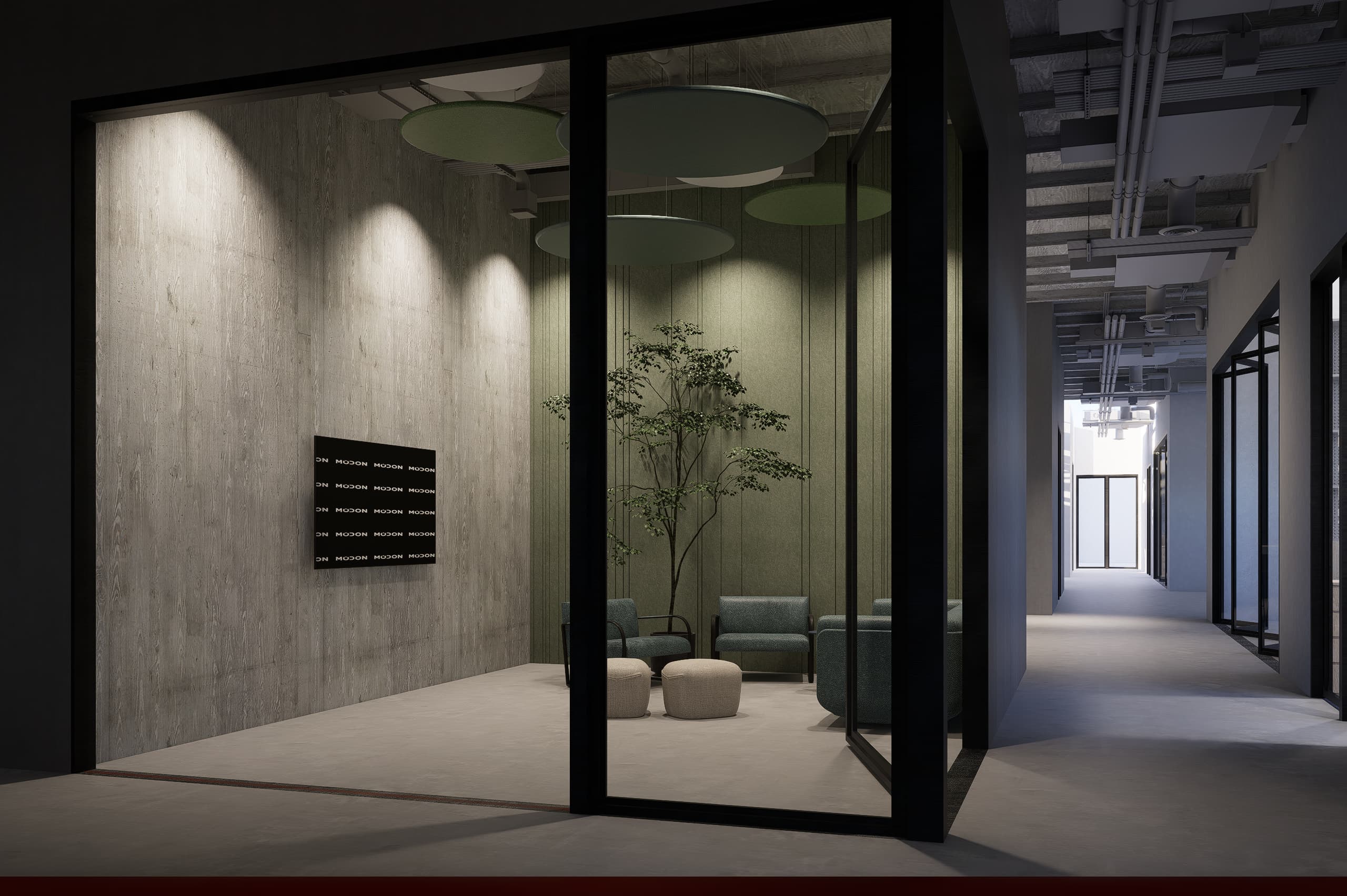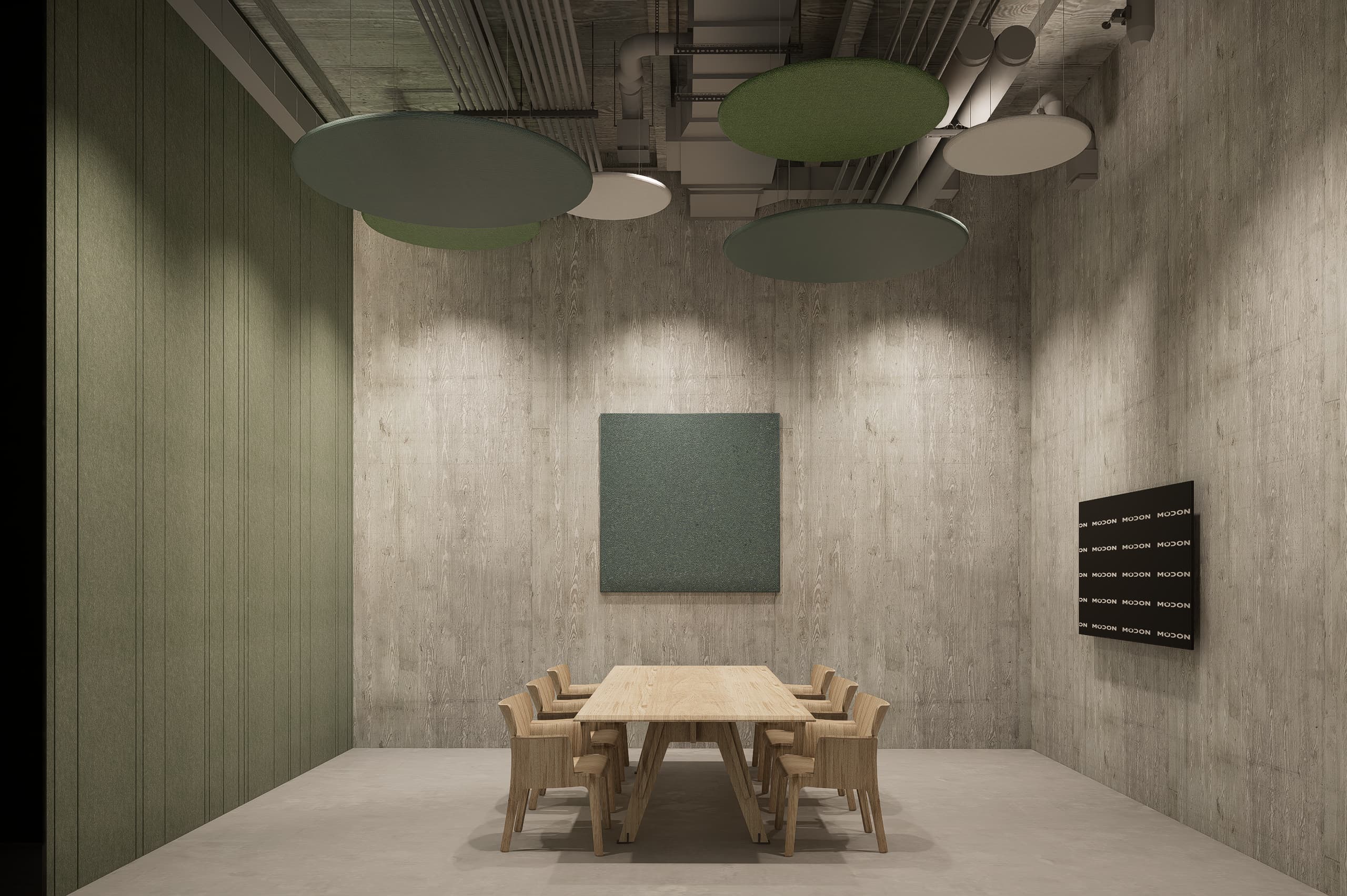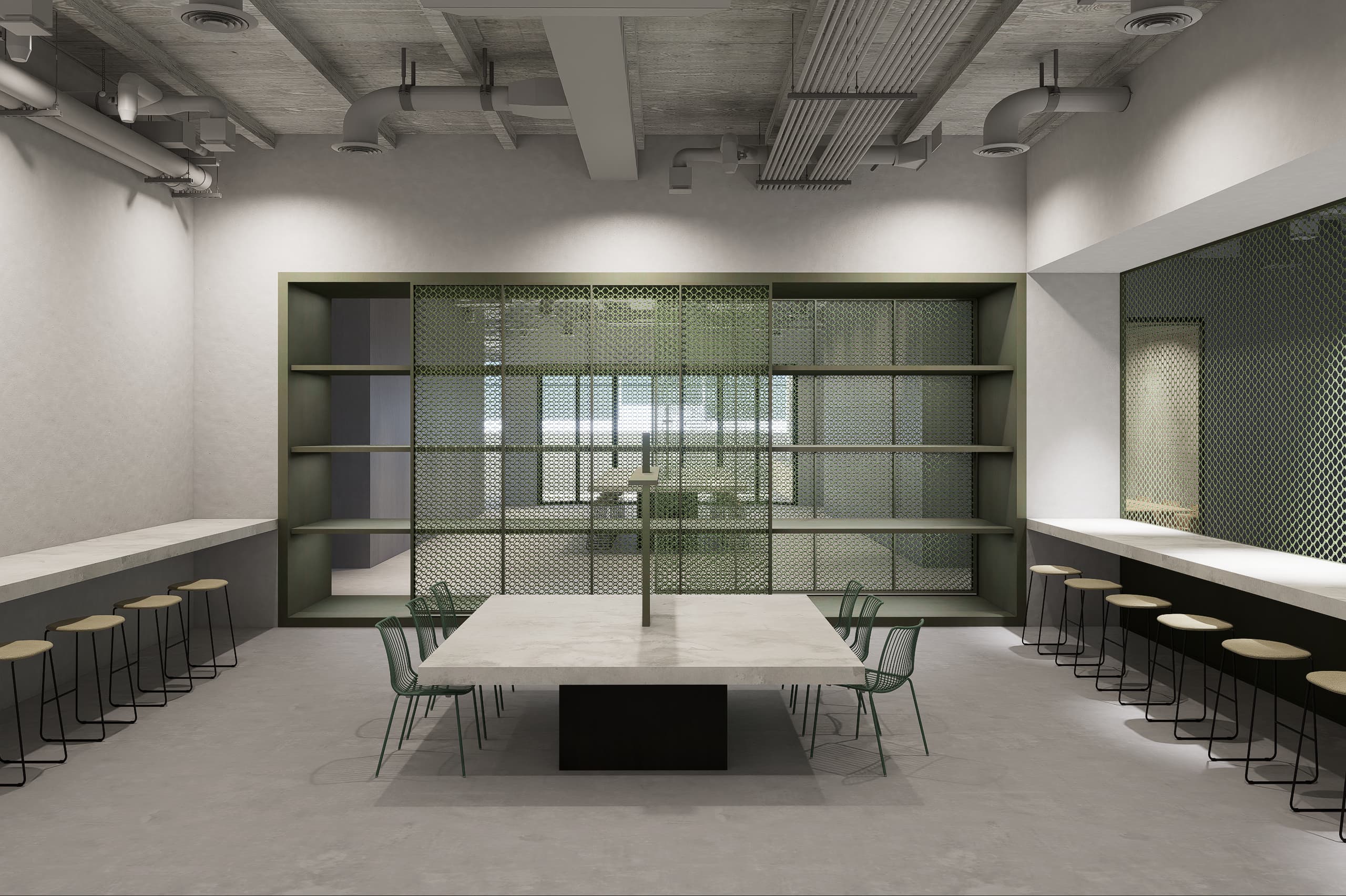 The interior palette combines calming green tones with light wood finishes, creating a warm yet vibrant atmosphere. Open workshop areas feature exposed industrial ceilings, while wooden acoustical cladding provides both texture and sound control. Private working spaces coexist seamlessly with communal zones, encouraging interaction and focus.