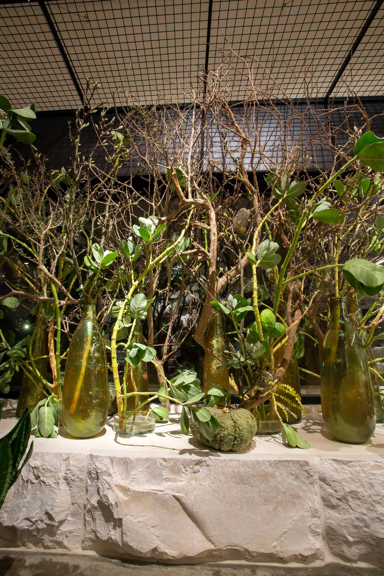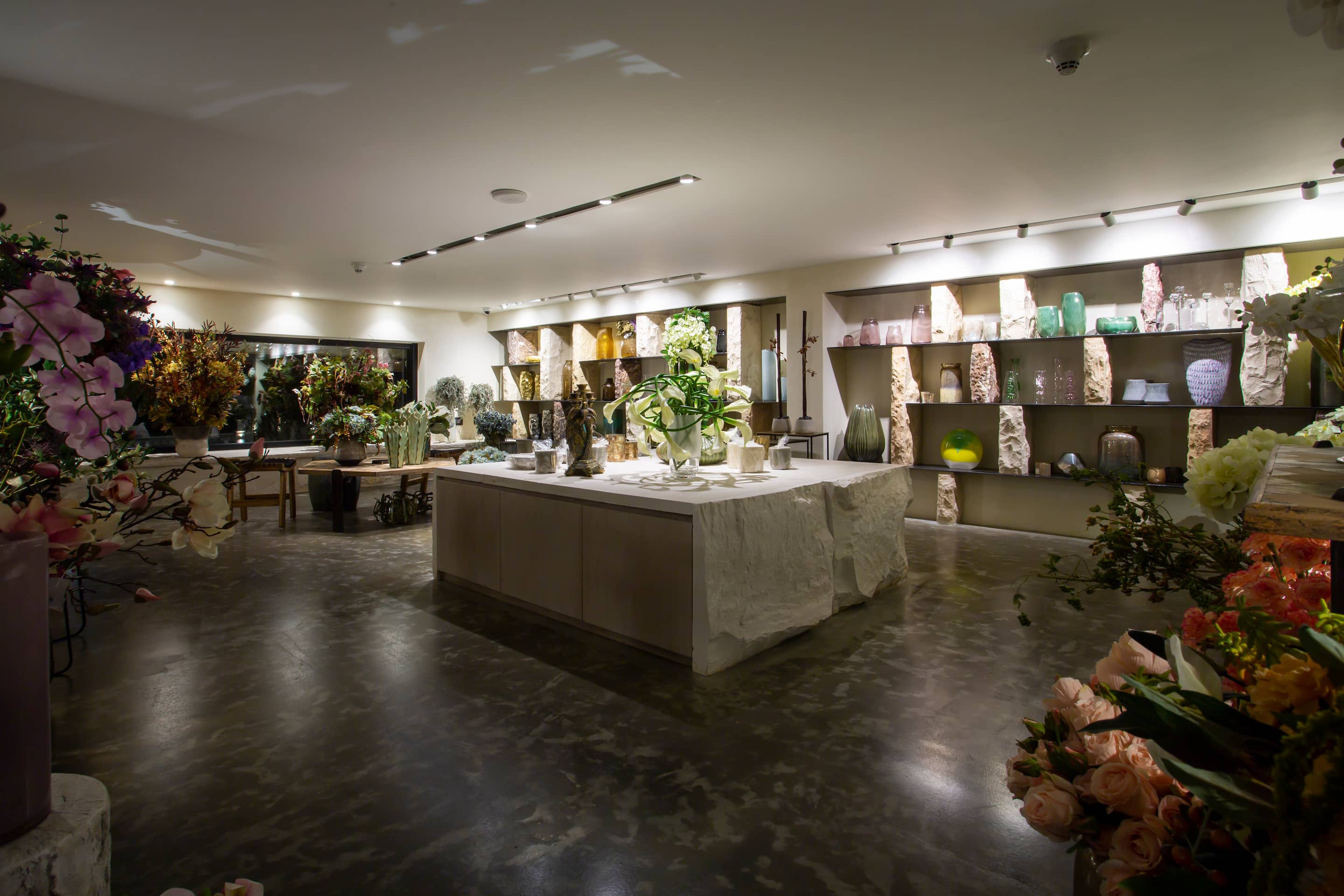 Inside, the space departs from conventional retail typology. It is envisioned as a curated terrain—a constructed landscape made of white limestone monoliths, quarried in large blocks and left in a raw split-face finish. These elements reach a uniform height of one meter and serve various functions, from display platforms to reception surfaces. Raw, untreated wood is introduced as a complementary material, most notably in the form of a single irregular log whose organic texture contrasts the formality of stone and recalls the lifecycle of the flowers themselves.