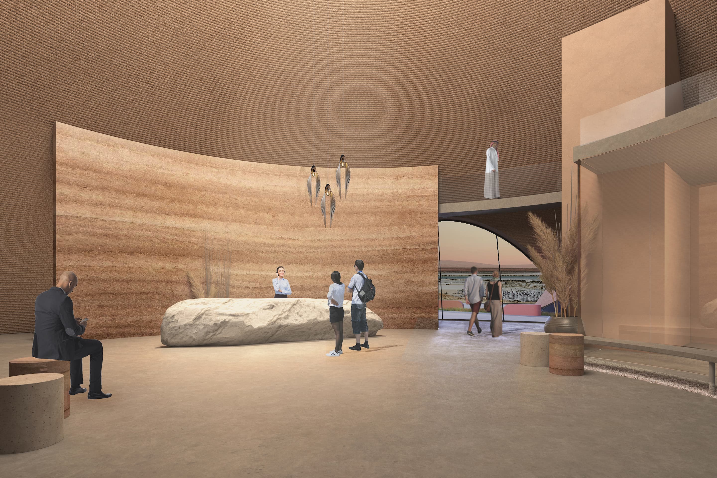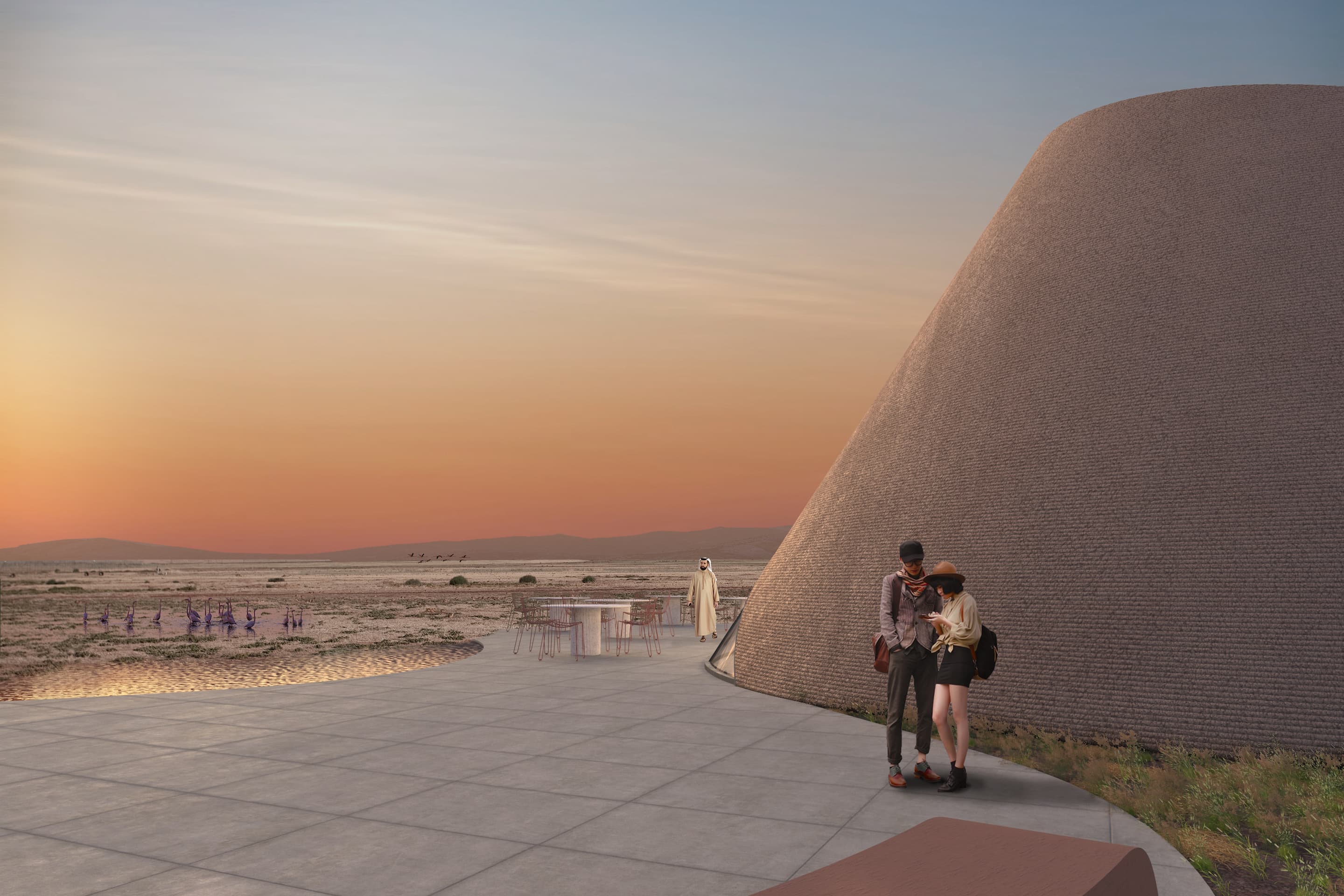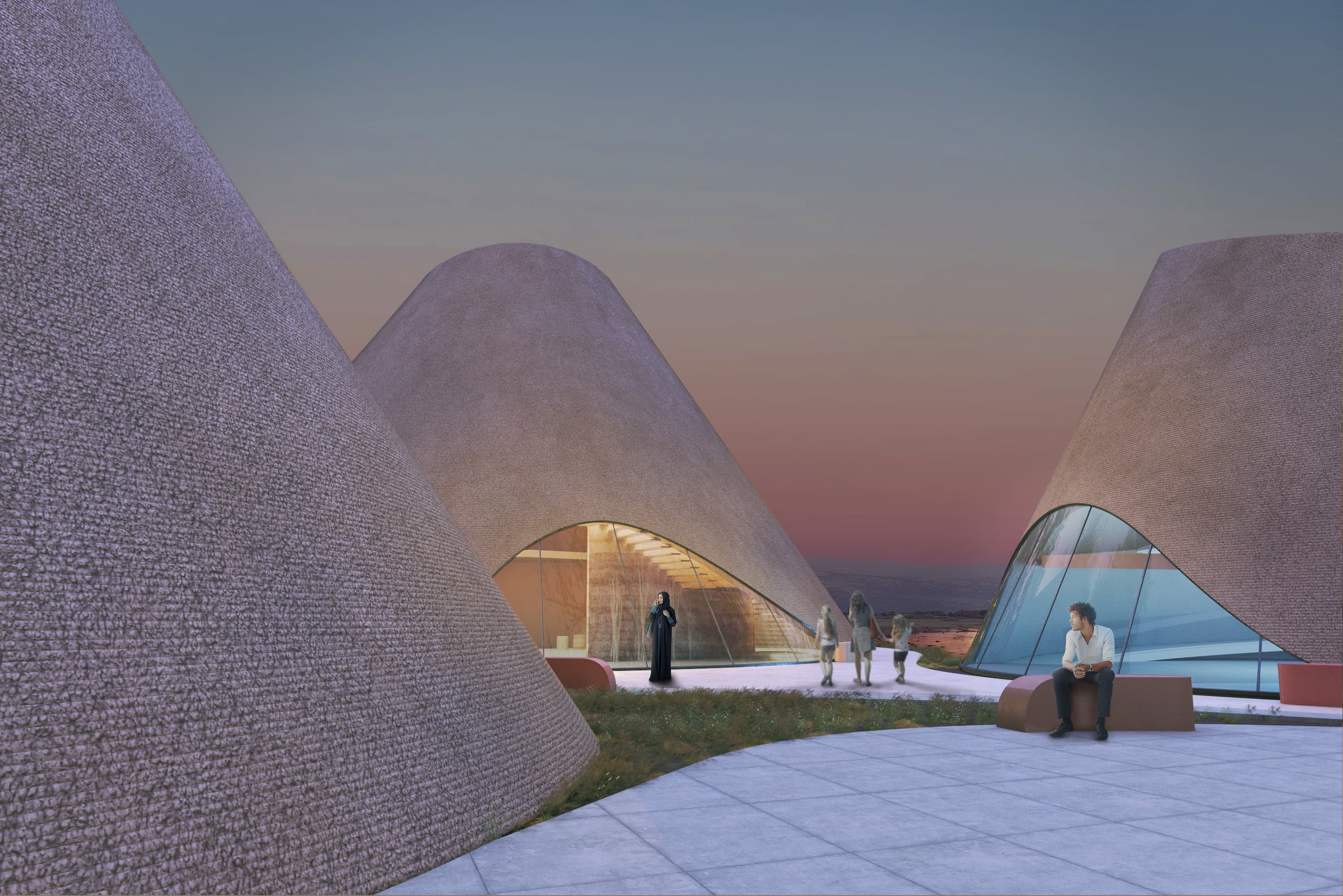 Each cone houses a distinct function—exhibition, administration, and visitor amenities—and is built using a 3D-printed mix of mud, rice husk, and straw. This low-energy material improves thermal performance, blends with the terrain, and reduces reliance on mechanical cooling. Strategic openings, skylights, and photochromic glazing enhance daylight and natural ventilation.