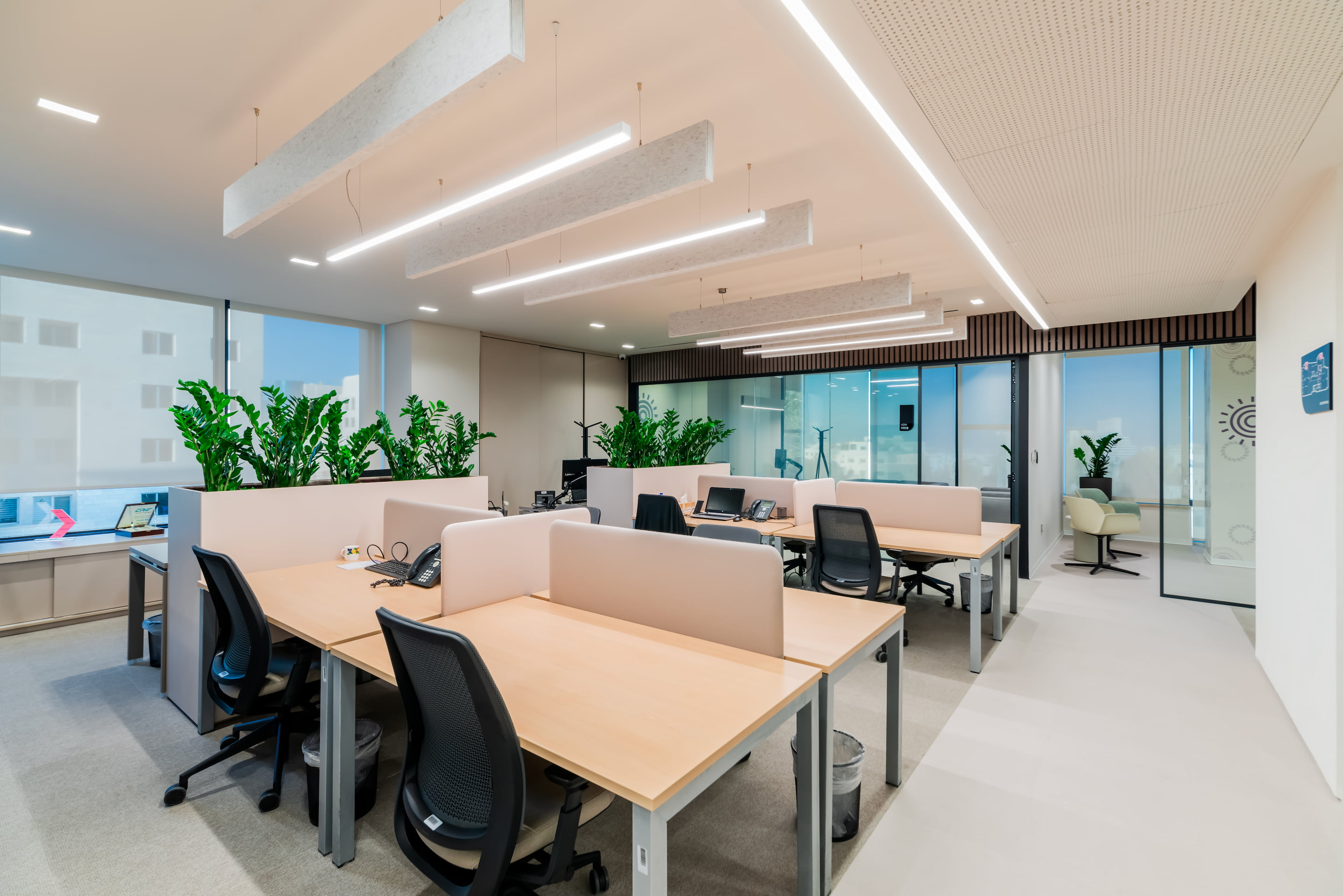 The Invest Bank Headquarters in Shmeisani was designed as a contemporary institutional workplace that reflects the bank’s identity while supporting a flexible and collaborative work culture. The spatial planning balances efficiency, privacy, and openness, creating an environment suited to both focused tasks and team interaction.