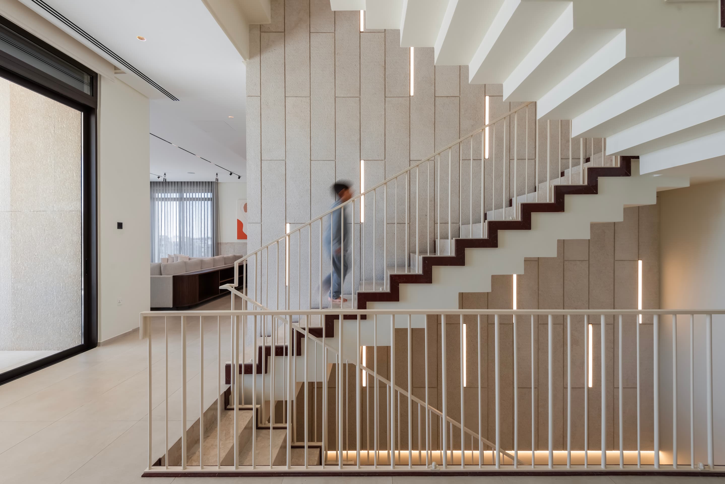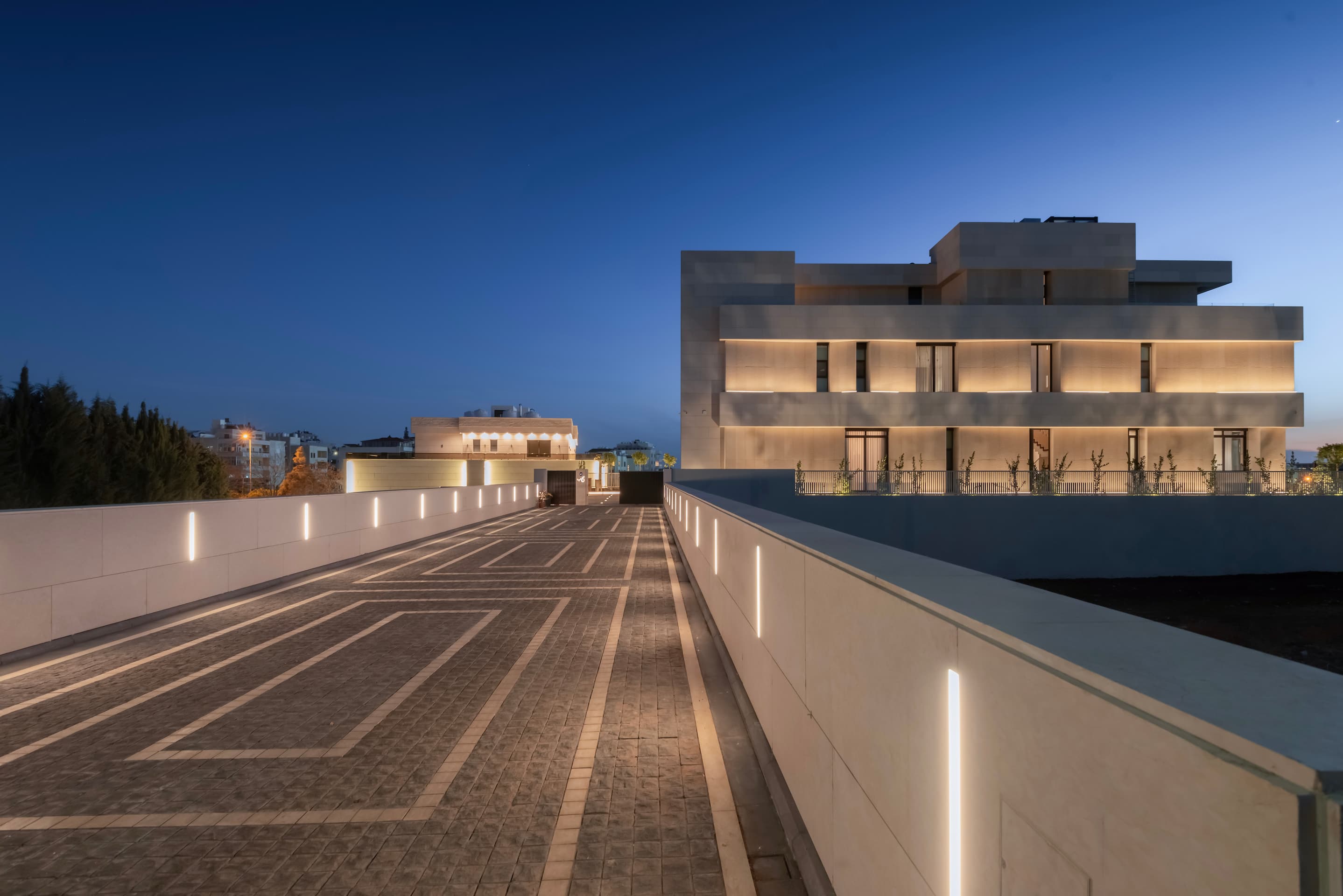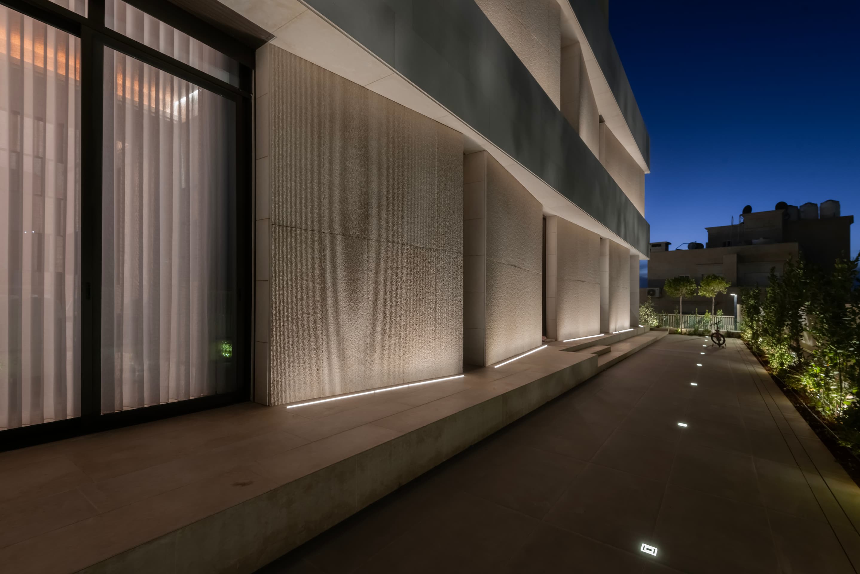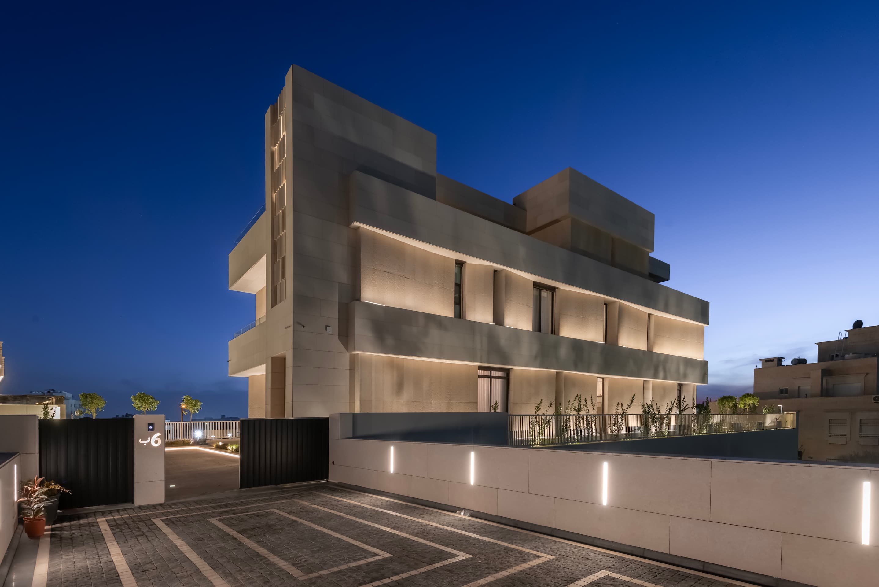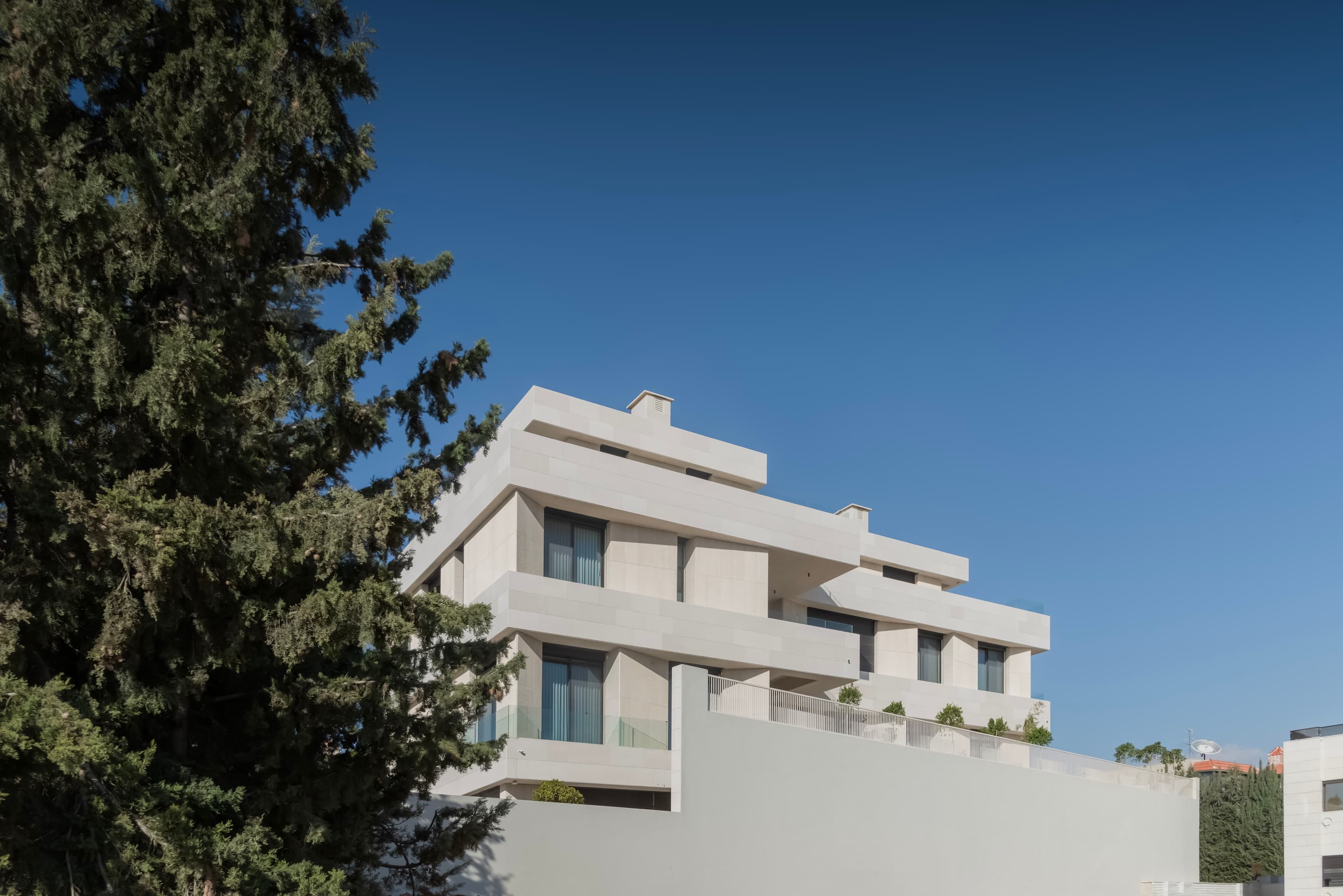 Located on elevated terrain, J Residence embraces a thoughtful approach to domestic architecture through layered massing, materials, and spatial program. Designed for an extended family, the house spans four levels—basement, ground floor, first floor, and roof—each tailored to its specific function and orientation. The façade balances horizontal and vertical elements using polished and fluted Jerusalem stone, creating a dynamic play of light and texture that anchors the home in its regional context.