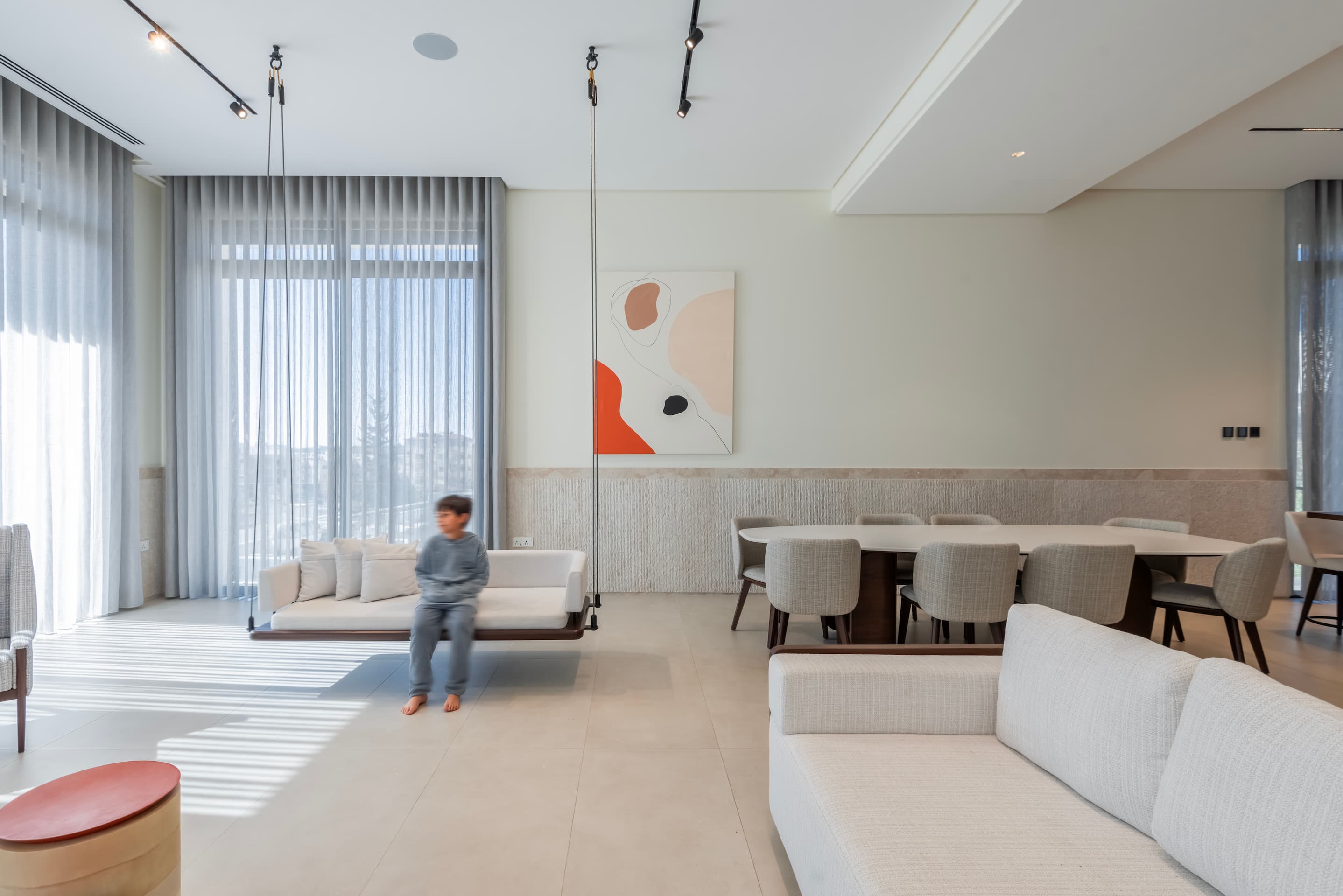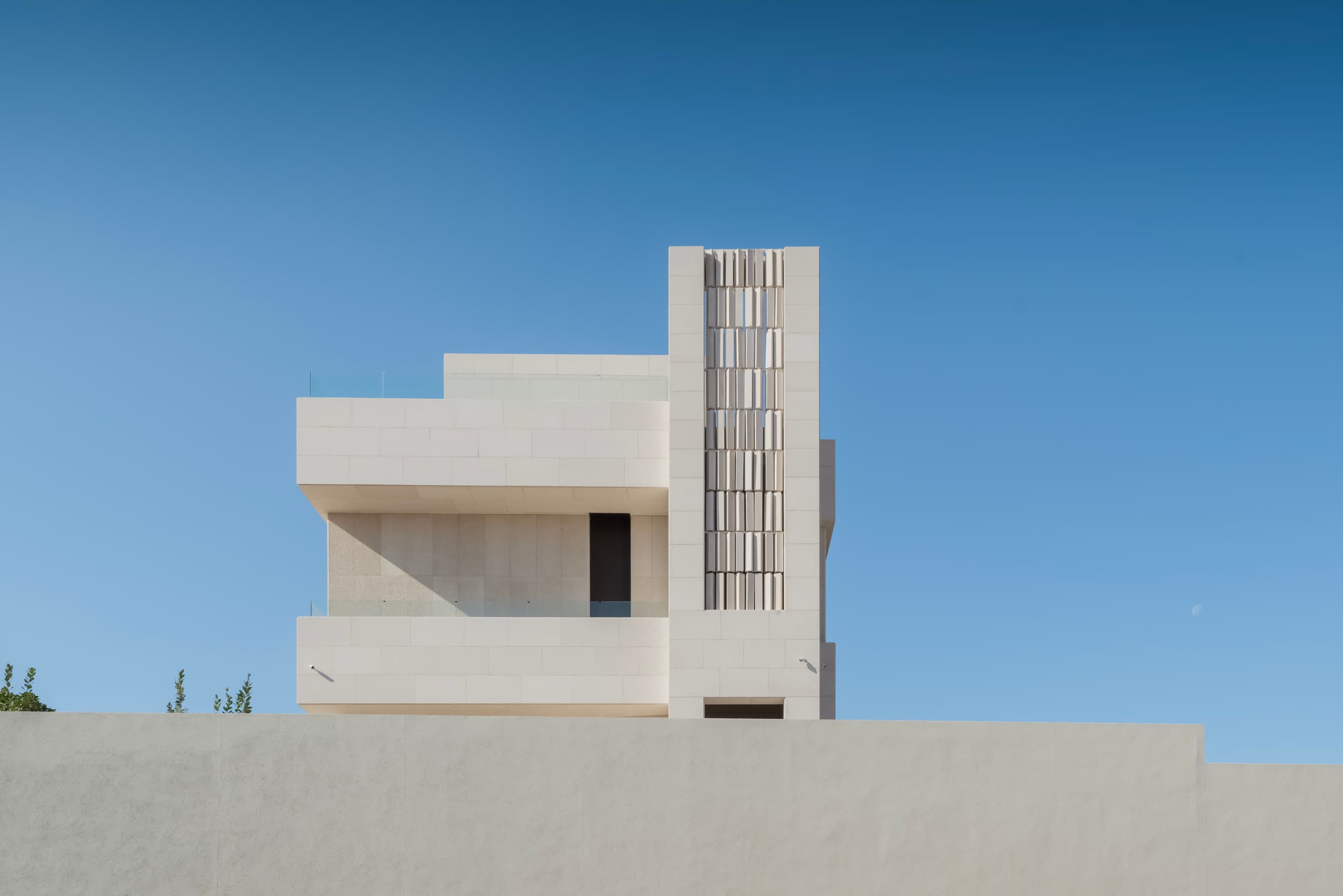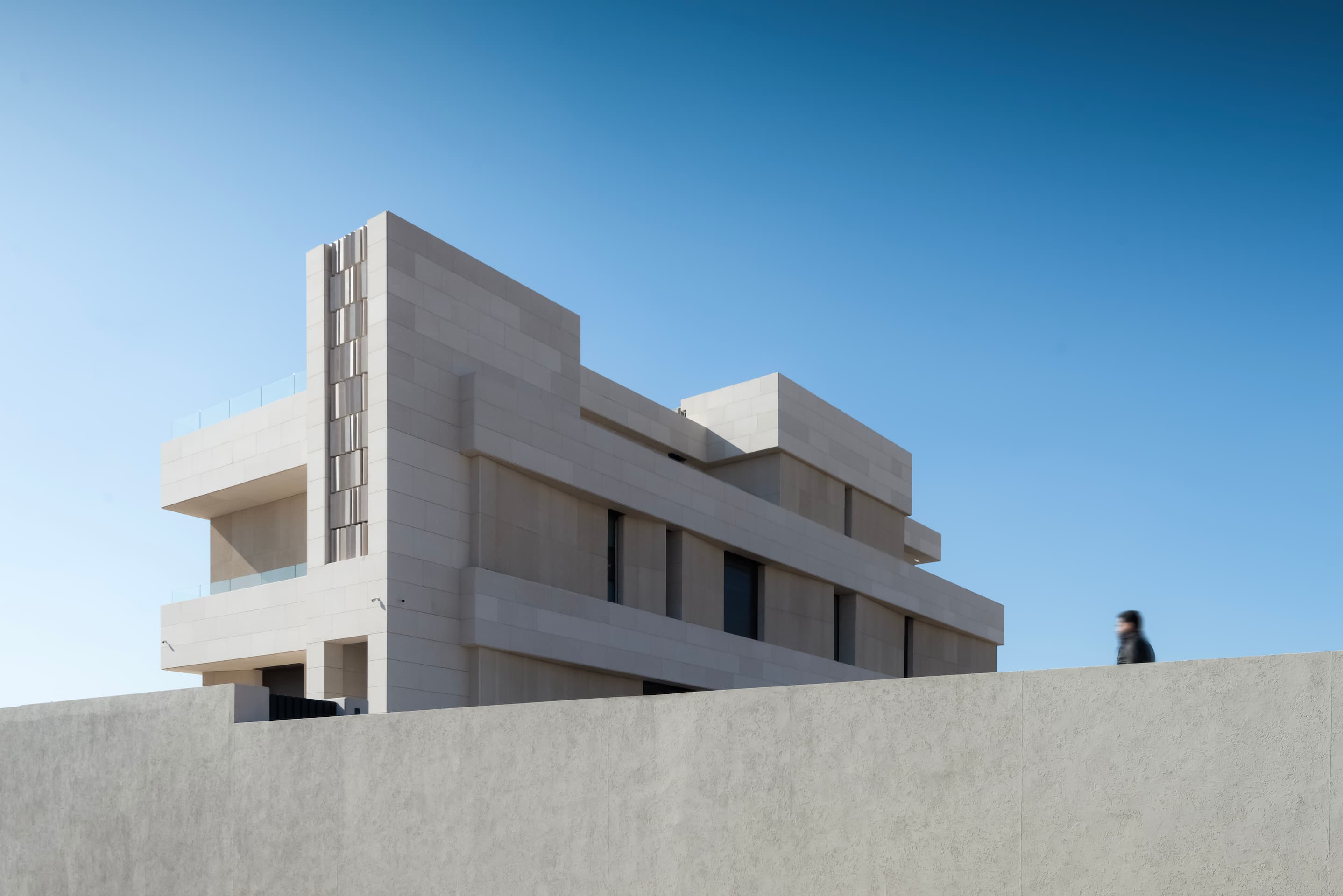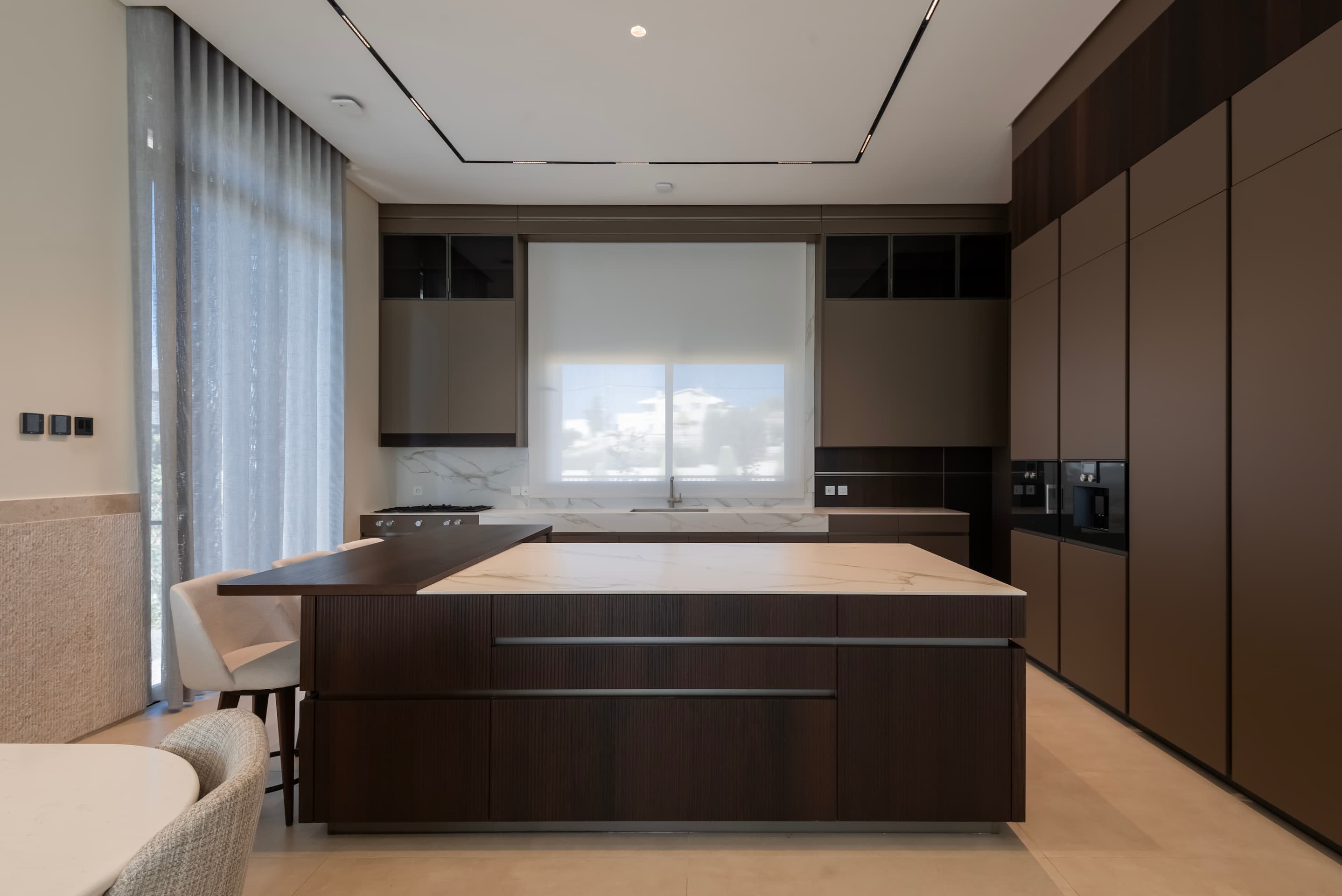 Located on elevated terrain, J Residence embraces a thoughtful approach to domestic architecture through layered massing, materials, and spatial program. Designed for an extended family, the house spans four levels—basement, ground floor, first floor, and roof—each tailored to its specific function and orientation. The façade balances horizontal and vertical elements using polished and fluted Jerusalem stone, creating a dynamic play of light and texture that anchors the home in its regional context.