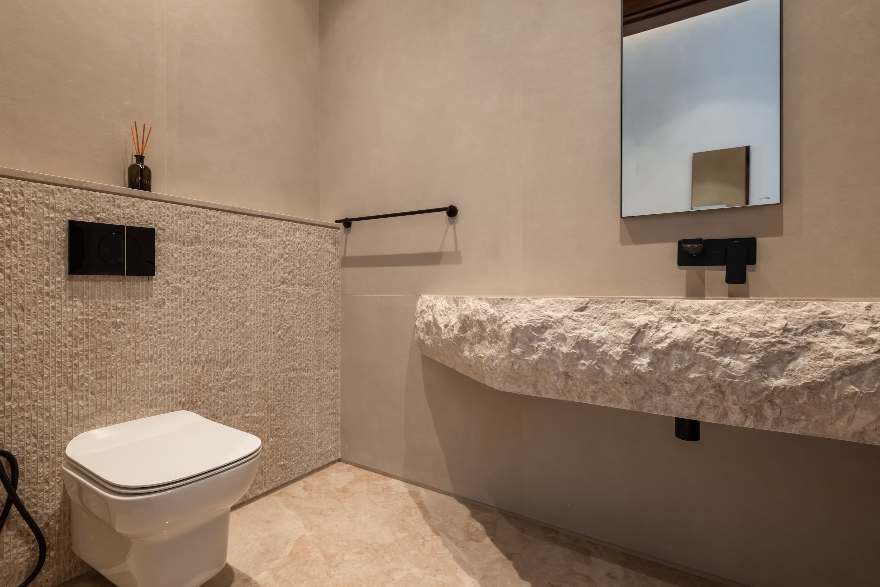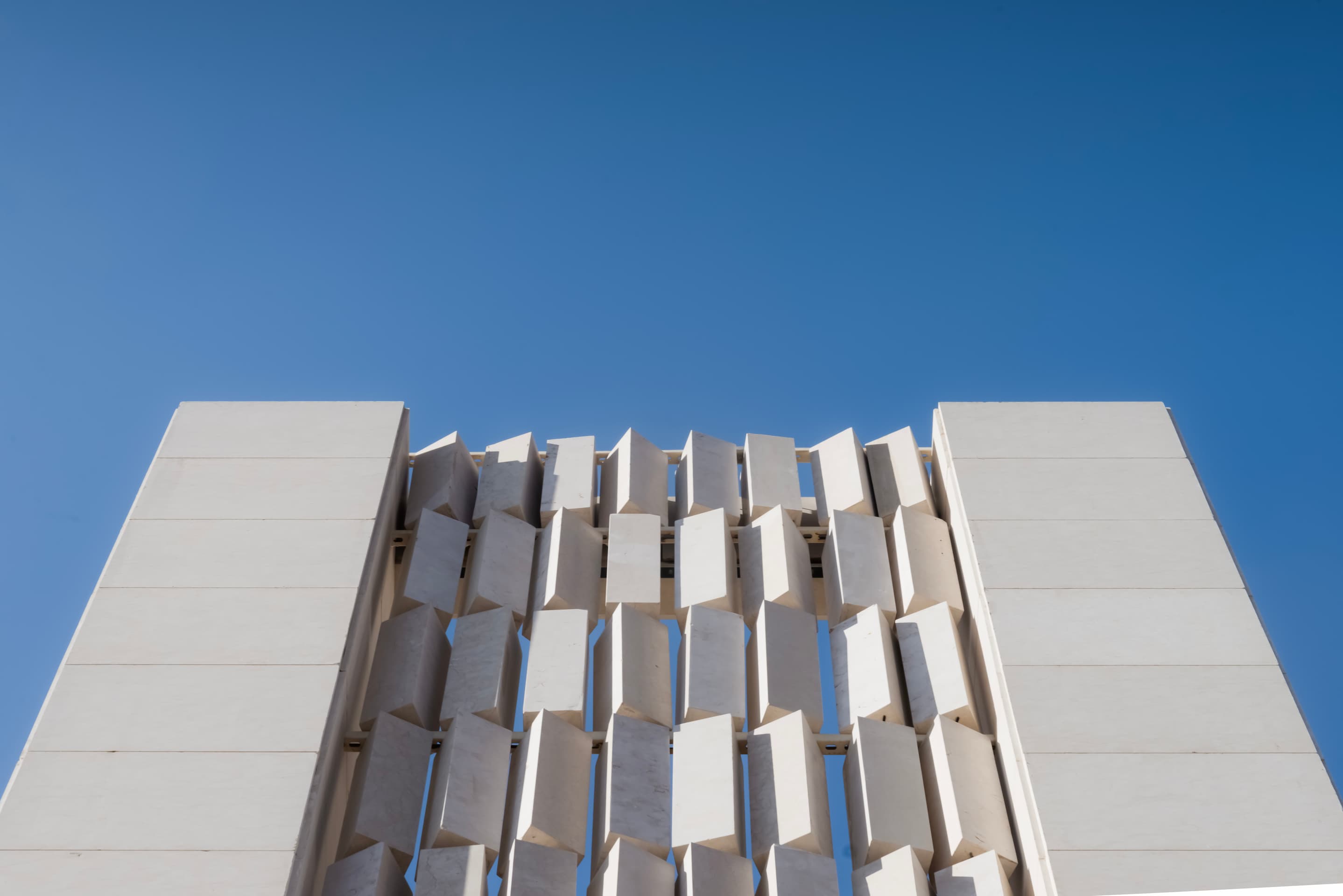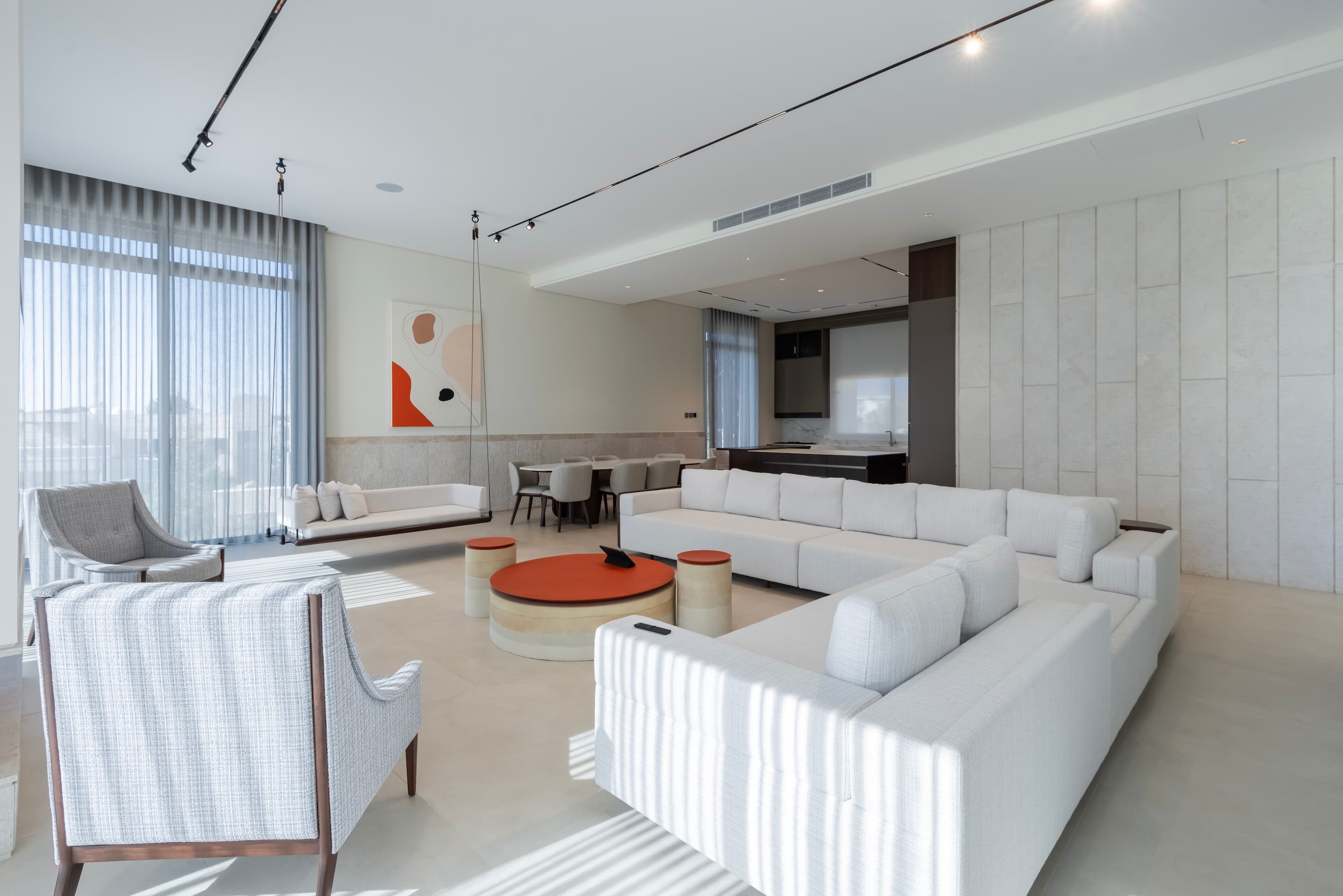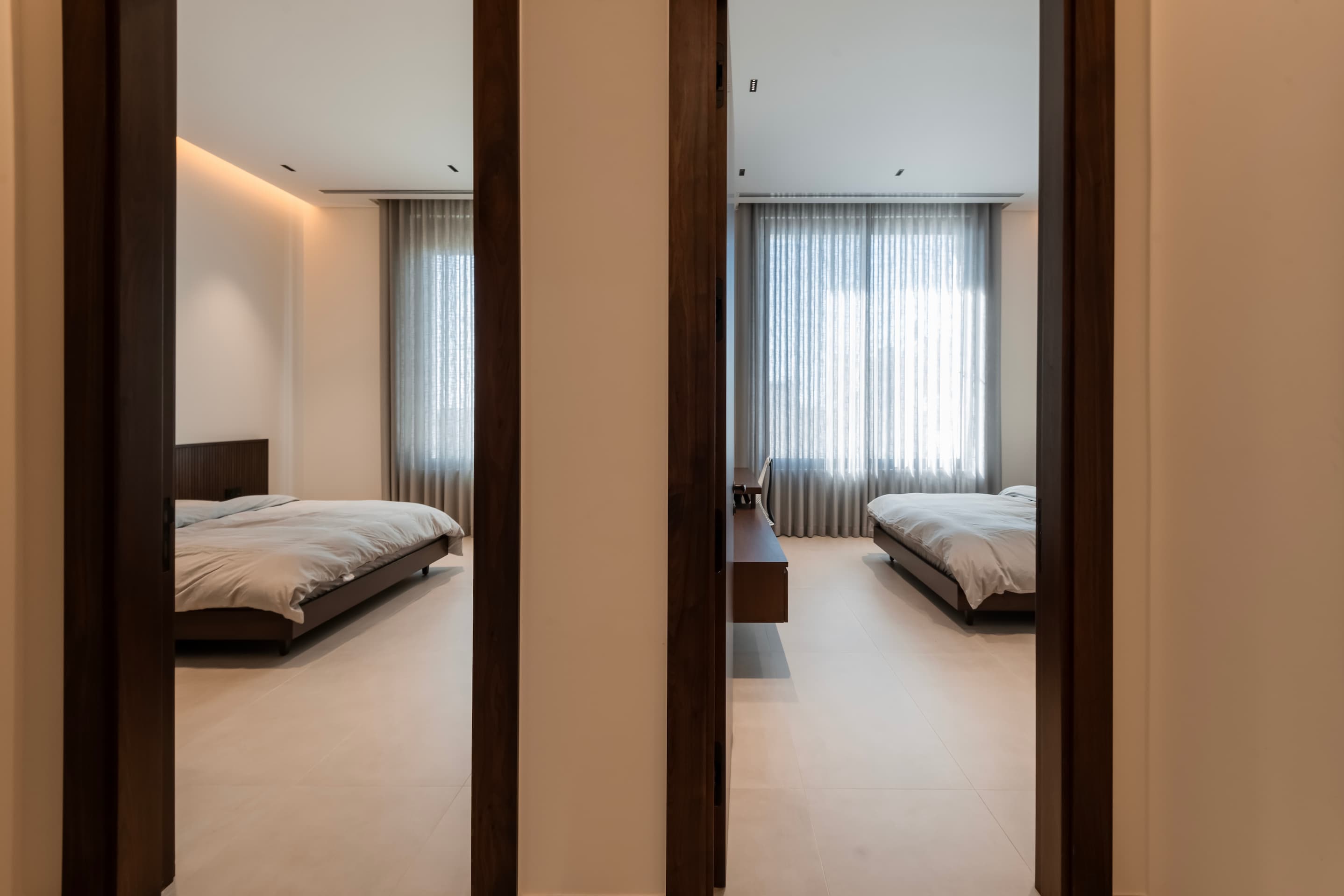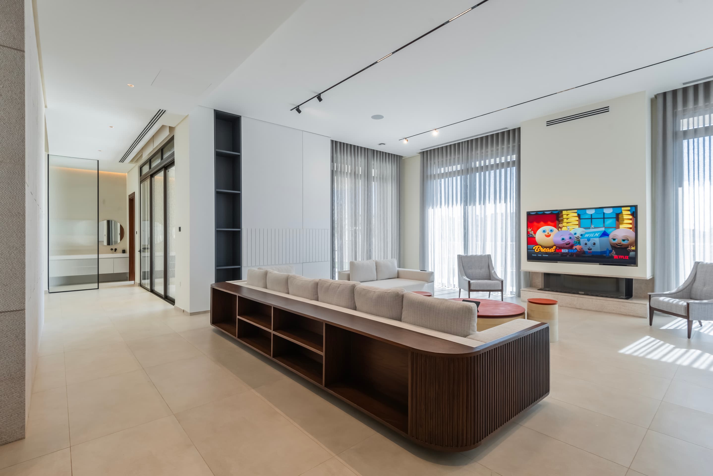 Located on elevated terrain, J Residence embraces a thoughtful approach to domestic architecture through layered massing, materials, and spatial program. Designed for an extended family, the house spans four levels—basement, ground floor, first floor, and roof—each tailored to its specific function and orientation. The façade balances horizontal and vertical elements using polished and fluted Jerusalem stone, creating a dynamic play of light and texture that anchors the home in its regional context.