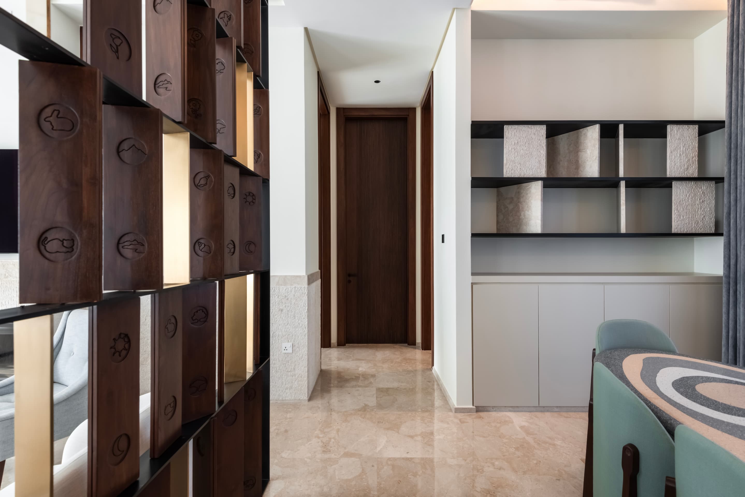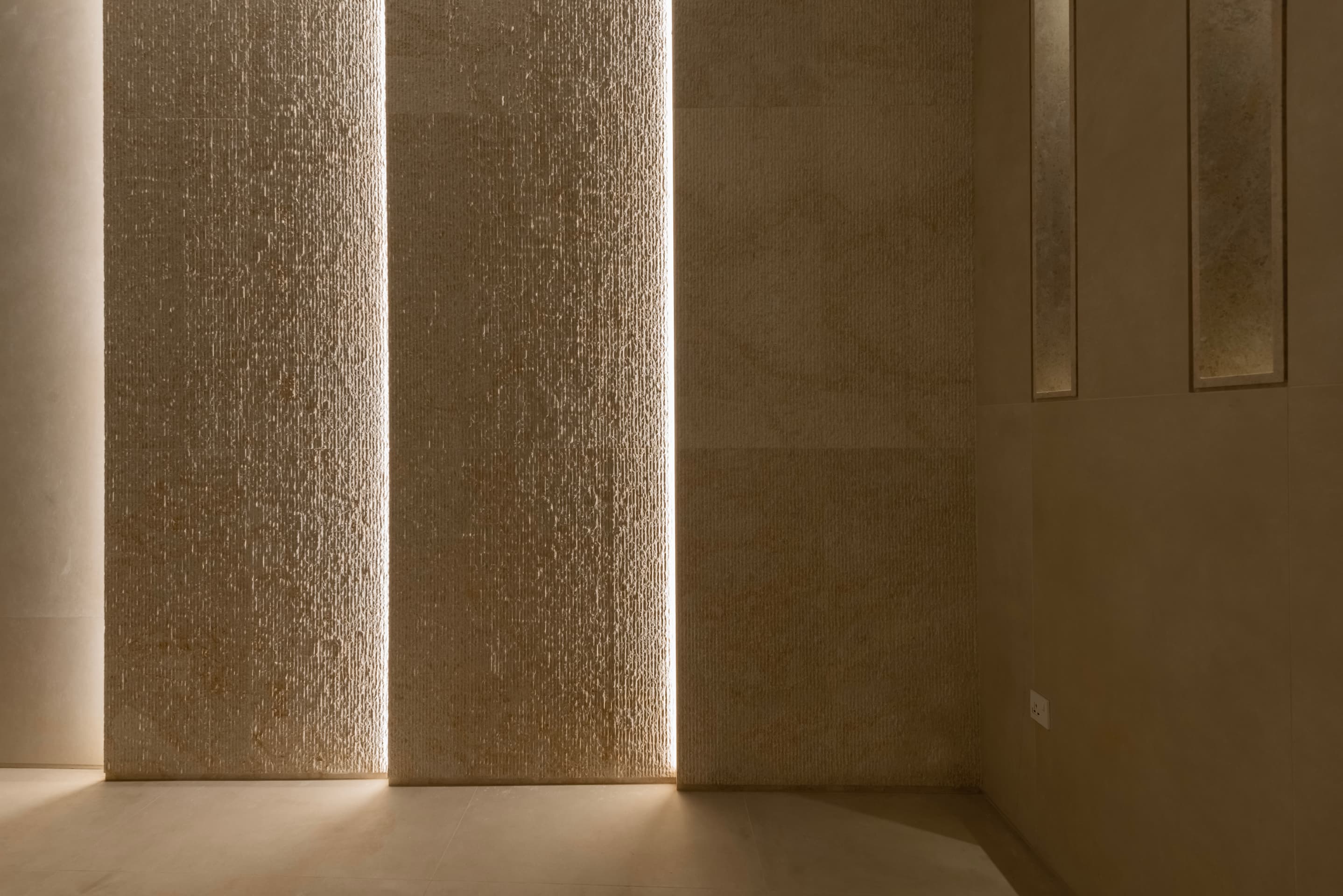 The entrance disrupts this horizontal flow with a vertical incision formed by narrow stone fins that filter daylight and create a subtle threshold between inside and outside. Inside, the ground floor is arranged along a privacy gradient with formal guest areas near the entrance, including a dining and reception room anchored by a stone hearth. Deeper into the plan, private family spaces unfold with living and dining areas connected to both show and service kitchens. The design favors layered adjacencies over linear flow to allow fluid yet distinct zones