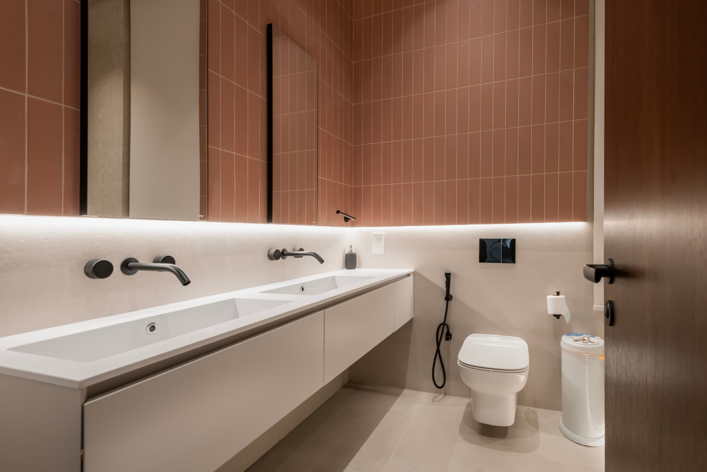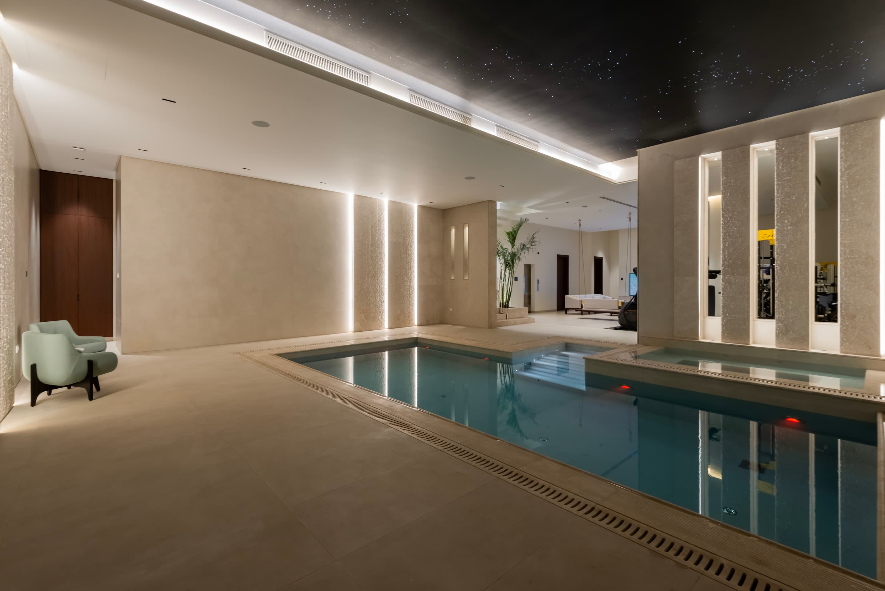 The basement serves as a retreat embedded into the landscape, centered around an indoor pool enclosed by full-height glazing that brings the garden inside. Adjacent to the pool are wellness and leisure areas including a gym and lounge, supported by discreet back-of-house functions. Vertical circulation is marked by a marble-clad staircase with red stone accents. Upstairs, a lounge divides five private bedrooms each with en-suite bathrooms. The roof level houses two additional bedrooms and a lounge opening onto a continuous terrace that balances enclosure and open sky.