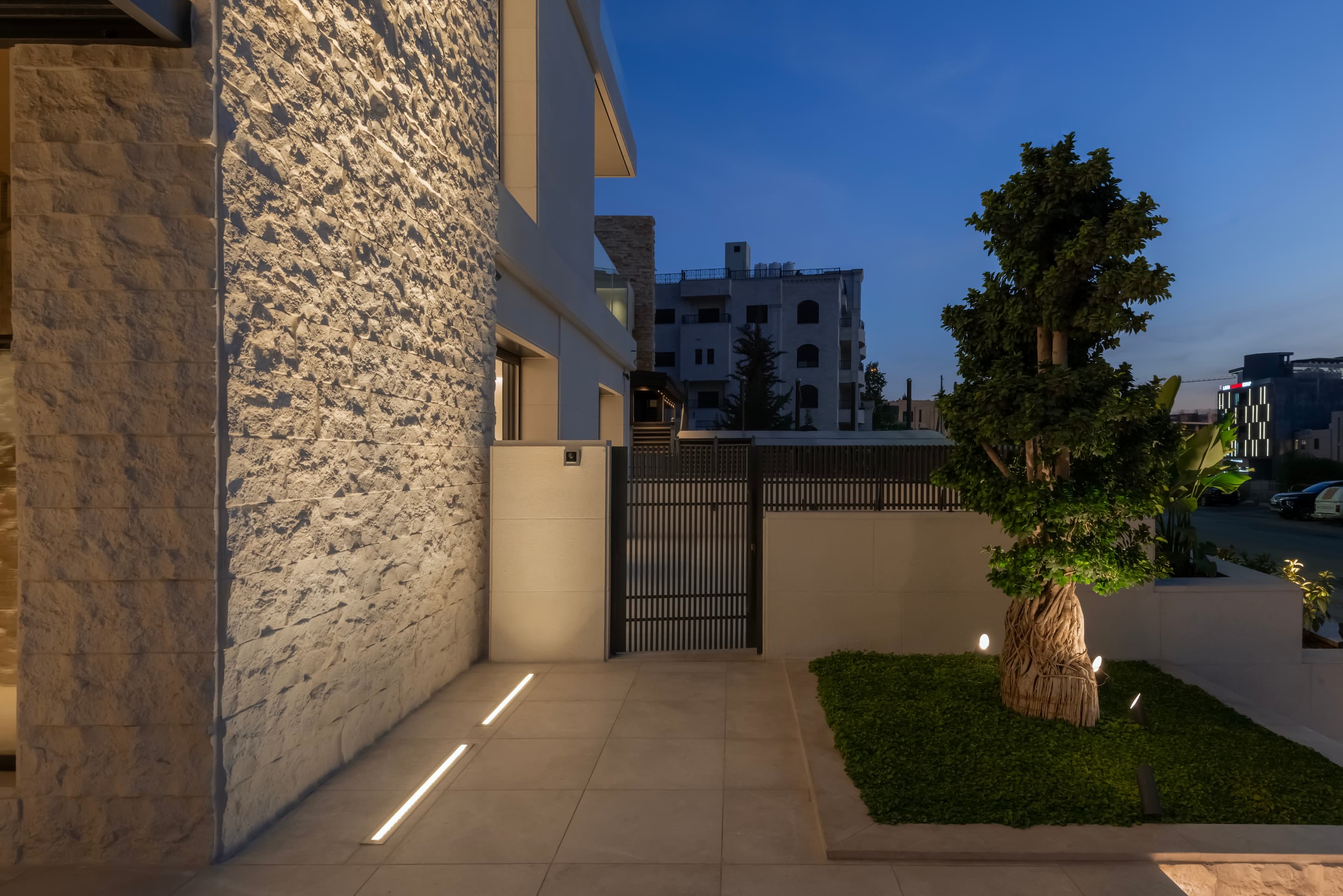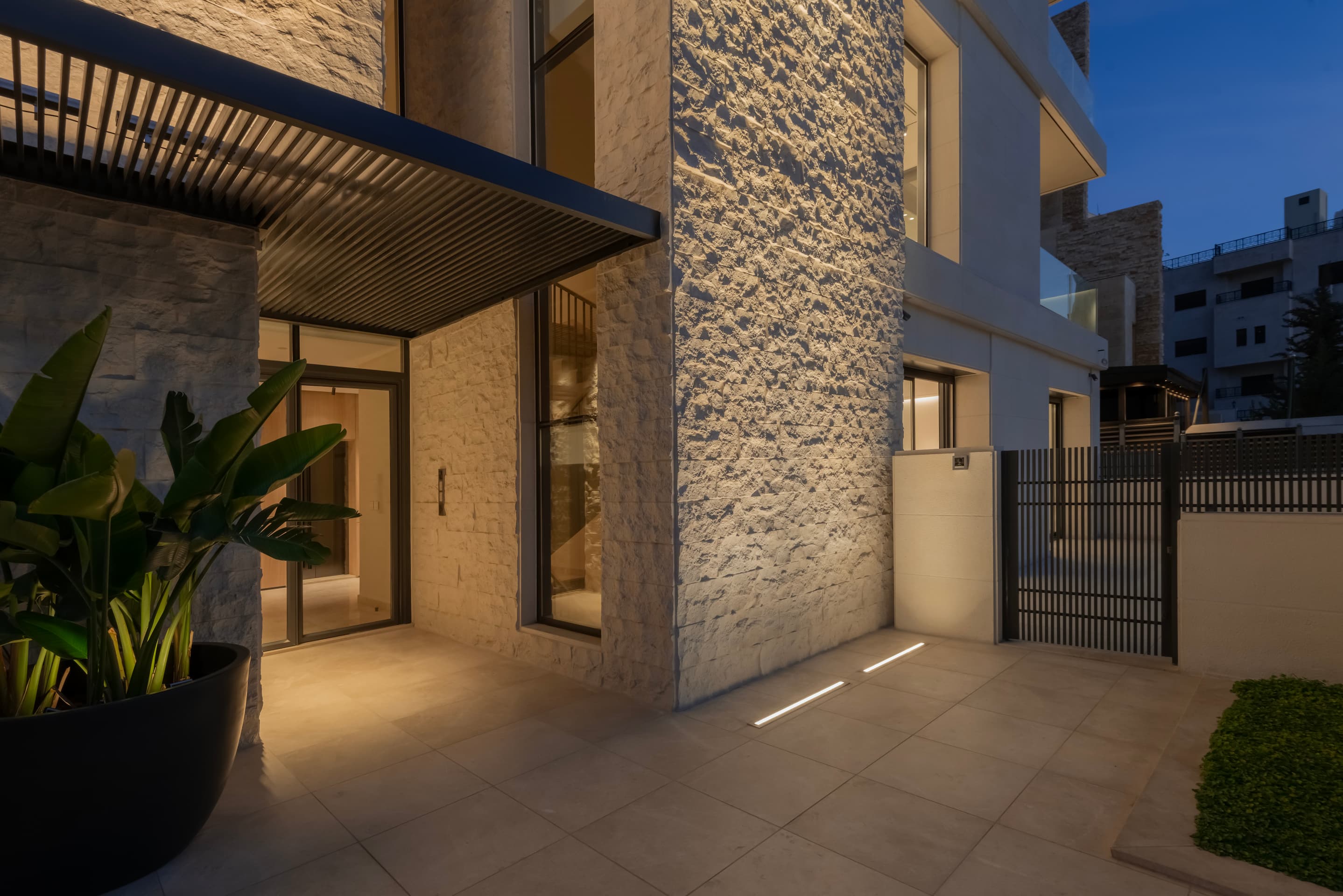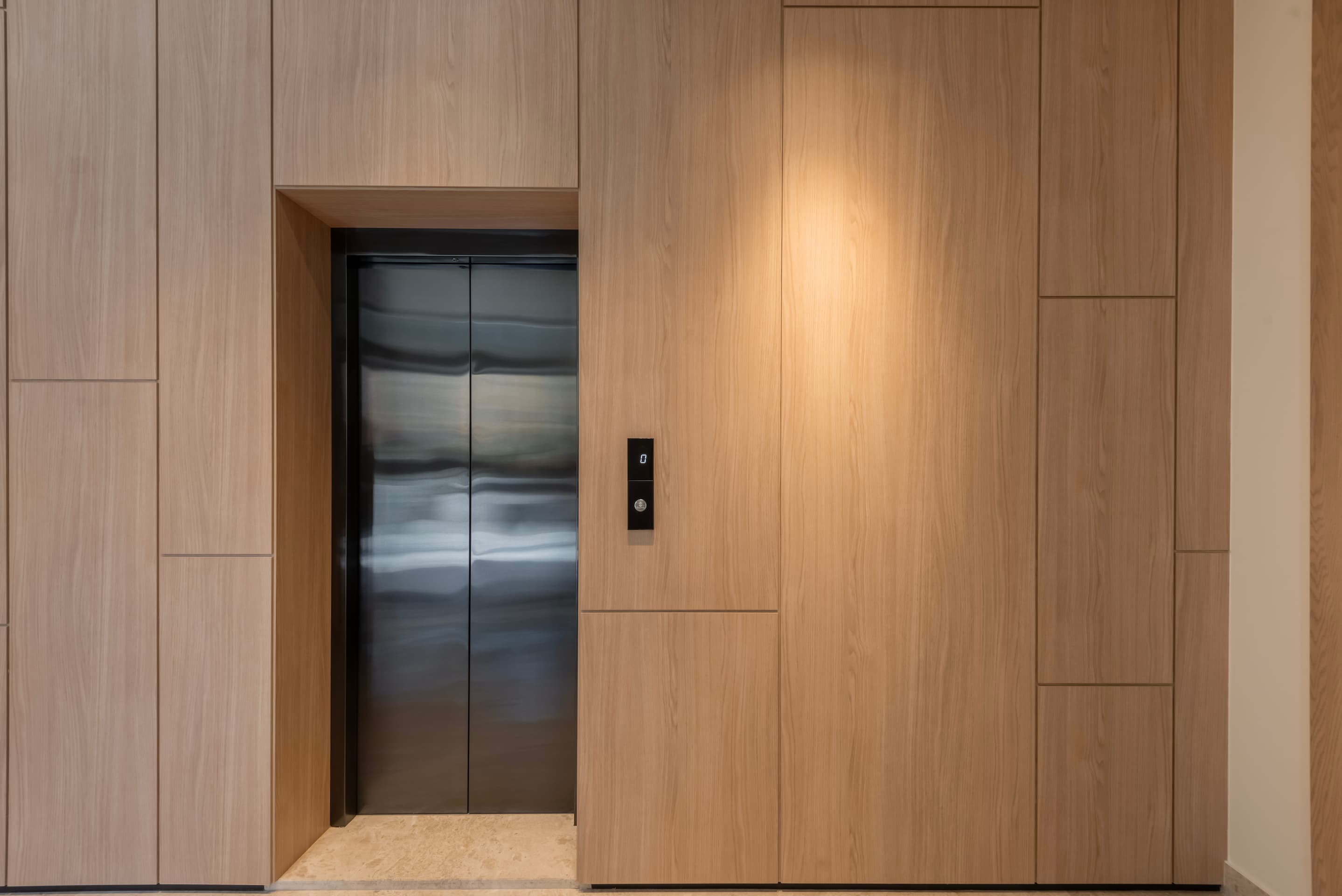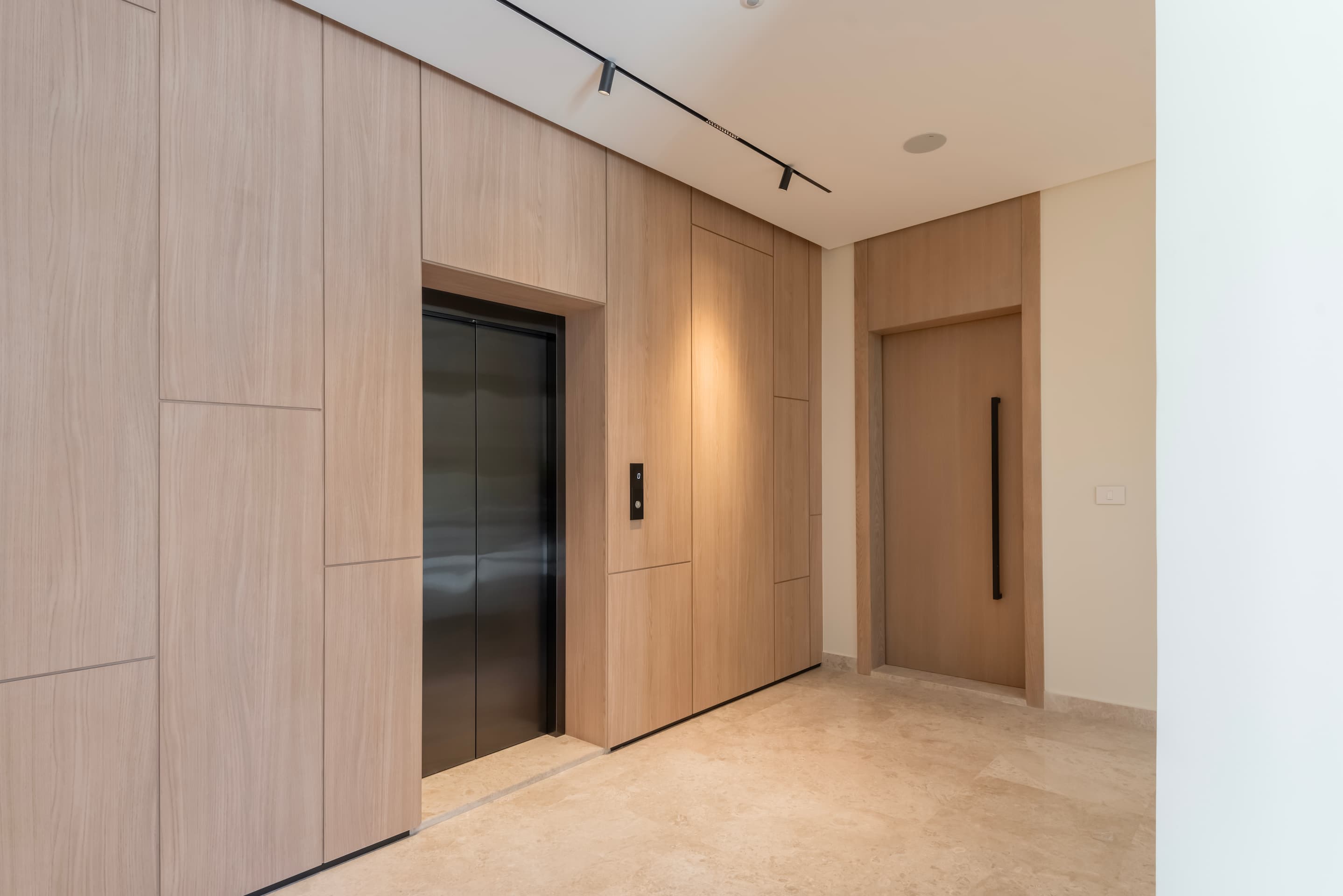 Interior materials—stone, wood, and plaster—create a refined, tactile atmosphere. Polished Omani marble defines the entrance and stair, while French oak in the elevator cladding and full-height doors adds warmth to shared spaces. A gentle lateral shift in the primary façade subtly elongates the building’s visual reading while maintaining the discipline of the structural grid.