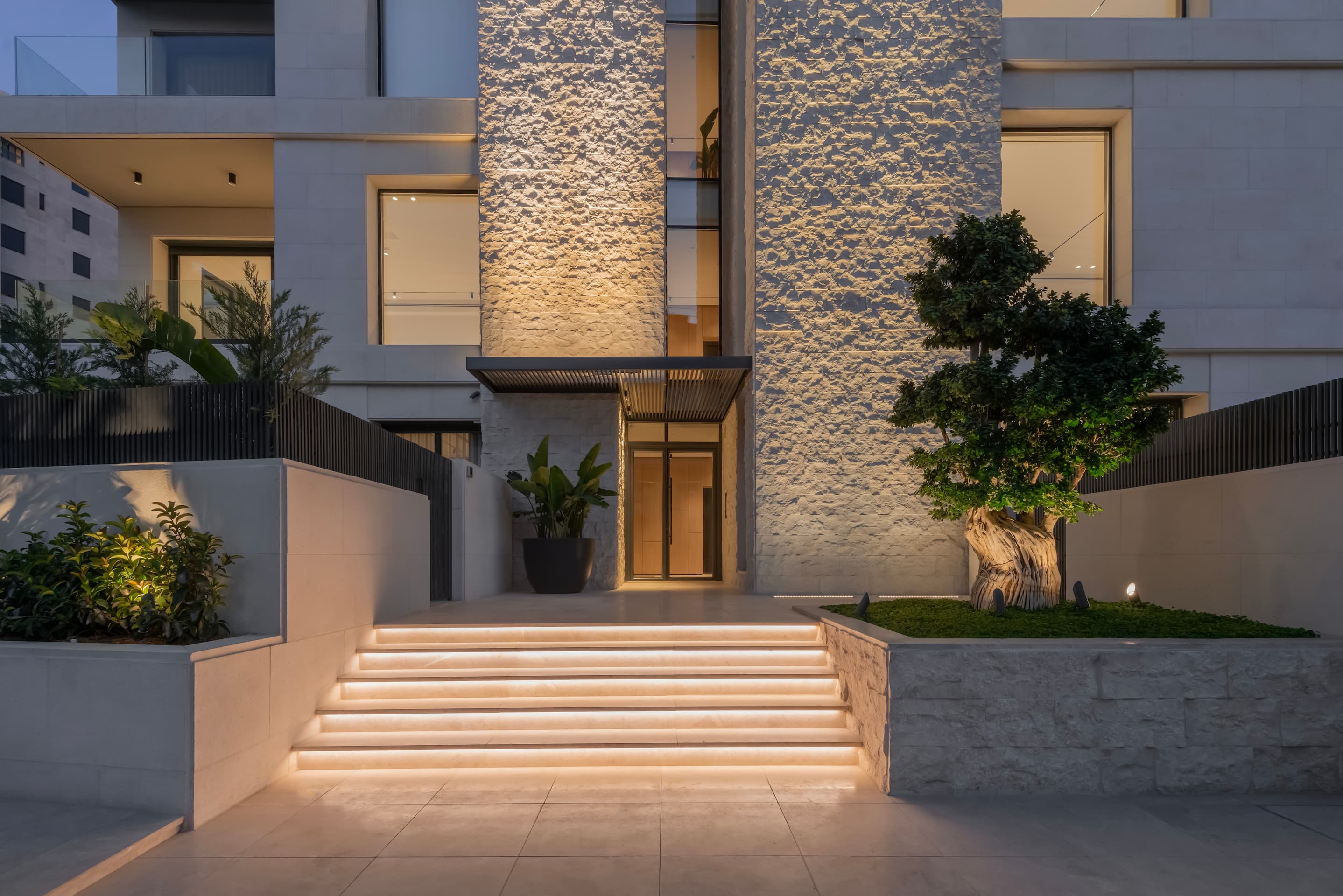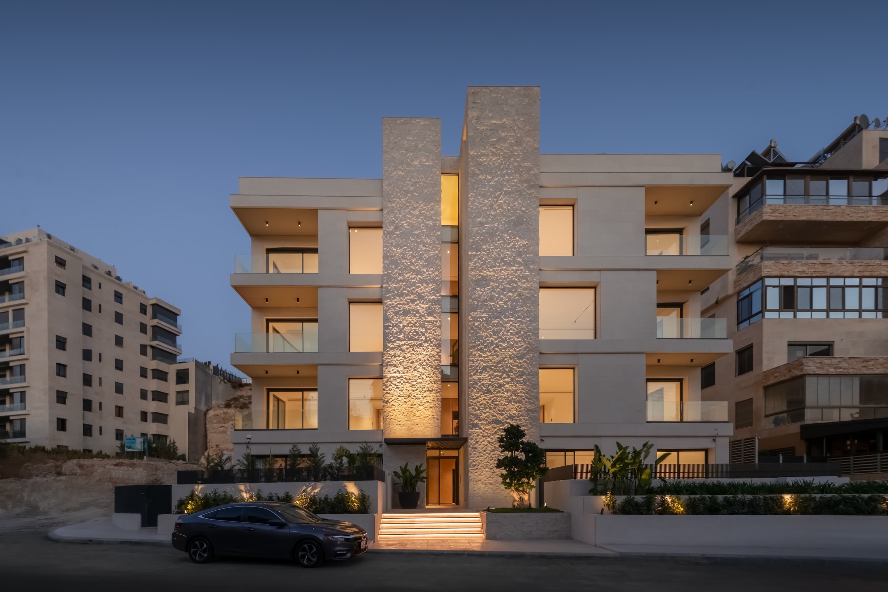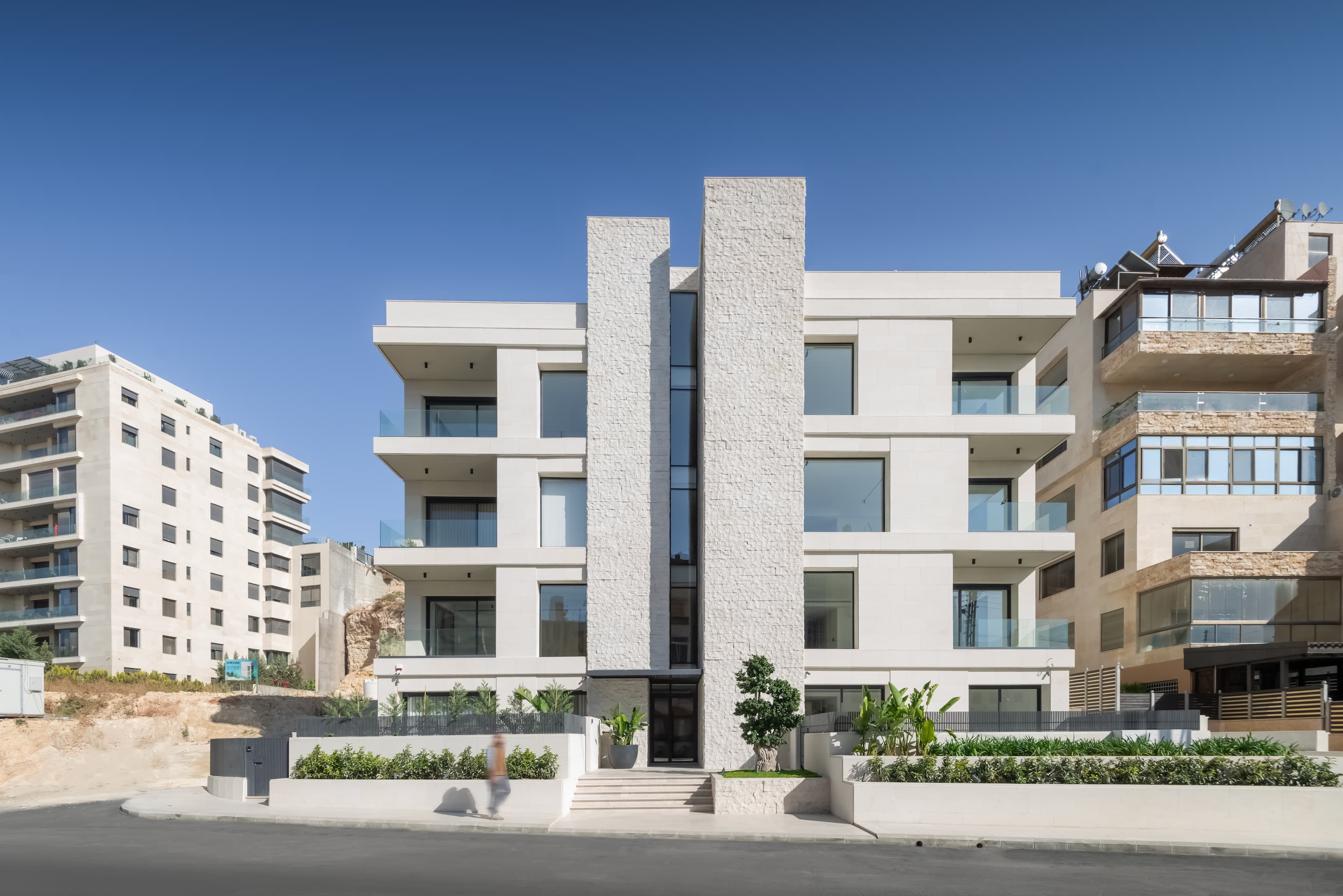 The building is composed of three key elements: a cubic envelope clad in bush-hammered white Maani stone, horizontal floor plate extrusions that reveal the layered program, and a vertical circulation core finished in split-face Maani stone. Using two finishes of the same material creates a subtle tectonic dialogue as light and shadow shift across the façade.