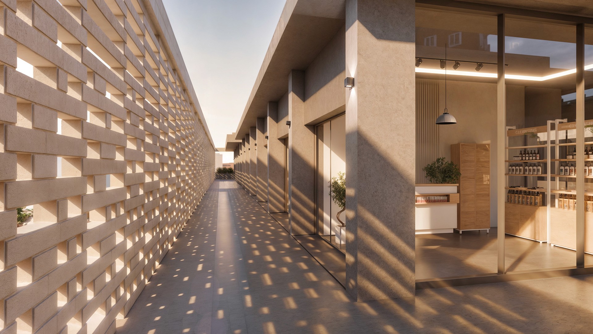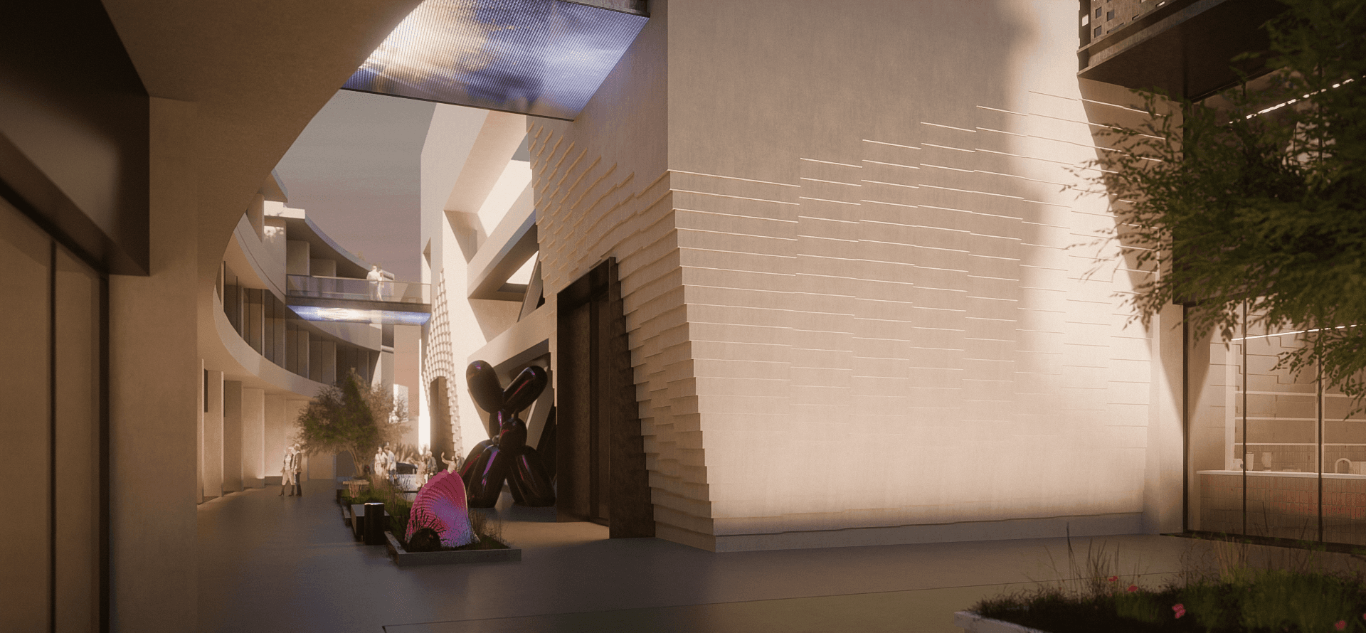 By combining a rigorous conceptual framework, material duality, environmental responsiveness, and a sculptural subtractive approach, the design transforms the mall into a layered urban interior that harmonizes circulation, light, landscape, and human experience within its contextual and functional parameters.