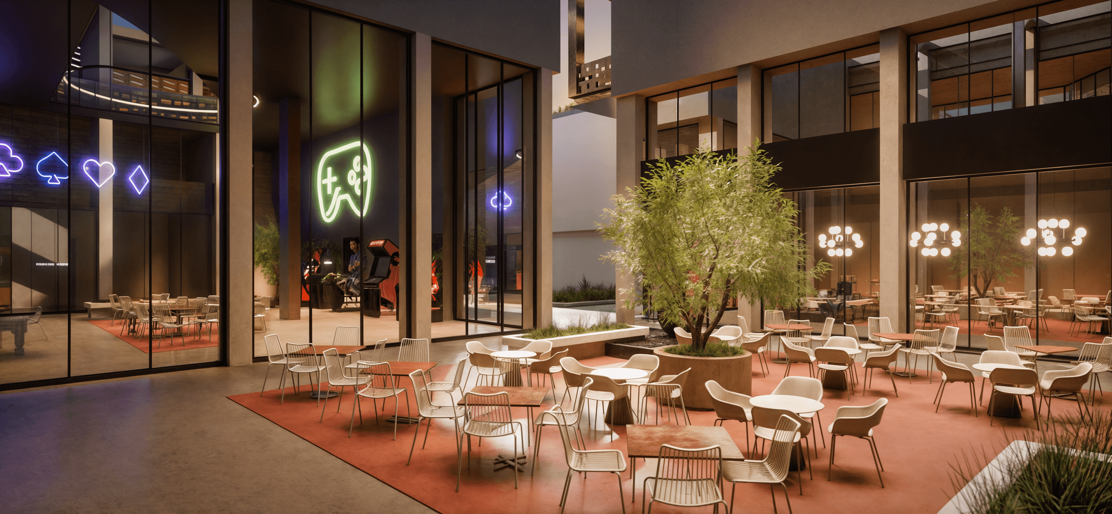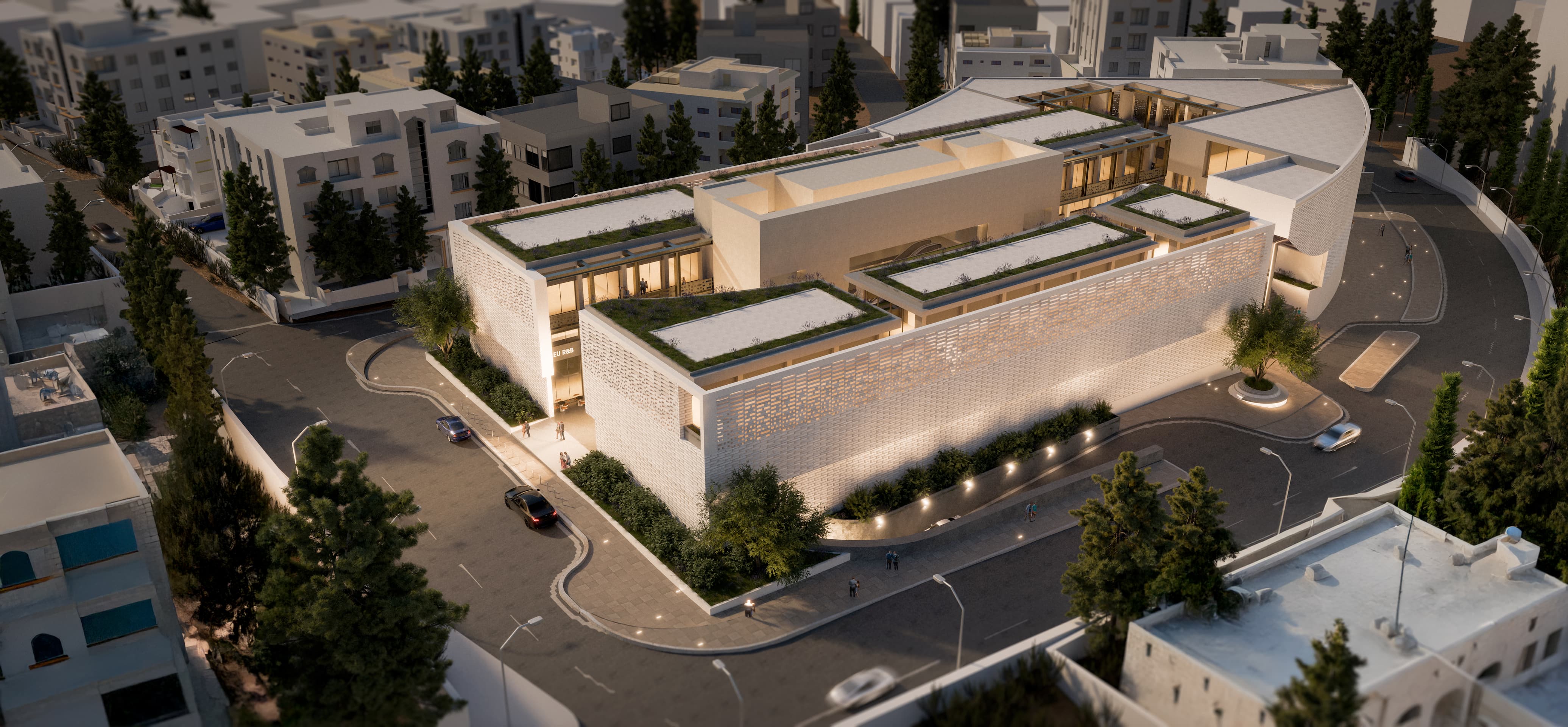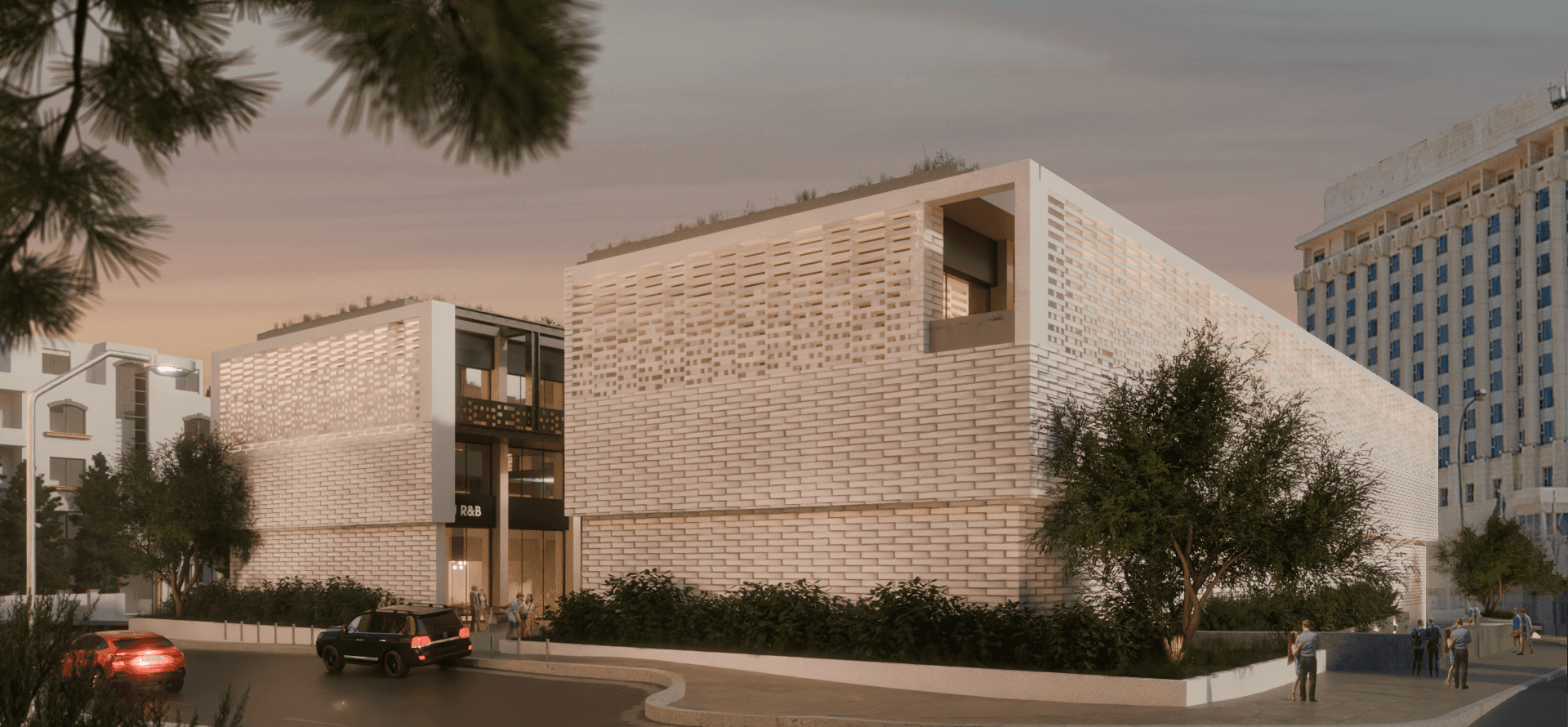 The design employs a subtractive process, carving the monolithic building mass to reveal interconnected courtyards, circulation pathways, and visual corridors. Upper-level stone screens filter light and create semi-private experiences, while perpendicular carving and bridging of volumes generate continuity and layered spatial interactions.