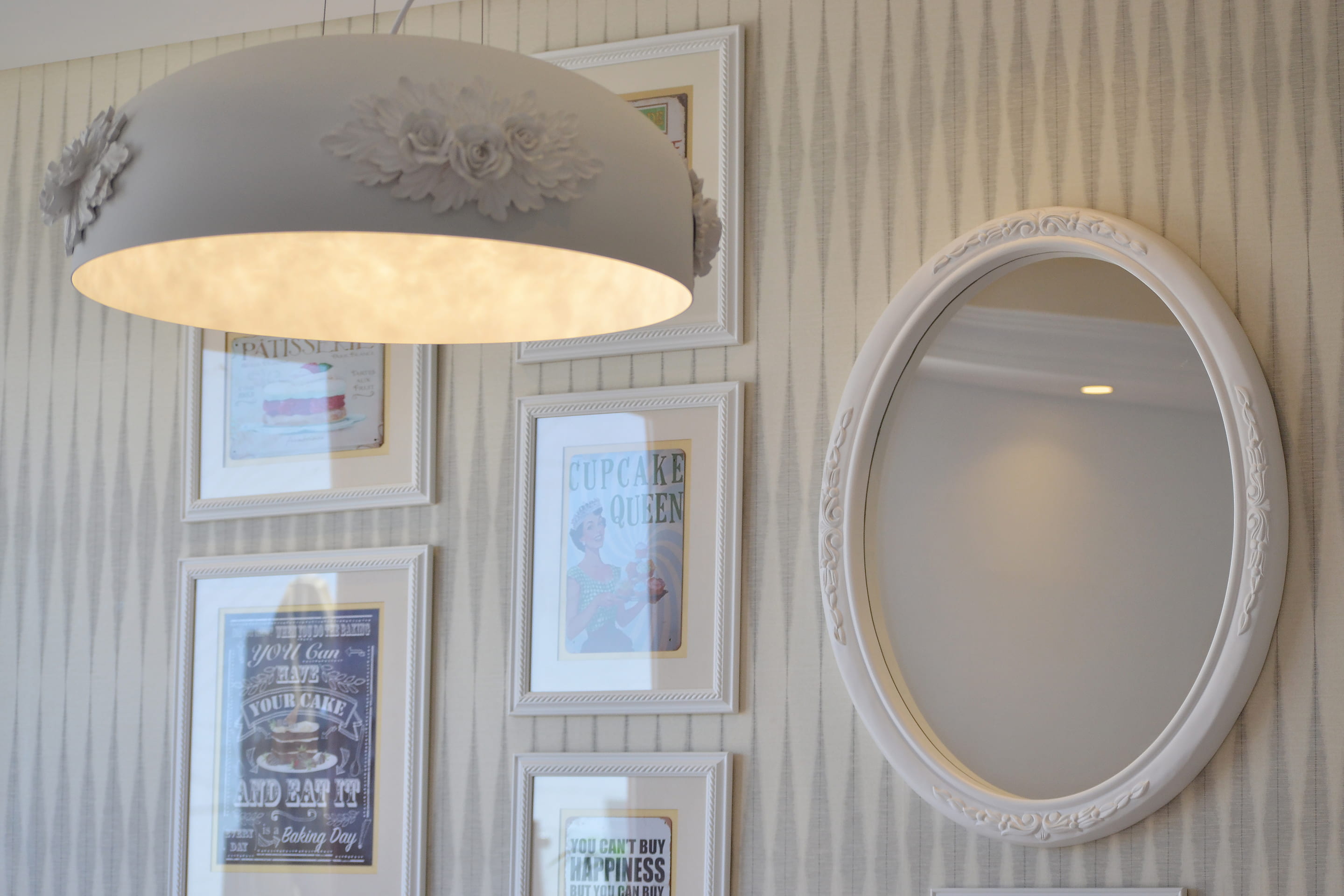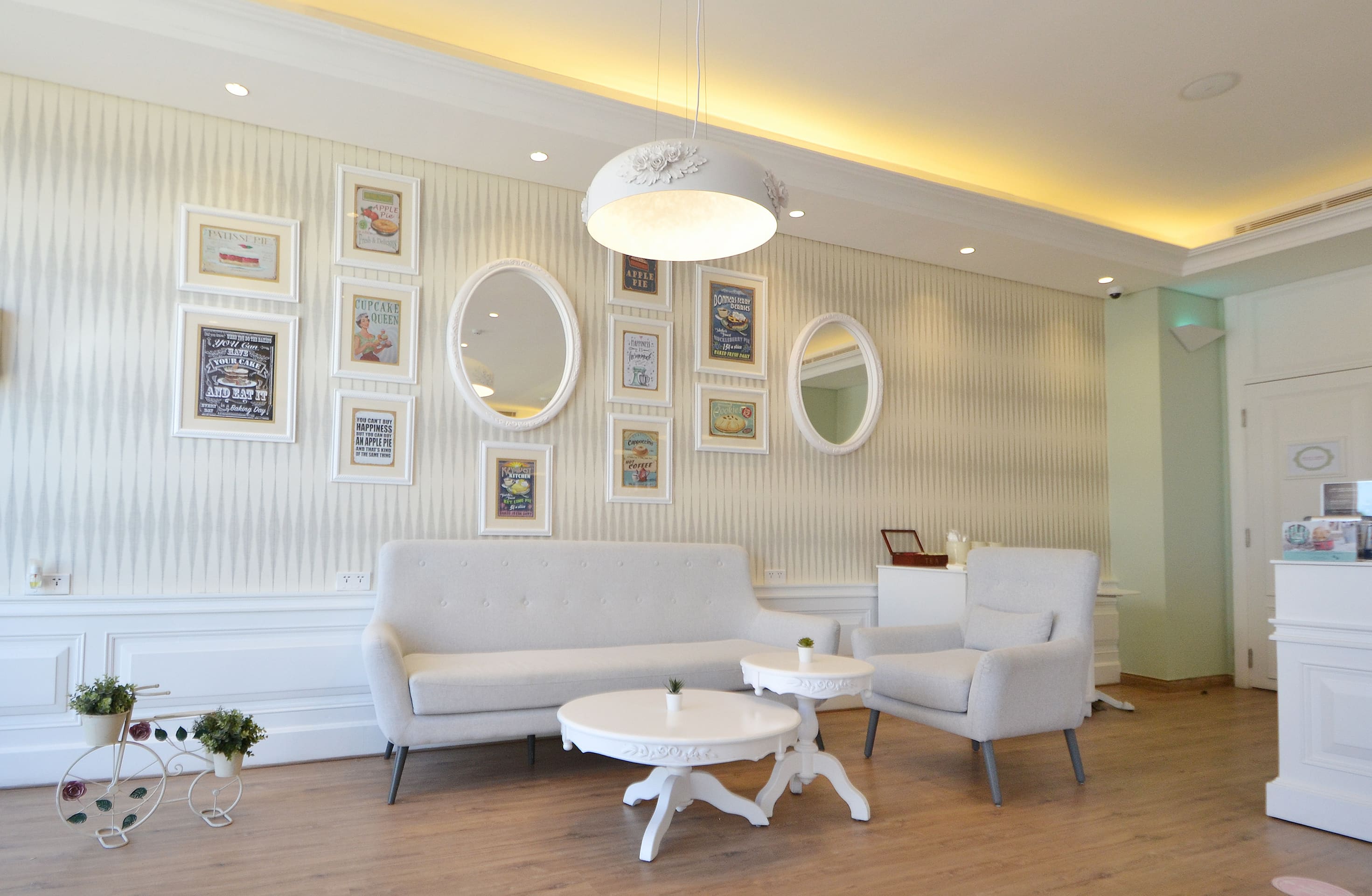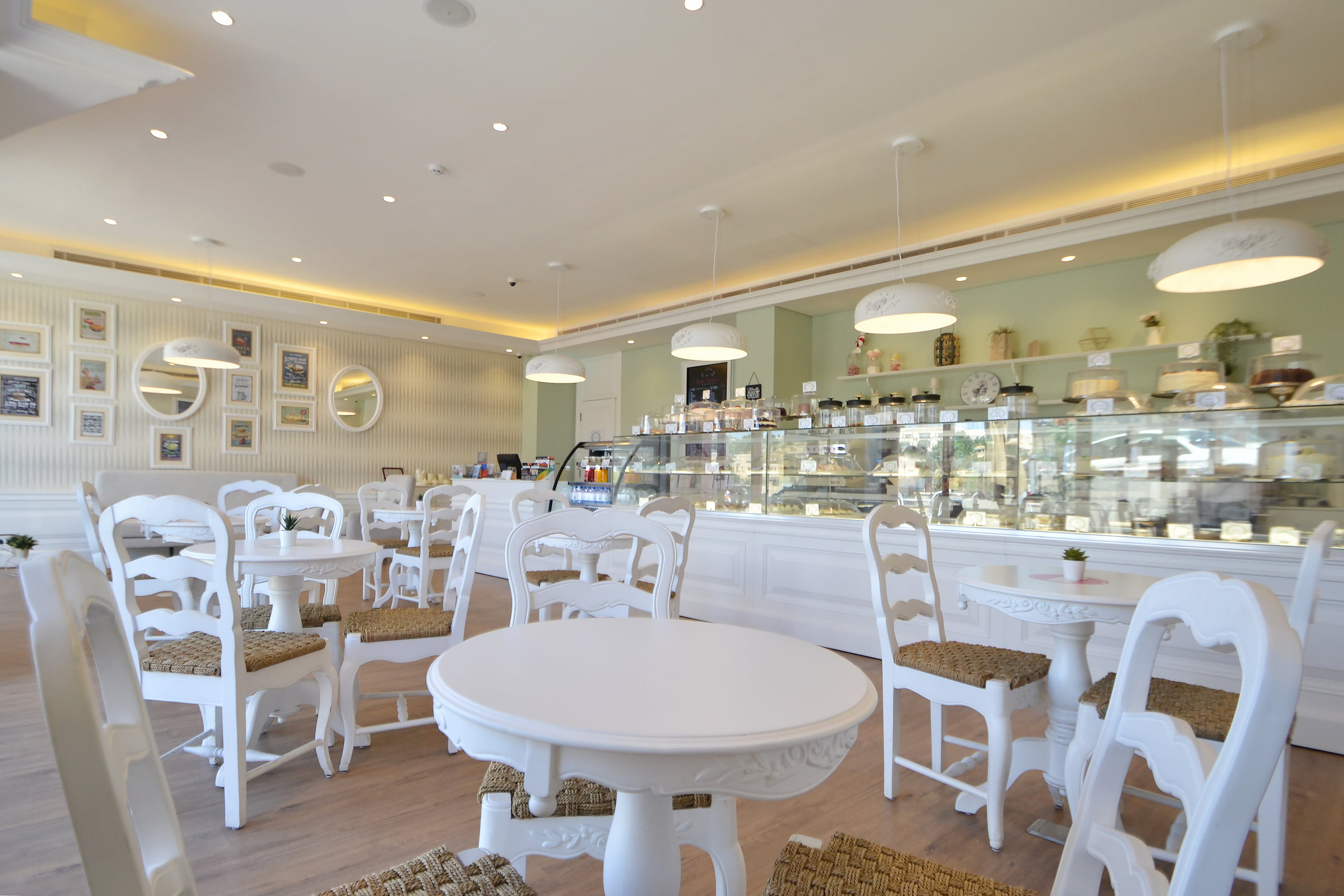 The bakery is interior walls are rendered in pistachio colors and colorful wallpaper both abstract and floral, that are also complemented with white classical frames, framing vintage bakery advertisement posters and mirrors as well as exhibiting the product of the bakery.