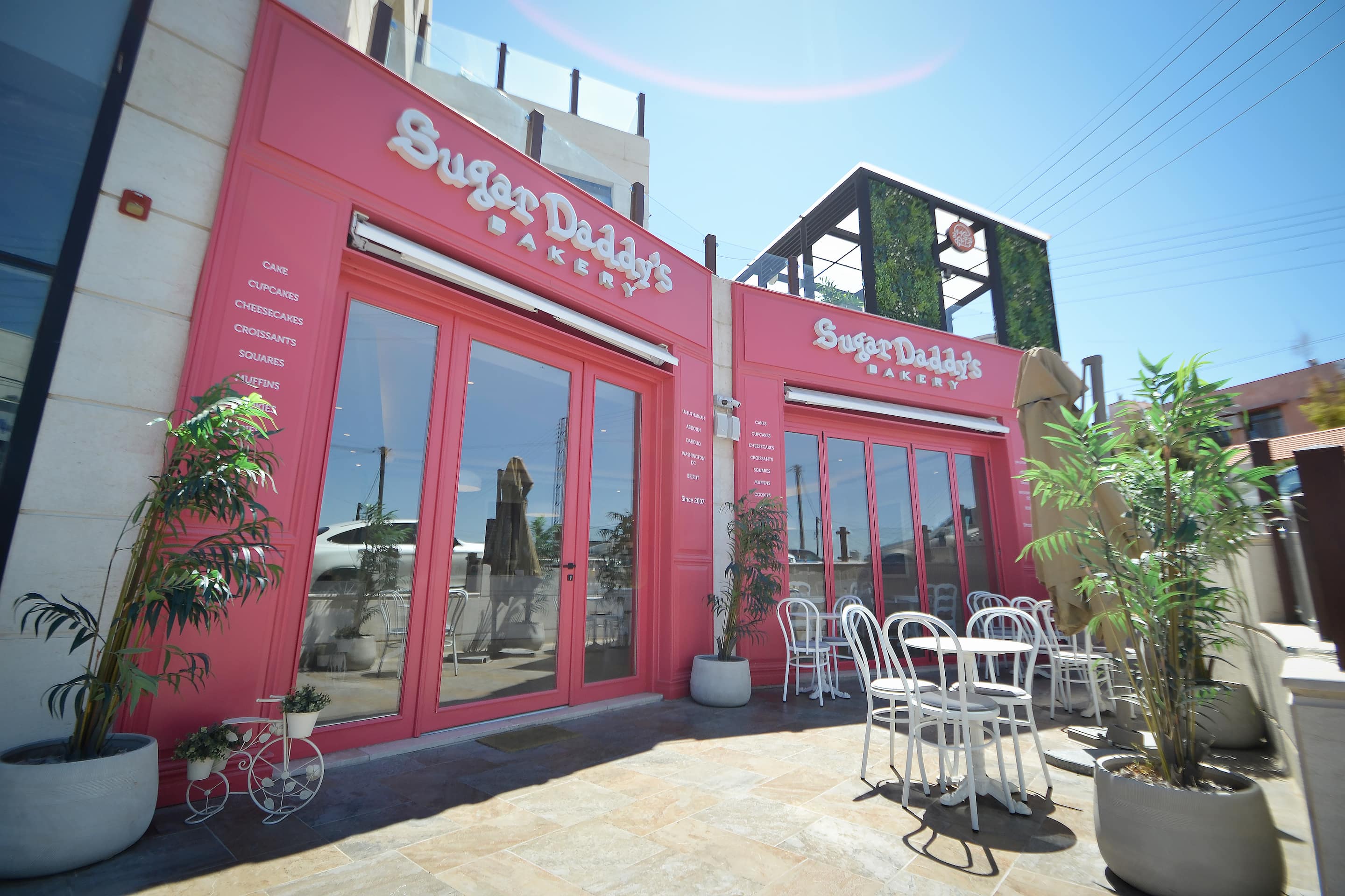 The hot pink shop front and signage, as per sugar daddy’s bakery brand, yet the shop location allowed an interesting corner condition allowing two large glass shop fronts, one dedicated for the entrance door and the other is a foldable glass window, allowing the interior seating area to expand to the terrace seamlessly.