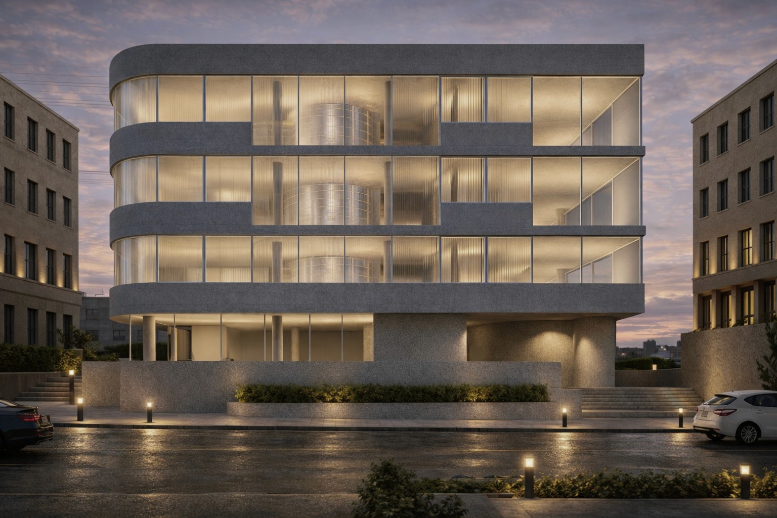 The Circle is a 3,600-square-meter commercial landmark designed as a sculptural intervention within the dense urban fabric of Amman. The project challenges the traditional "solid" typology of the city's stone-clad architecture by introducing a rhythmic play of horizontal concrete ribbons and a central, light-carved void.