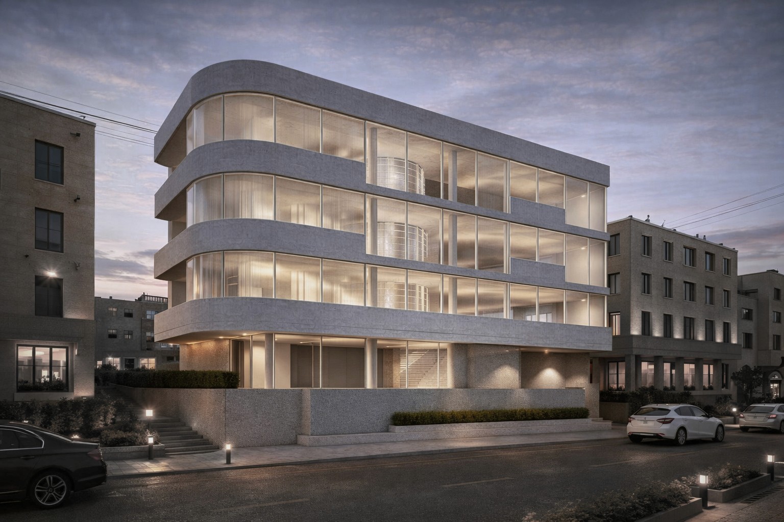 The building’s identity is defined by its deep, cantilevered concrete slabs that wrap fluidly around the perimeter. These aren't merely aesthetic; they serve as functional brise-soleil, protecting the expansive glass facades from the intense Levantine sun while creating a series of "floating" outdoor terraces. This creates a soft, curvilinear profile that breaks the rigid geometry of the surrounding streetscape, offering a sense of movement and transparency rare in commercial developments of this scale.